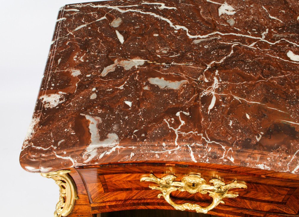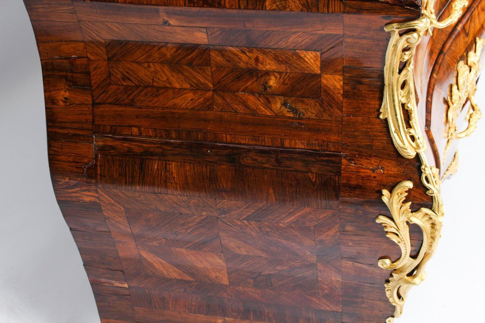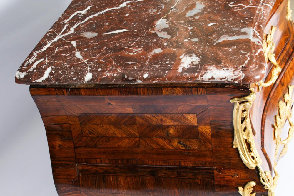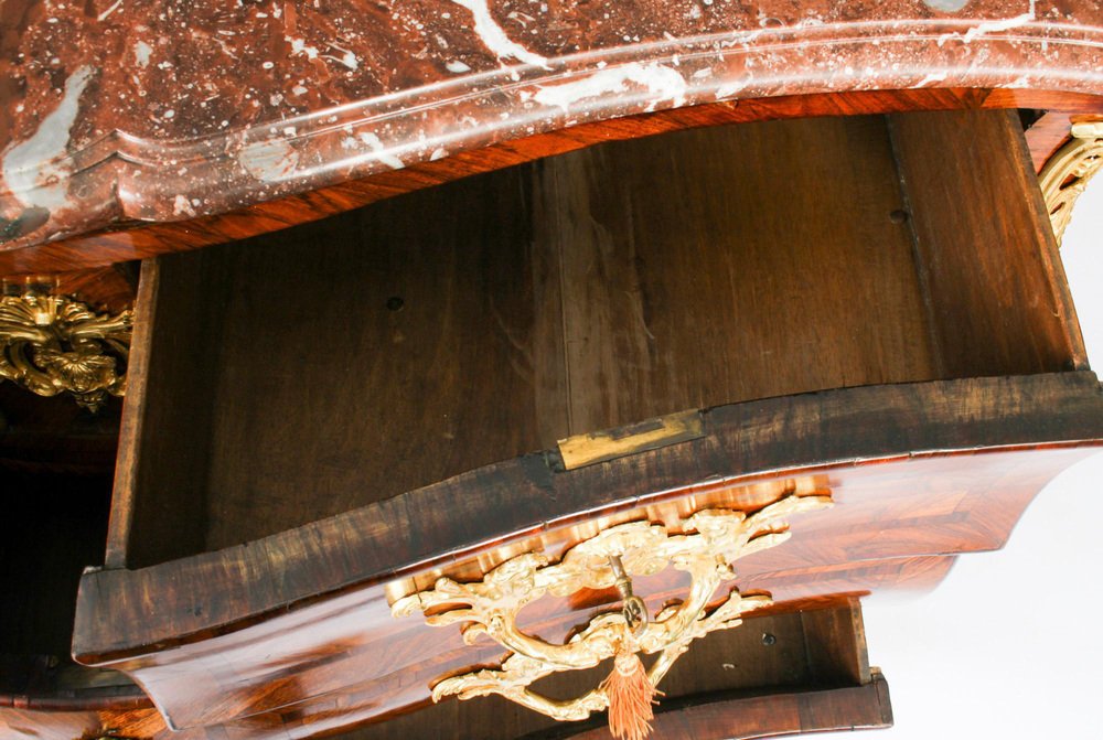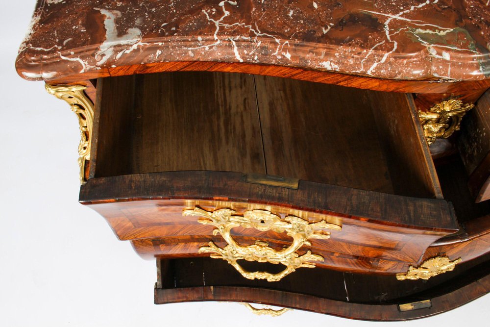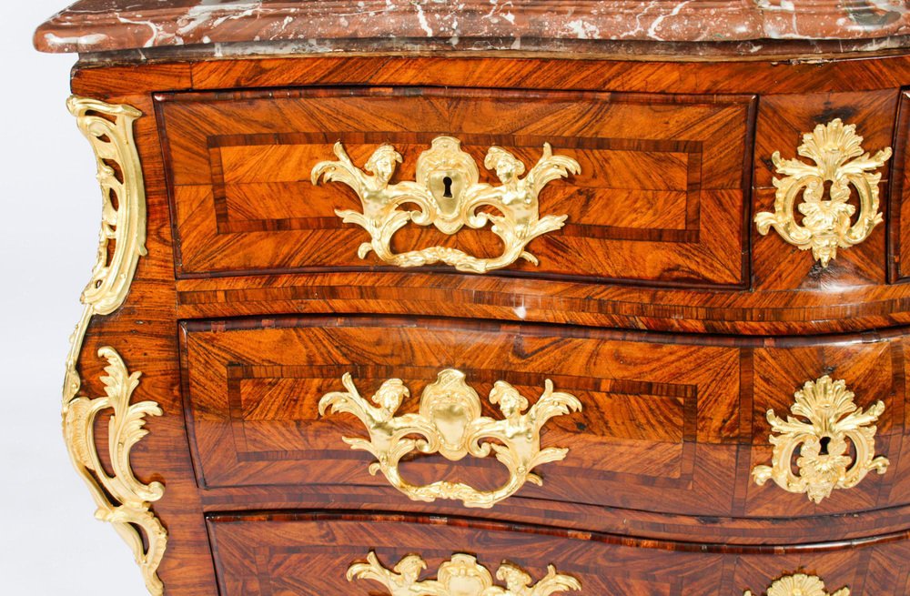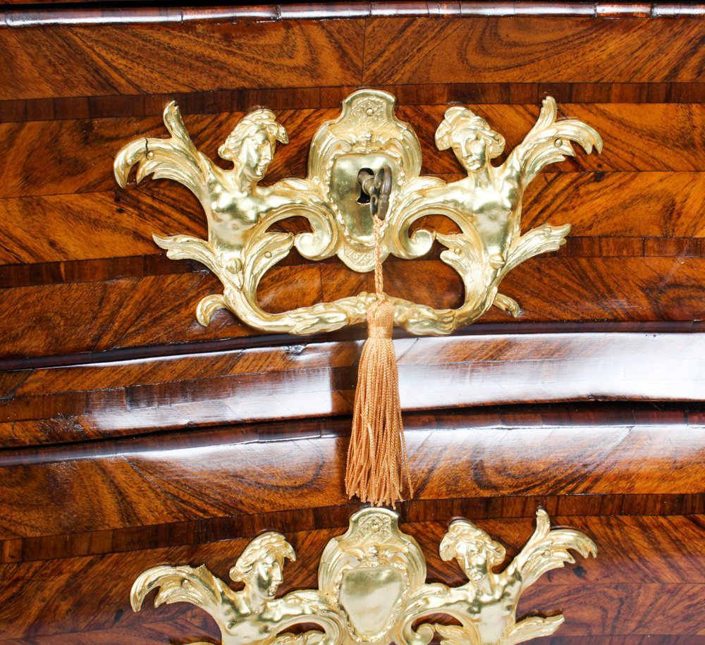 This is an impressive and rare antique french régence wood and ormolu mounted commode, circa 1720 in date. The stunning breche violette marble top over a serpentine front having two short over two full width drawers, the drawers fitted with scrolling ormolu handles with twin masque maidens. The commode with wood parquetry, superb decorative gilded bronze ormolu mounts, raised on short shaped legs and stamped 'jme and 'mm'. This is an exceptional piece of craftsmanship, a truly gorgeous piece. This commode deserves pride of place in any furniture collection and will become the central focus point in your room. Complete with original working locks and key. Condition: in excellent condition having been beautifully cleaned, french polished and waxed in our workshops, please see photos for confirmation. Dimensions in cm: height 85 x width 131 x depth 65 dimensions in inches: height 2 foot, 9 inches x width 4 foot, 4 inches x depth 2 foot, 2 inches régence style, transition in the decorative arts from the massive rectilinear forms of louis xiv furniture to those prefiguring the rococo style of louis xv. The style encompasses about the first 30 years of the 18th century, when philippe ii, duc d’orléans, was regent of france. The restraint arrived at during this period resulted from a strong reaction against the pomposity of the court under louis xiv. The evolution of the intimate petit salon as opposed to the formal, ceremonial state apartments of the past brought with it a penchant for graceful, easily movable furniture, designed to showcase the impeccable craftsmanship of the period. At versailles, where furniture had formerly represented the firmly placed hierarchy of the court, rooms were divided into smaller, more intimate spaces calling for a new style. The aristocracy made the decoration of their parisian homes a lifetime occupation. Jean berain, charles cressent, robert de cotte, and the painter antoine watteau, whose pictures were painted on the panelled salon walls to harmonize with the gentle spirit of the period, are among the important names connected with the new delicacy. Régence furniture did away with heavy, carved ornamentation and substituted flat, curving motifs—characteristically foliage and bouquets framed by flowing ribbons and bows. The intricate tracery in brass and shell marquetry on ebony was adapted to the new taste. Woods such as walnut were used as veneer. A sculptural form in the shape of a female bust, called an “espagnolette,” made its appearance as a gently curved ornamental mount for chair and table legs. The commode and writing table, both representing the new, intimate style of life, were introduced during this period. Ormolu - gilt bronze (from french 'or moulu', signifying ground or pounded gold) is an 18th-century english term for applying finely ground, high-carat gold in a mercury amalgam to an object of bronze.the mercury is driven off in a kiln leaving behind a gold-coloured veneer known as 'gilt bronze'. The manufacture of true ormolu employs a process known as mercury-gilding or fire-gilding, in which a solution of nitrate of mercury is applied to a piece of copper, brass, or bronze, followed by the application of an amalgam of gold and mercury. The item was then exposed to extreme heat until the mercury burned off and the gold remained, adhered to the metal object. After around 1830 because legislation had outlawed the use of mercury other techniques were used instead. Electroplating is the most common modern technique. Ormolu techniques are essentially the same as those used on silver, to produce silver-gilt.