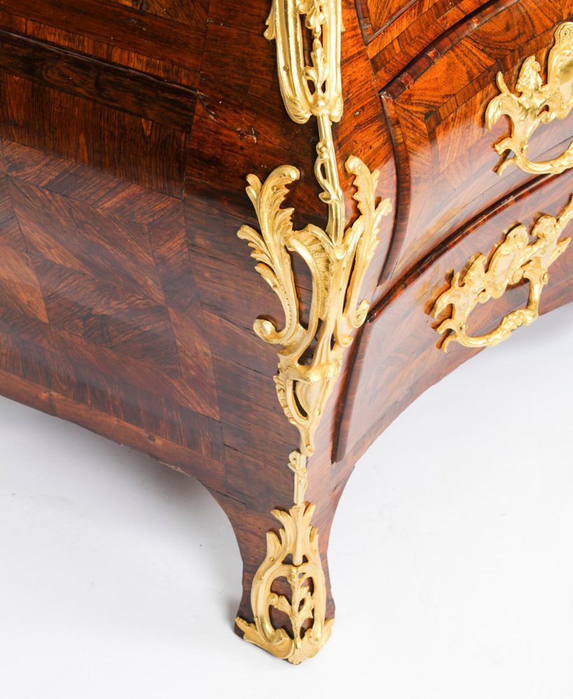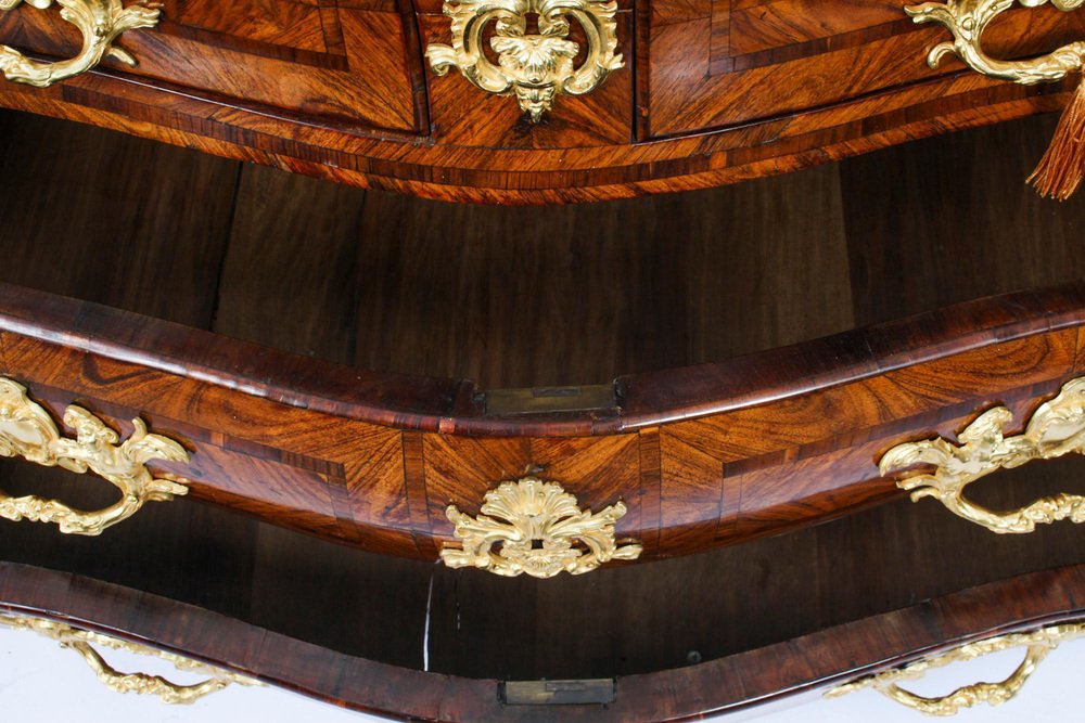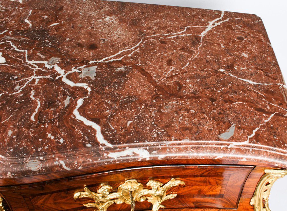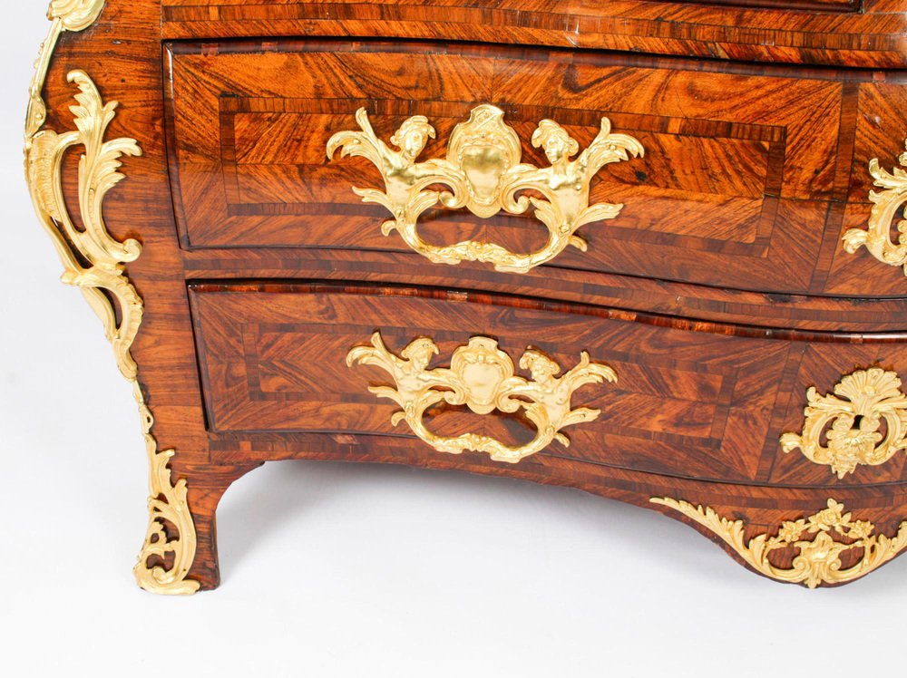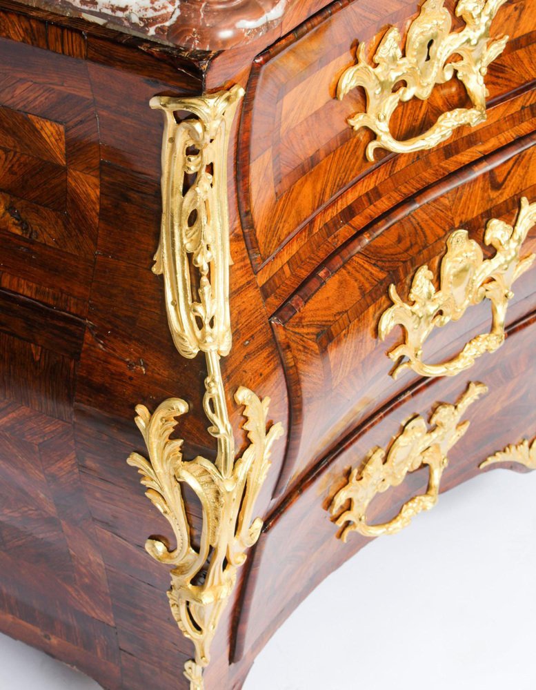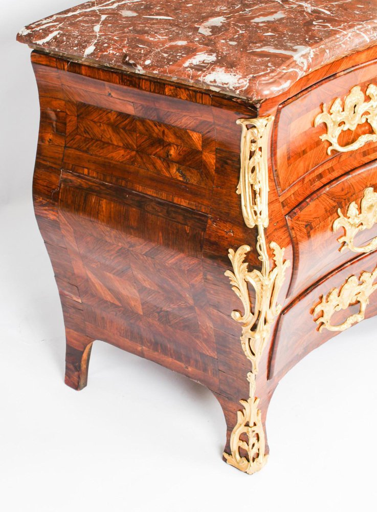 This is an impressive and rare antique french régence wood and ormolu mounted commode, circa 1720 in date. The stunning breche violette marble top over a serpentine front having two short over two full width drawers, the drawers fitted with scrolling ormolu handles with twin masque maidens. The commode with wood parquetry, superb decorative gilded bronze ormolu mounts, raised on short shaped legs and stamped 'jme and 'mm'. This is an exceptional piece of craftsmanship, a truly gorgeous piece. This commode deserves pride of place in any furniture collection and will become the central focus point in your room. Complete with original working locks and key. Condition: in excellent condition having been beautifully cleaned, french polished and waxed in our workshops, please see photos for confirmation. Dimensions in cm: height 85 x width 131 x depth 65 dimensions in inches: height 2 foot, 9 inches x width 4 foot, 4 inches x depth 2 foot, 2 inches régence style, transition in the decorative arts from the massive rectilinear forms of louis xiv furniture to those prefiguring the rococo style of louis xv. The style encompasses about the first 30 years of the 18th century, when philippe ii, duc d’orléans, was regent of france. The restraint arrived at during this period resulted from a strong reaction against the pomposity of the court under louis xiv. The evolution of the intimate petit salon as opposed to the formal, ceremonial state apartments of the past brought with it a penchant for graceful, easily movable furniture, designed to showcase the impeccable craftsmanship of the period. At versailles, where furniture had formerly represented the firmly placed hierarchy of the court, rooms were divided into smaller, more intimate spaces calling for a new style. The aristocracy made the decoration of their parisian homes a lifetime occupation. Jean berain, charles cressent, robert de cotte, and the painter antoine watteau, whose pictures were painted on the panelled salon walls to harmonize with the gentle spirit of the period, are among the important names connected with the new delicacy. Régence furniture did away with heavy, carved ornamentation and substituted flat, curving motifs—characteristically foliage and bouquets framed by flowing ribbons and bows. The intricate tracery in brass and shell marquetry on ebony was adapted to the new taste. Woods such as walnut were used as veneer. A sculptural form in the shape of a female bust, called an “espagnolette,” made its appearance as a gently curved ornamental mount for chair and table legs. The commode and writing table, both representing the new, intimate style of life, were introduced during this period. Ormolu - gilt bronze (from french 'or moulu', signifying ground or pounded gold) is an 18th-century english term for applying finely ground, high-carat gold in a mercury amalgam to an object of bronze.the mercury is driven off in a kiln leaving behind a gold-coloured veneer known as 'gilt bronze'. The manufacture of true ormolu employs a process known as mercury-gilding or fire-gilding, in which a solution of nitrate of mercury is applied to a piece of copper, brass, or bronze, followed by the application of an amalgam of gold and mercury. The item was then exposed to extreme heat until the mercury burned off and the gold remained, adhered to the metal object. After around 1830 because legislation had outlawed the use of mercury other techniques were used instead. Electroplating is the most common modern technique. Ormolu techniques are essentially the same as those used on silver, to produce silver-gilt.
