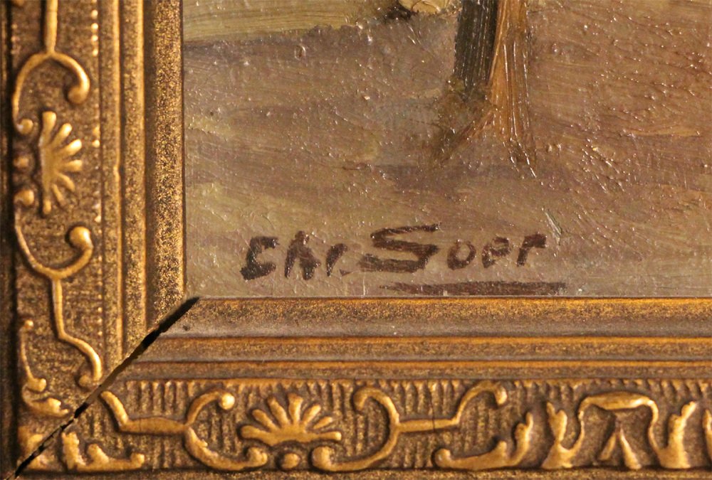 The painting is signed by the artist "Chr. Soer" in the bottom left corner and comes with its original frame, adding to its authenticity and charm. It is in good condition, considering its age.