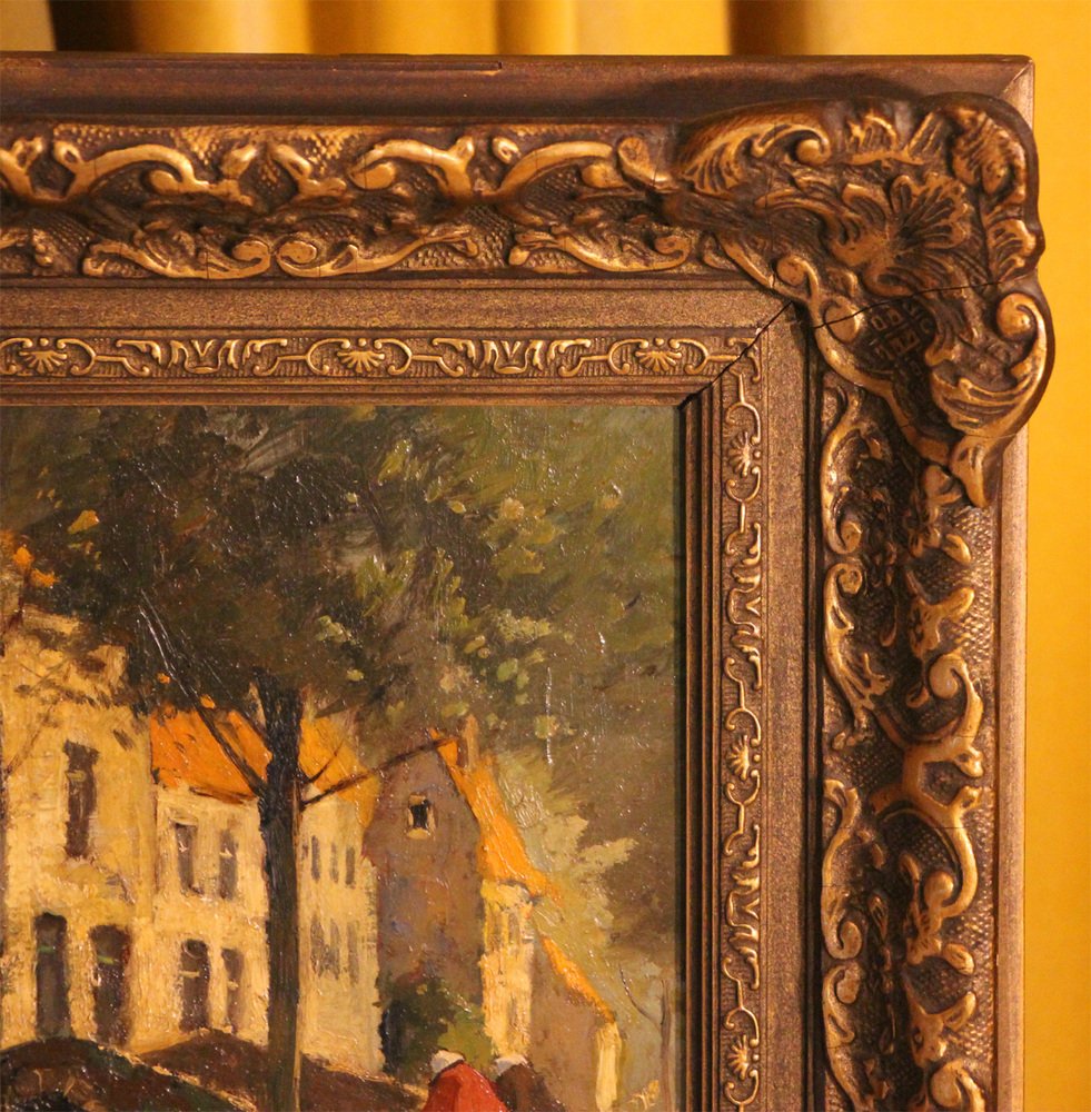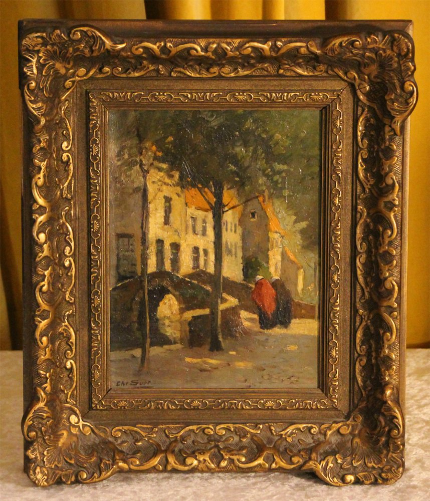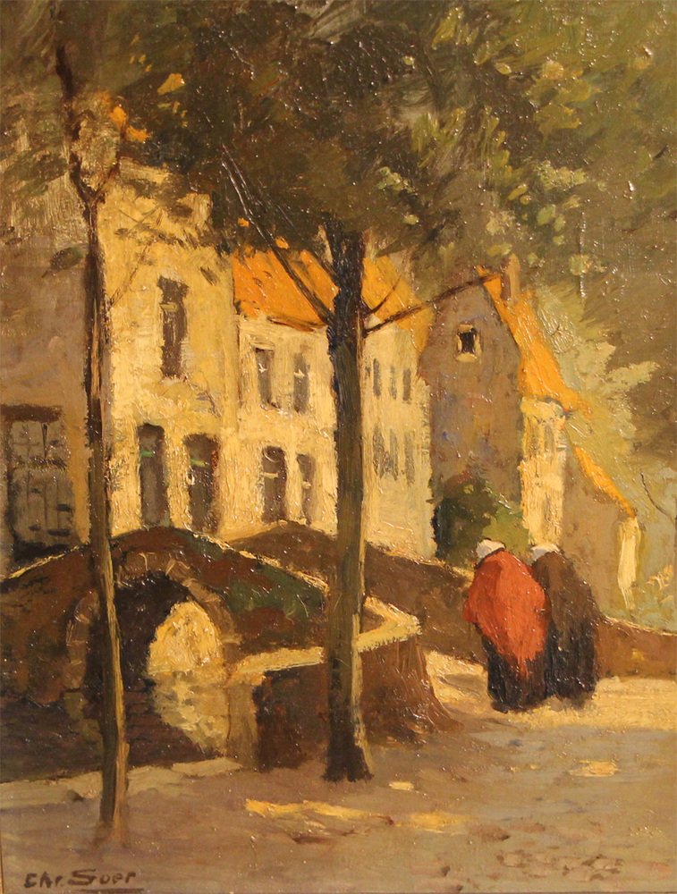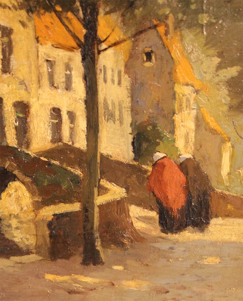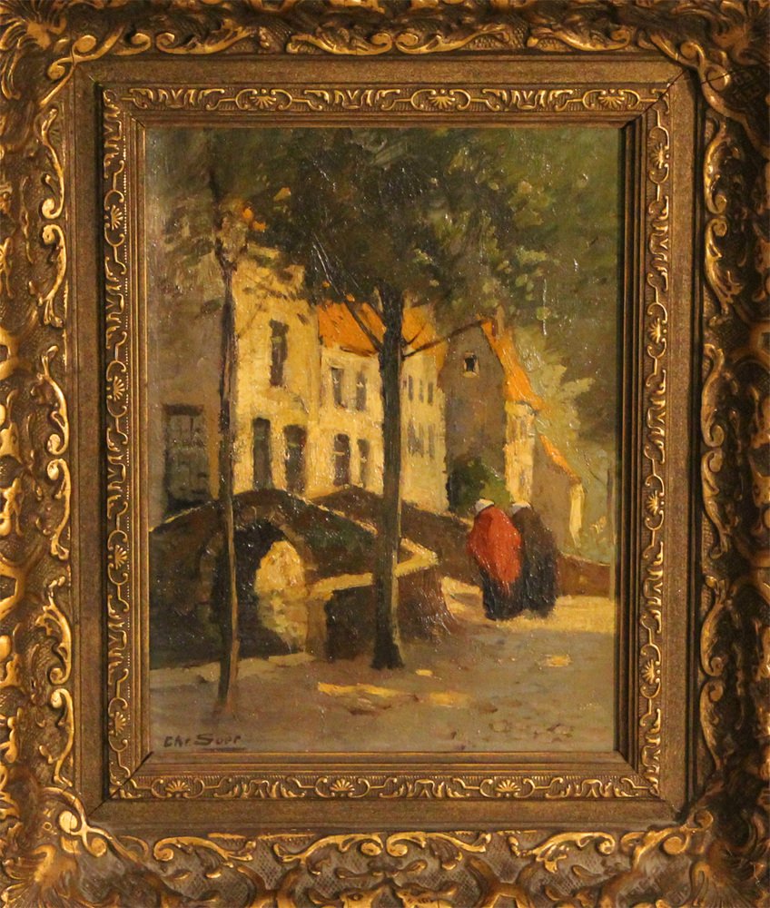 This original oil painting by the Dutch artist Christiaan Soer offers a charming glimpse into a Dutch town scene featuring a medieval bridge. Two women's figures, depicted in motion towards the bridge, add a sense of life and movement to the scene. Soer's adept painting technique, characterized by bright colors and attention to detail, brings the quaint village setting to life.