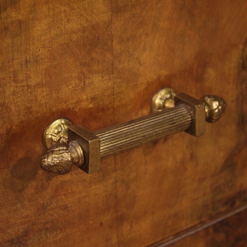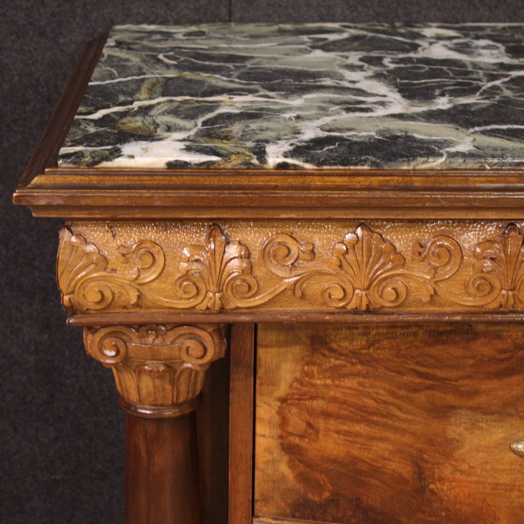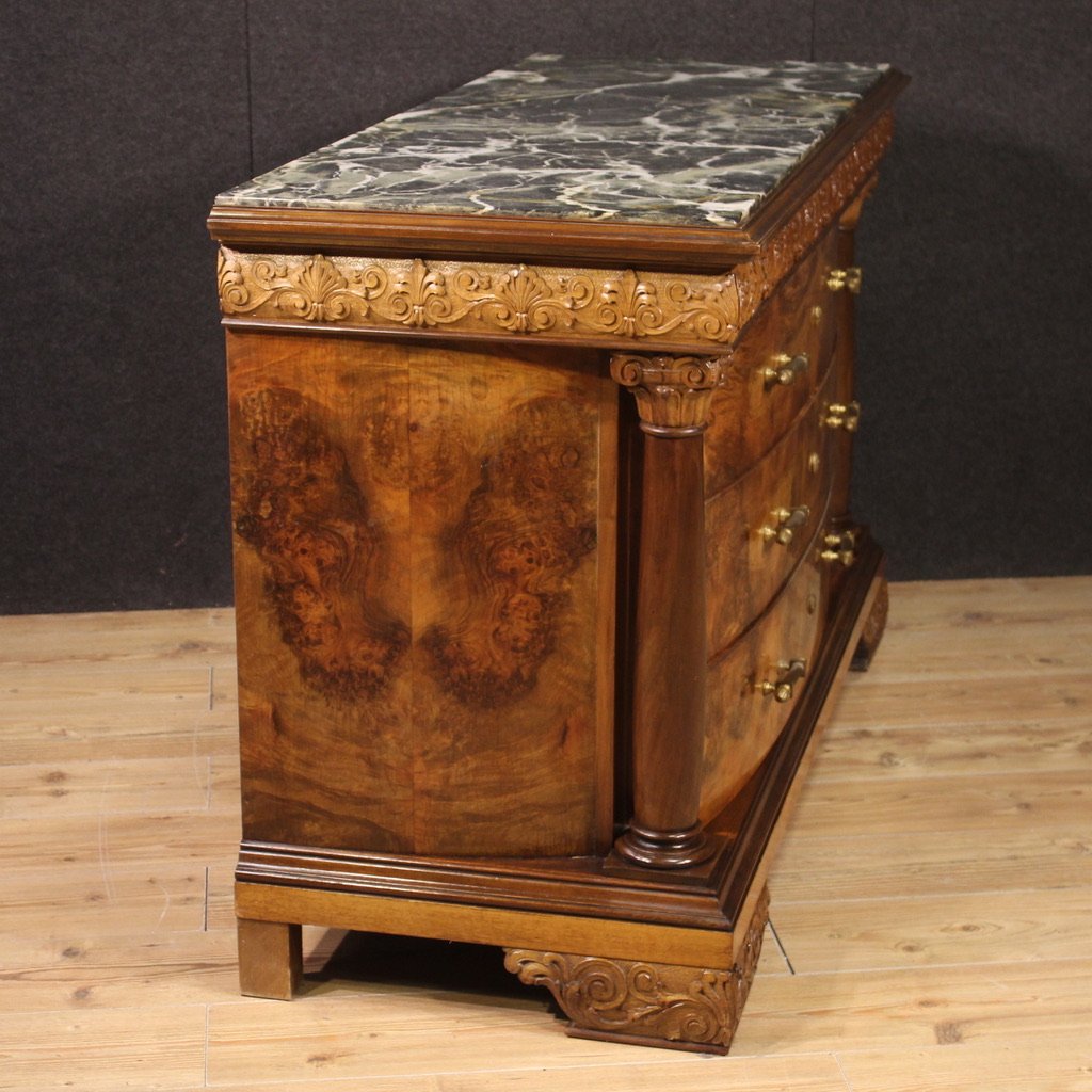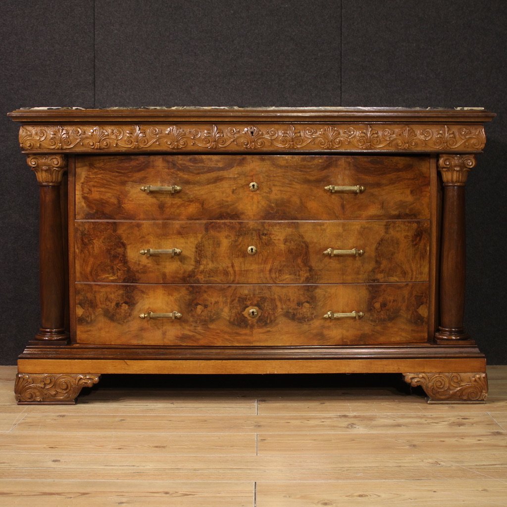 Italian chest of drawers from the mid-20th century. Cantù production furniture carved and veneered in walnut, burl, beech, mahogany and fruitwood in Empire style. Commode with four large drawers and original marble top of excellent size and service. Dresser adorned with lateral columns with carved capitals and handles in gilded and chiselled metal (see photo). Furniture that is part of a set with two bedside tables (see photo and request the bulk price, if available). Chest of drawers ideal for placing in a bedroom or living room, with a strong visual impact and great pleasure, for antique dealers and interior designers. In good condition.