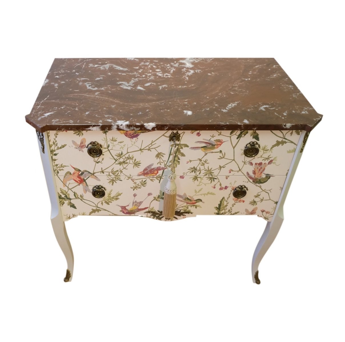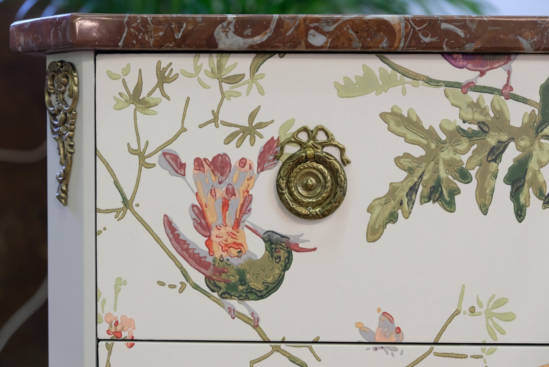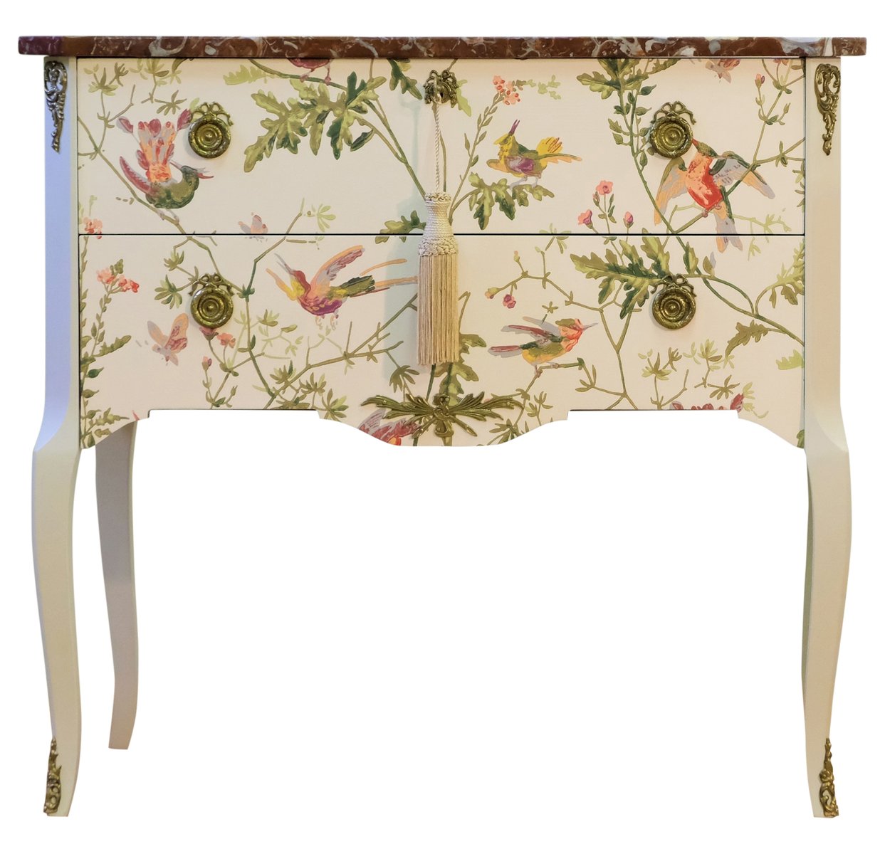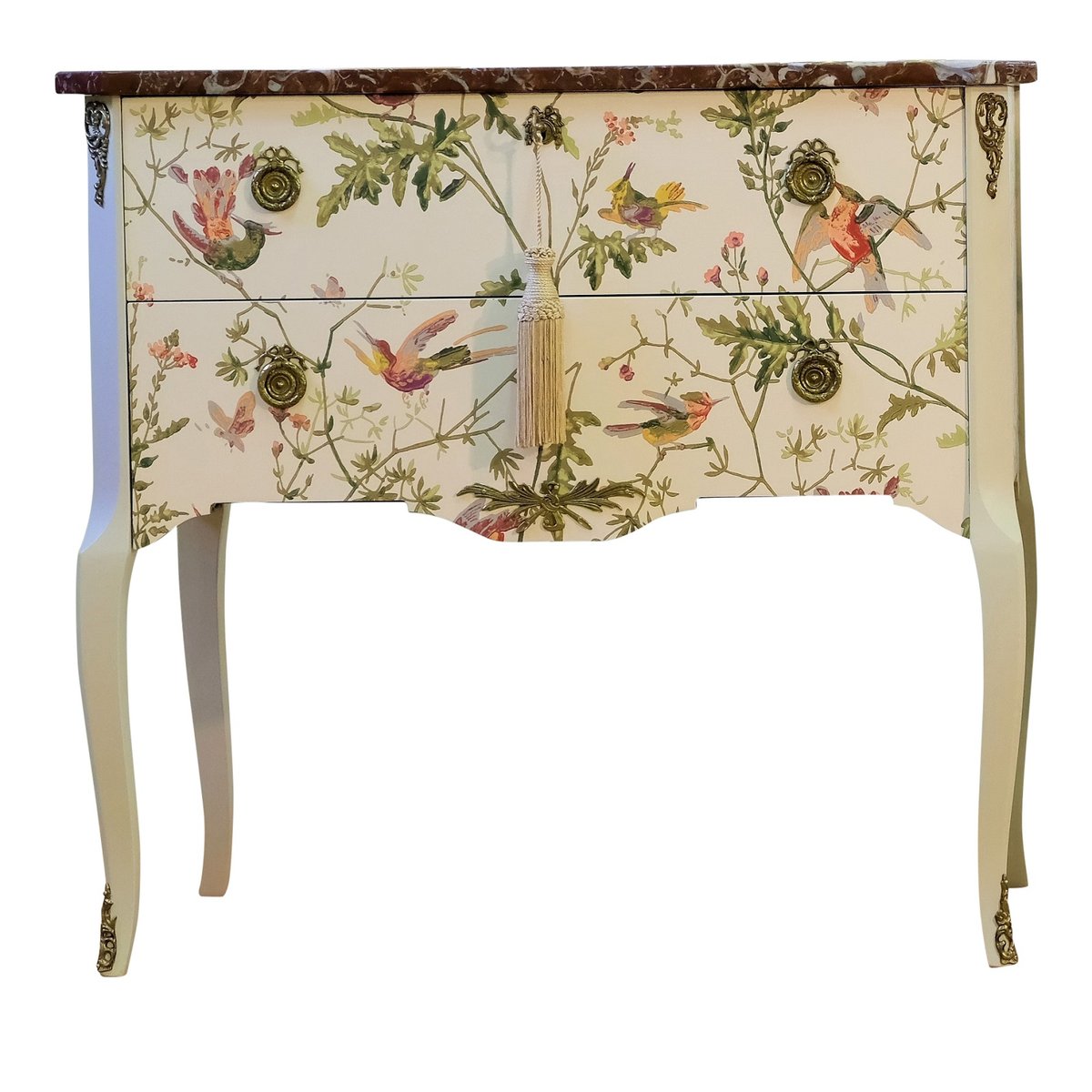 Comò in stile gustaviano color crema con motivo a colibrì, anni '50