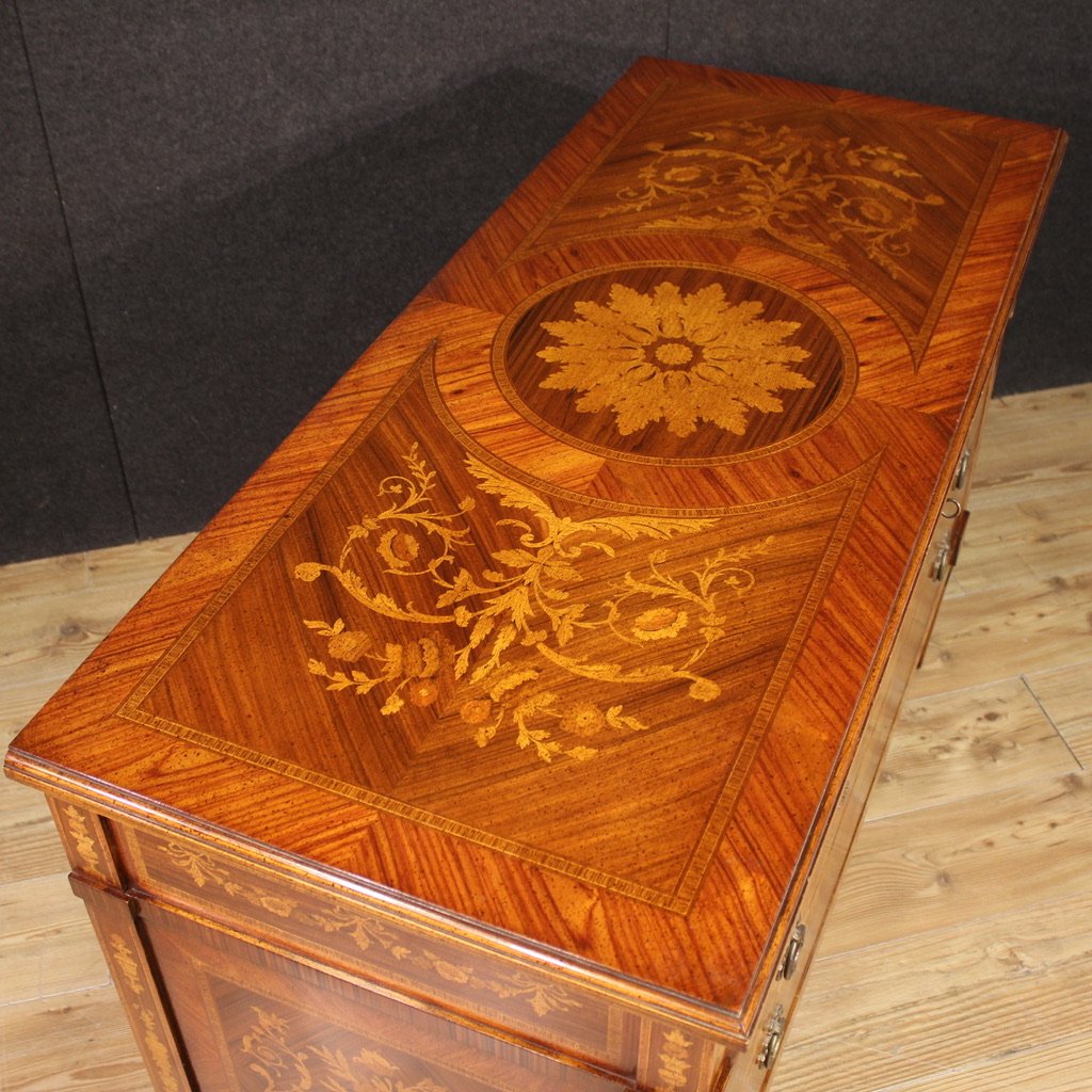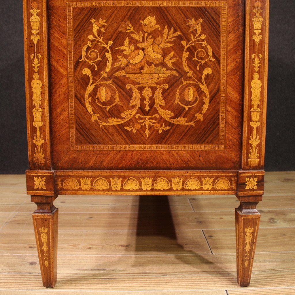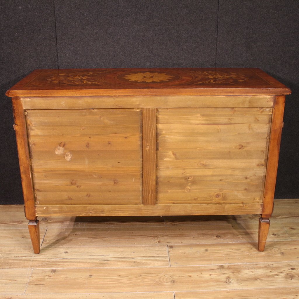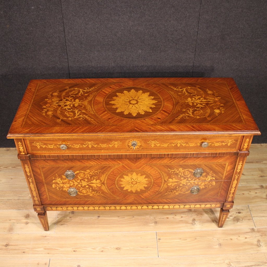 Cassettone italiano della seconda metà del XX secolo. Un pezzo in stile Luigi XVI, riccamente impiallacciato e intarsiato in noce, palissandro, acero e legno di frutta di alta qualità. Il cassettone è dotato di tre ampi cassetti e di un piano in legno, anch'esso intarsiato con una rosetta centrale, che orna il fronte dei due cassetti inferiori.