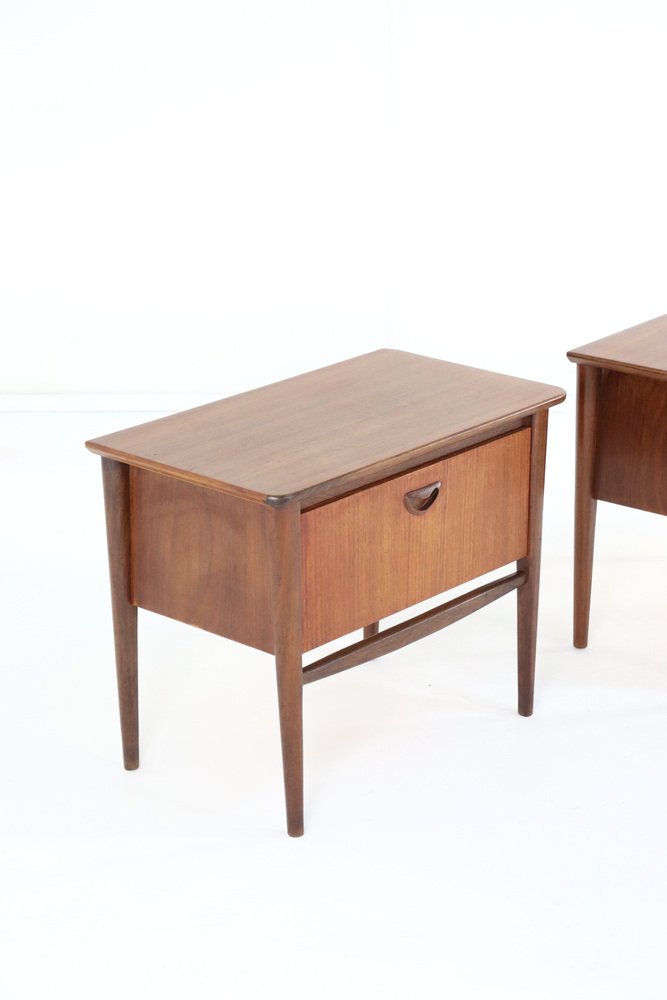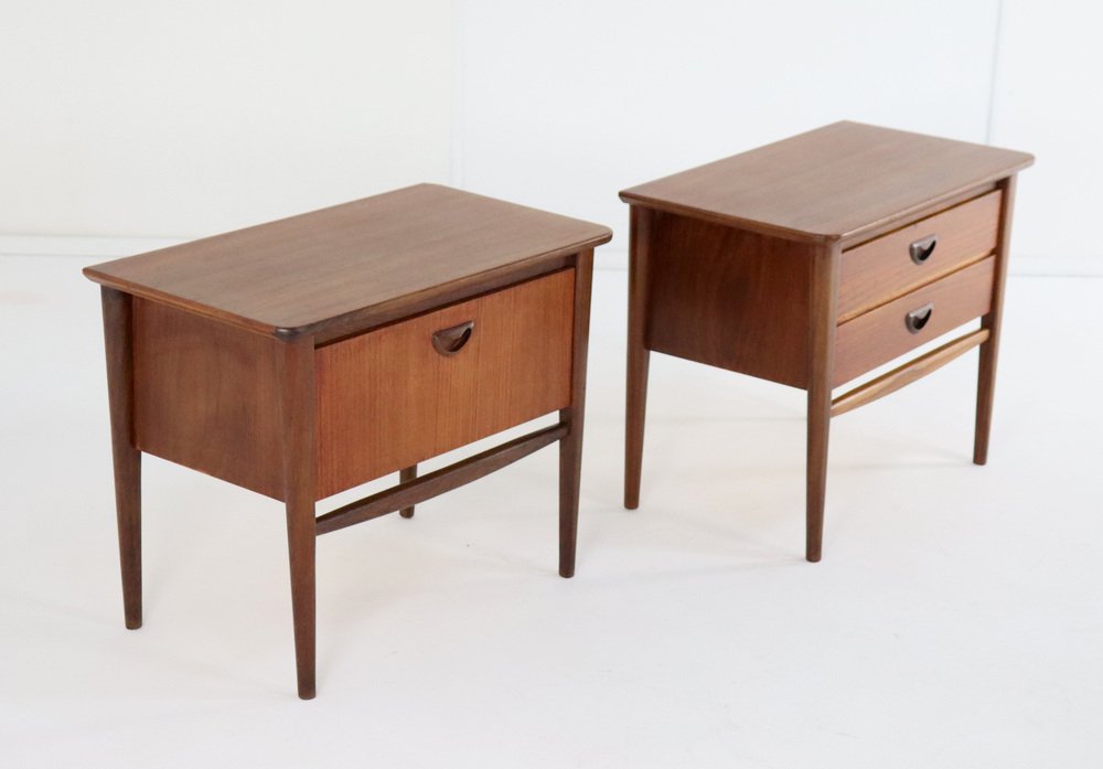 2 beautiful teak wooden bedside tables. Designed by top designer Louis van Teeffelen for furniture factory Walraven and Bevers / WéBé. Mentioned in the brochure of 1962, belonging to the Kastrup series. The furniture from this manufacturer is now sought after worldwide and is highly sought after, the designs made by Louis van Teeffelen are widely praised and highly appreciated. It makes these 2 bedside tables real enthusiasts' objects, true collectors' items even! The finish and choice of materials are sublime, the details phenomenally beautiful and the condition is neat. Restored in the past and now immediately usable again, very attractive specimens with their own unique patina. The photos give a broad impression of both cabinets, 1 of which is equipped with drawers and 1 with a flap. Country of origin: Netherlands Manufacturer: Wébé Designer: Louis van Teeffelen Height: 48 cm Width: 60 cm Depth: 34 cm