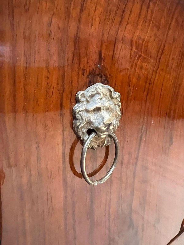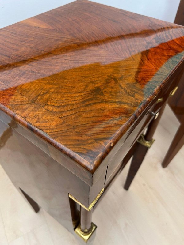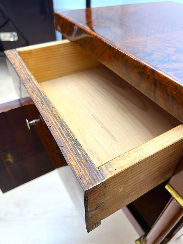 Noce, impiallacciato su legno dolce e noce massiccio. Due colonne massicce con capitelli e basi in foglia d'oro. Un'anta ciascuna nella parte inferiore con ferramenta originale in ottone con testa di leone e anello. Un cassetto ciascuno nella parte superiore con pomello in ottone.