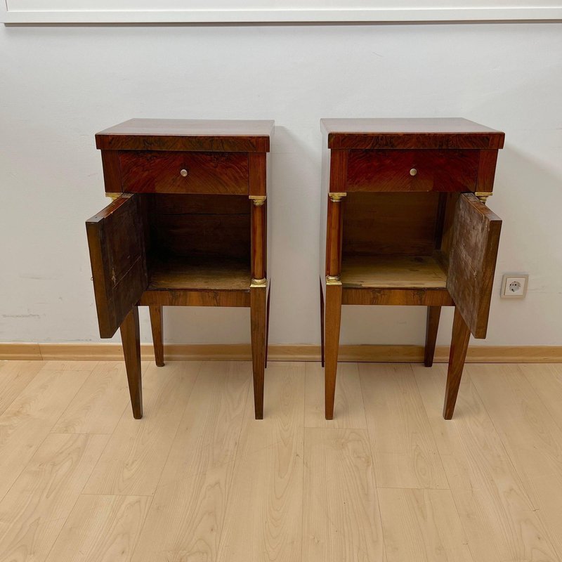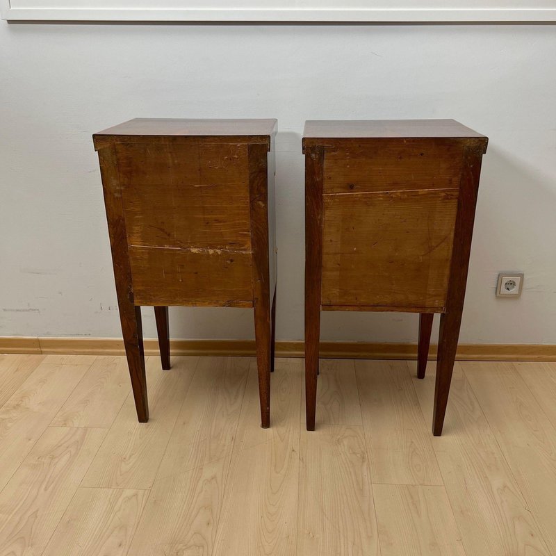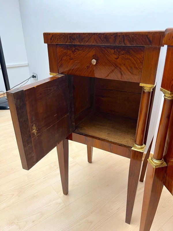 Beautiful, neoclassical and greatly restored Pair of Venetian Empire Nightstands, bedside tables or pillar cabinets from northern Italy, circa 1810.