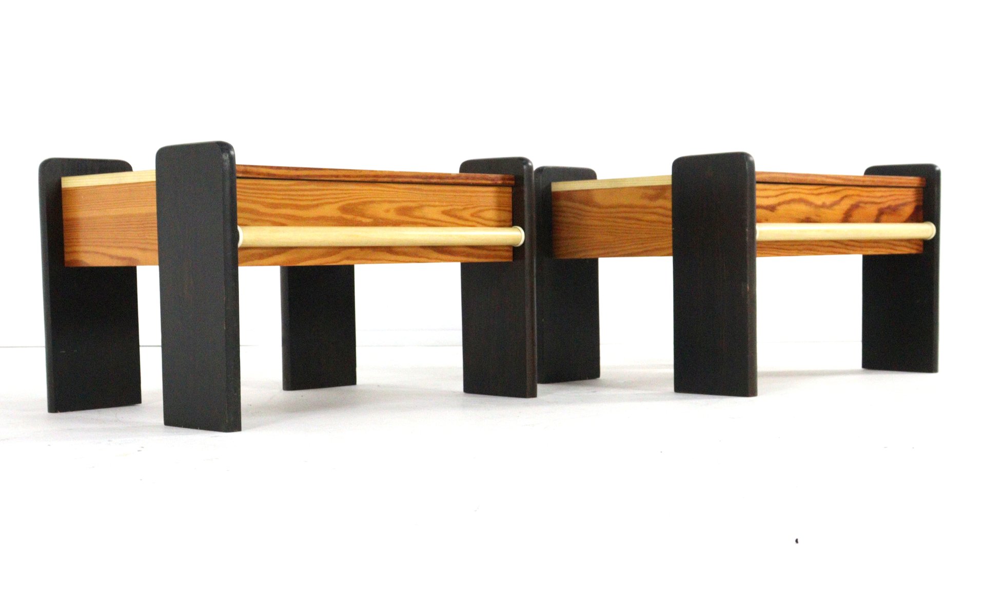 Set di comodini vintage - anni '70 circa Elegante set di comodini vintage rifiniti in legno caldo con una bella venatura a vista. I mobili poggiano su gambe architettoniche laccate nere a contrasto che conferiscono al design un carattere potente e grafico. La maniglia orizzontale sul frontale funge da sottile dettaglio funzionale e valorizza le linee pulite dell'insieme. Il design è indicativo dell'interior design modernista degli anni '70, in cui le forme chiare e il contrasto dei materiali sono centrali. La combinazione di legno caldo e accenti neri crea un look senza tempo che oggi si adatta senza problemi agli interni moderni, di metà secolo ed eclettici. Grazie alle dimensioni contenute e al design solido, questi mobiletti non sono solo adatti come comodini, ma anche eccellenti come tavolini accanto a un divano o a una poltrona, o come funzionali pezzi d'accento in una camera da letto, un salotto o una hall d'albergo. Condizioni: vintage, in condizioni ordinate e discrete con leggeri segni d'uso adeguati all'età Periodo: circa anni '70 Materiale: legno, legno laccato nero Vendita: come set Un set di carattere e versatile con un valore estetico duraturo.