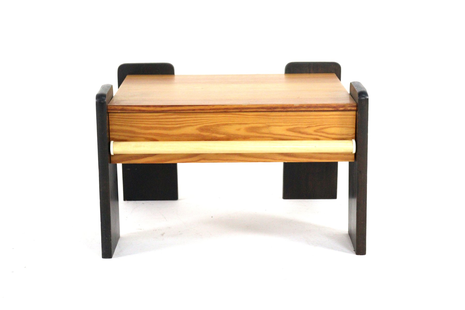 Set vintage nachtkastjes – ca. jaren 70 Stijlvolle set vintage nachtkastjes uitgevoerd in warm hout met een mooie, zichtbare nerfstructuur. De kastjes staan op contrasterende zwart gelakte, architectonische poten die het ontwerp een krachtig en grafisch karakter geven. De horizontale greep aan de voorzijde fungeert als subtiel functioneel detail en versterkt de strakke belijning van het geheel. Het ontwerp is kenmerkend voor het modernistische interieurdesign uit de jaren zeventig, waarin heldere vormen en materiaalcontrast centraal staan. De combinatie van warm hout en zwarte accenten zorgt voor een tijdloze uitstraling die vandaag de dag moeiteloos aansluit bij zowel moderne als mid-century en eclectische interieurs. Dankzij hun fijne formaat en solide uitvoering zijn deze kastjes niet alleen geschikt als nachtkastjes, maar ook uitstekend inzetbaar als bijzettafels naast een bank of fauteuil, of als functionele accentstukken in een slaapkamer, lounge of hotellobby. Conditie: vintage, in nette en eerlijke staat met lichte gebruikssporen passend bij de leeftijd Periode: circa jaren 70 Materiaal: hout, zwart gelakt hout Verkoop: als set Een karaktervolle en veelzijdige set met blijvende esthetische waarde.