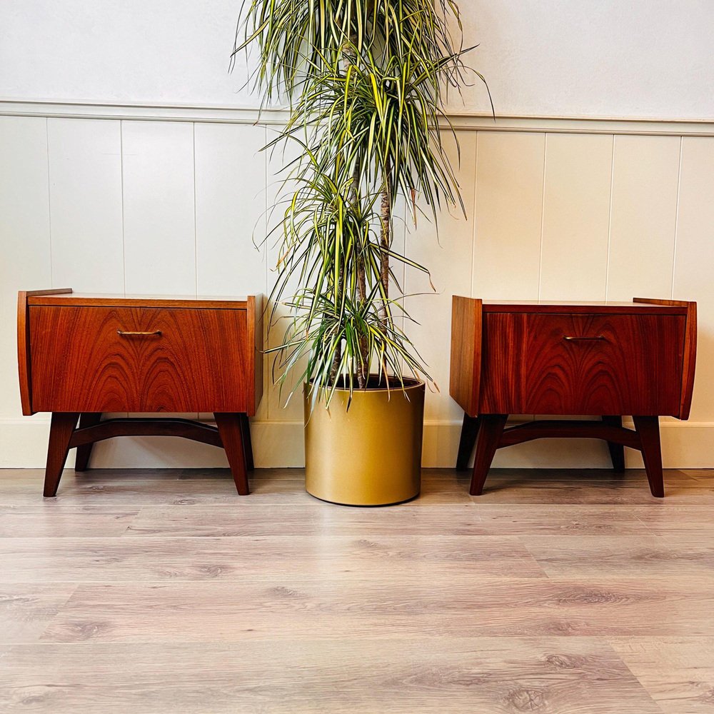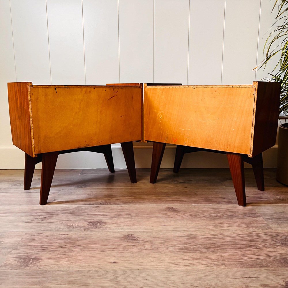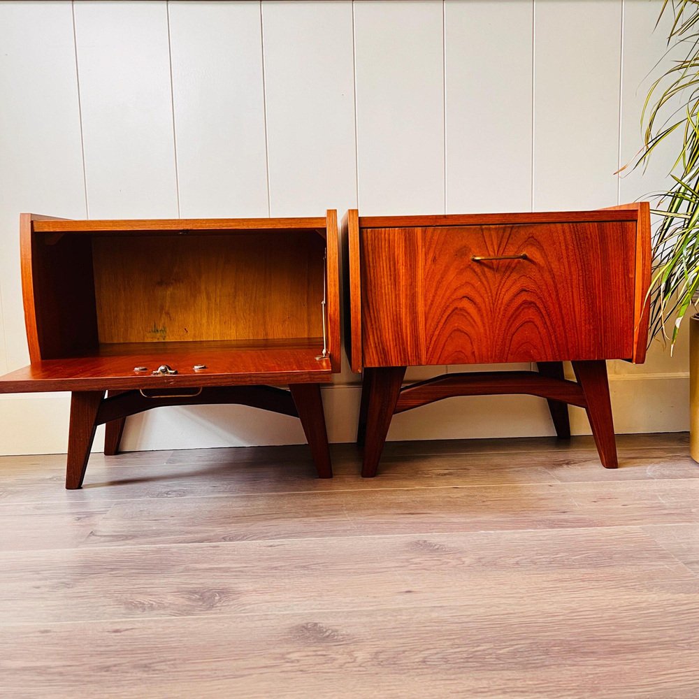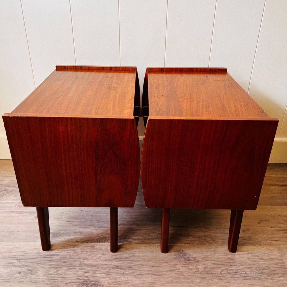 Vintage Retro Cabinets Scandinavian Design, Vintage Pair Nightstands, Side Tables, Couple Bedside Tables, End Tables, Mid-Century Cabinets. These beautiful retro cabinets from the 1960s, it is in good vintage condition, however, the wood will show traces of age and usage, with a lovely patina. See the photos for full details and the of any imperfections. Measures: 44 cm / 17.3 inches tall, 48 cm / 18.8 inches width, 29 cm / 11.4 inches depth.