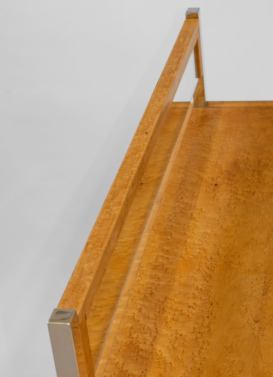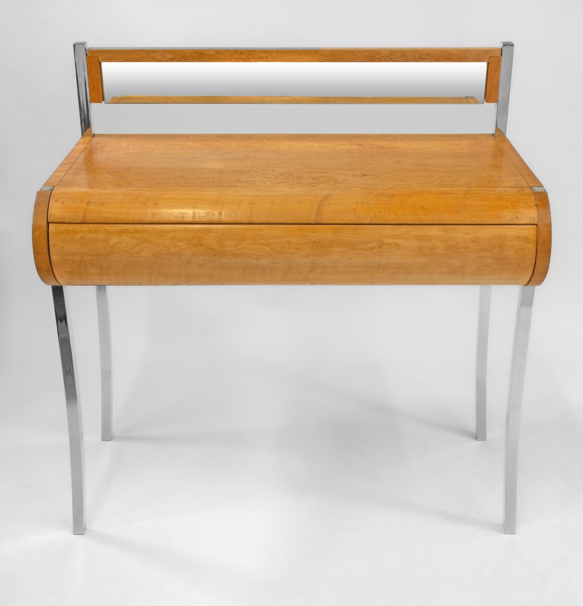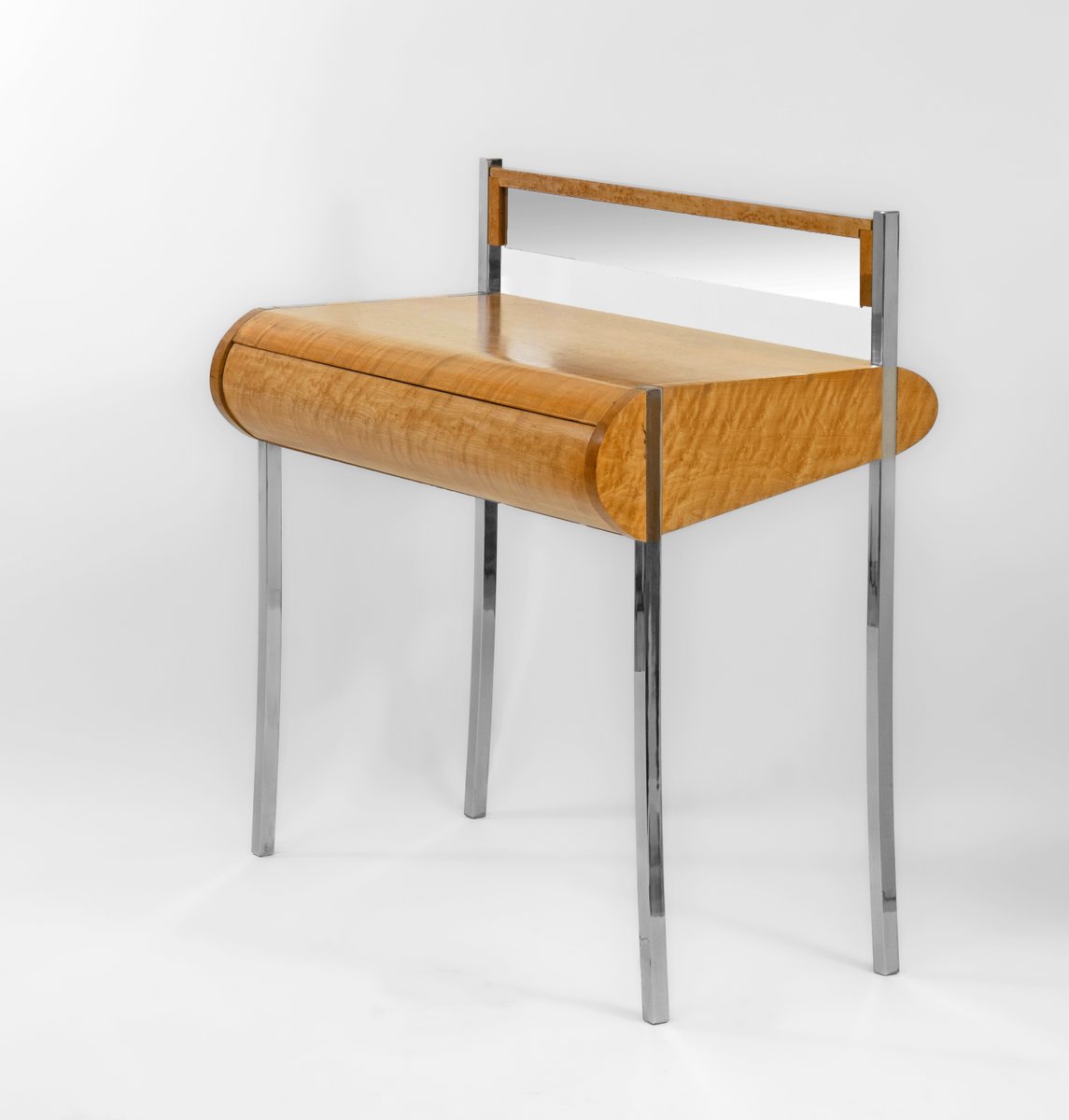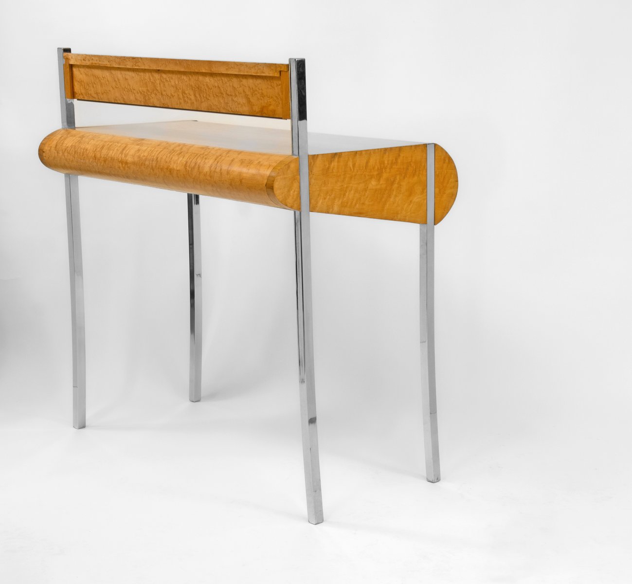 A fabulous bird's eye maple console table/desk, with drawer, standing on splayed chrome legs and small mirror back upright. Circa 1980s. Possibly Italian.
