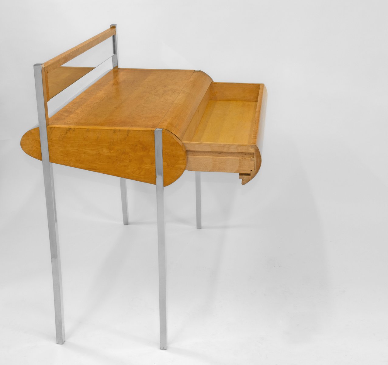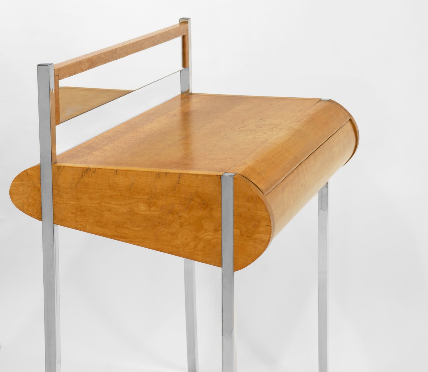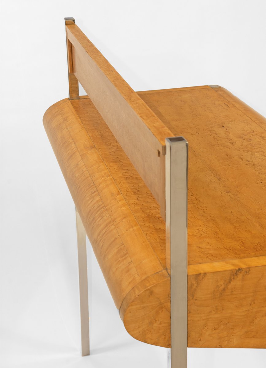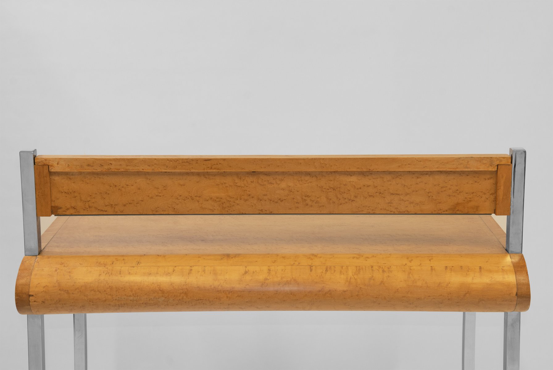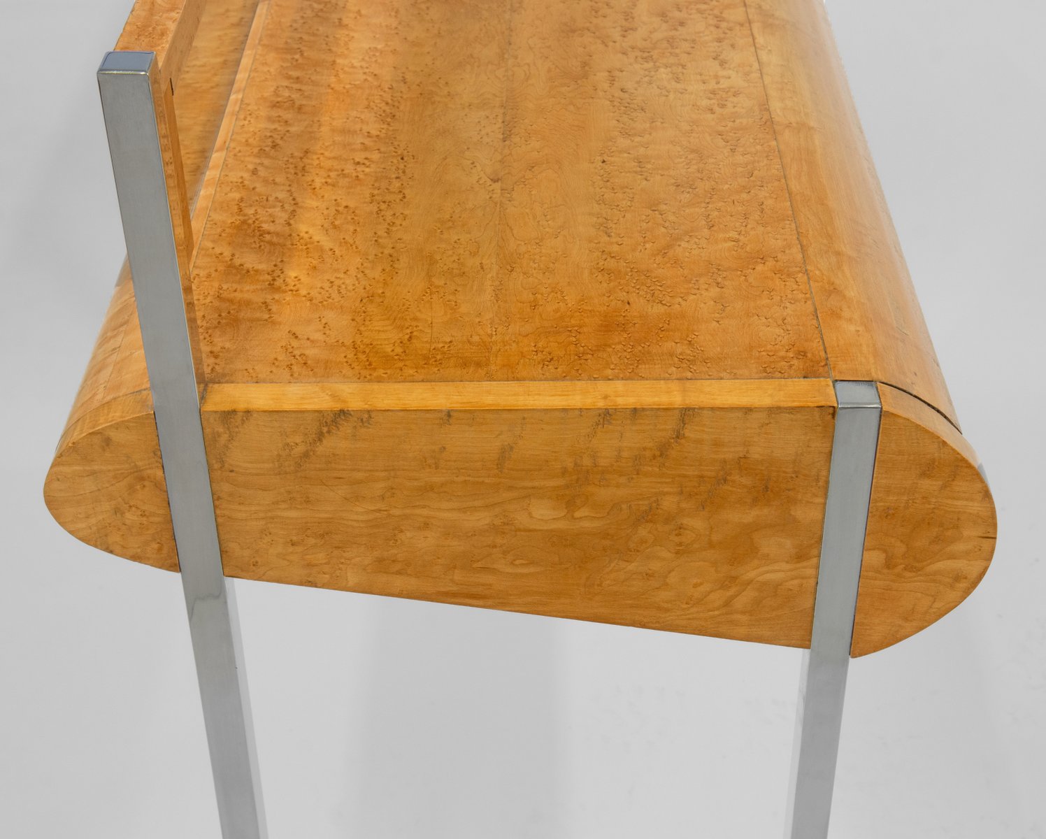 Favolosa consolle/scrivania in acero a occhio di uccello, con cassetto, su gambe cromate strombate e montante posteriore a specchio. Circa anni '80. Forse italiano.