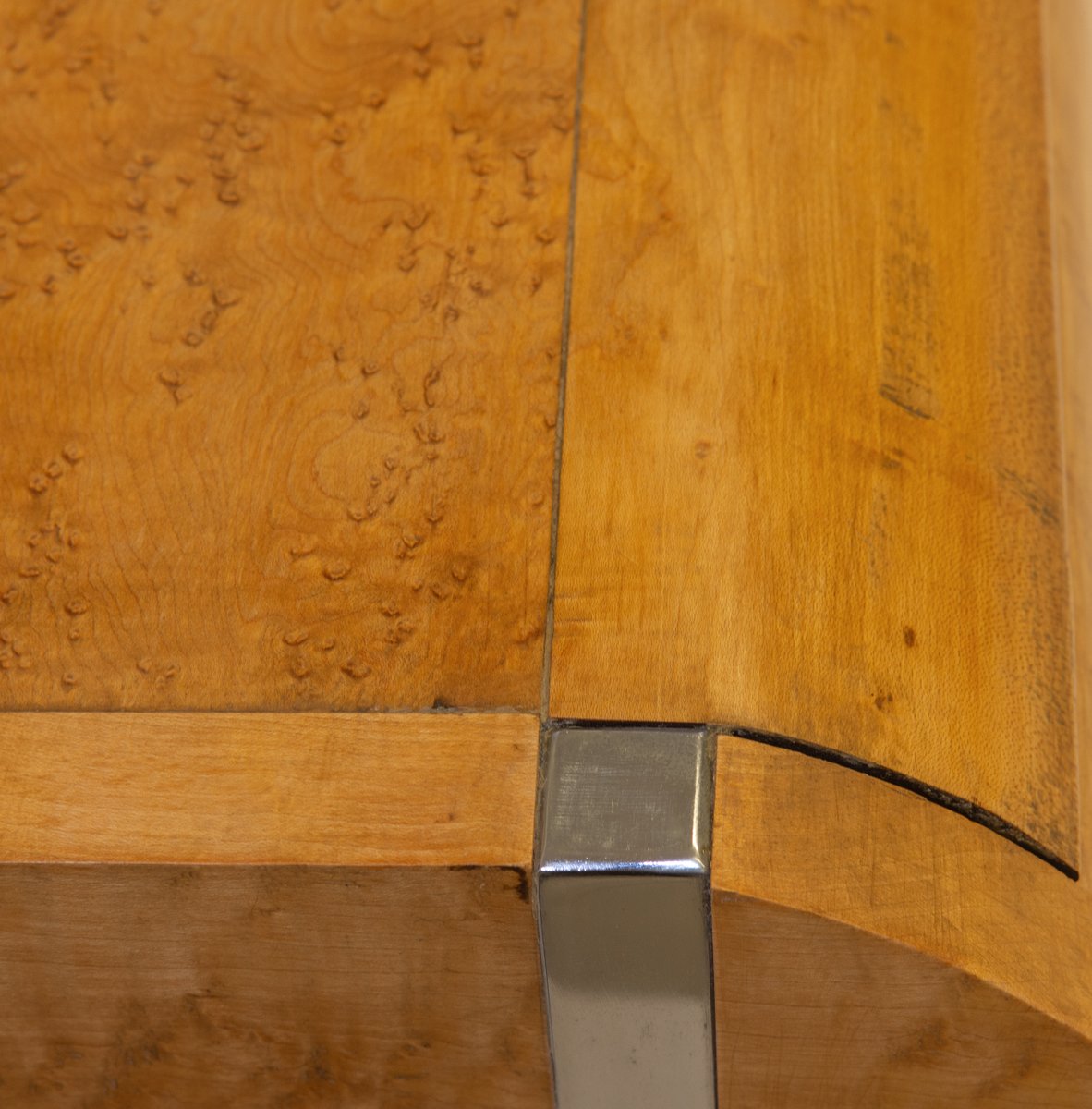 It's all about the angles and curves on this stylish table. It has solid bird's eye maple sides and drawer front, which is quite unique as this wood is normally used as a veneer. The rest is veneered in the same decorative wood.
