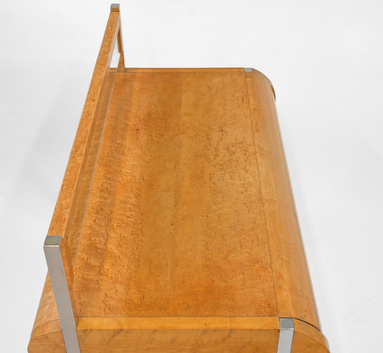 Questo elegante tavolo è caratterizzato da angoli e curve. I fianchi e il frontale dei cassetti sono in acero massiccio, una caratteristica unica in quanto questo legno viene normalmente utilizzato come impiallacciatura. Il resto è impiallacciato nello stesso legno decorativo.