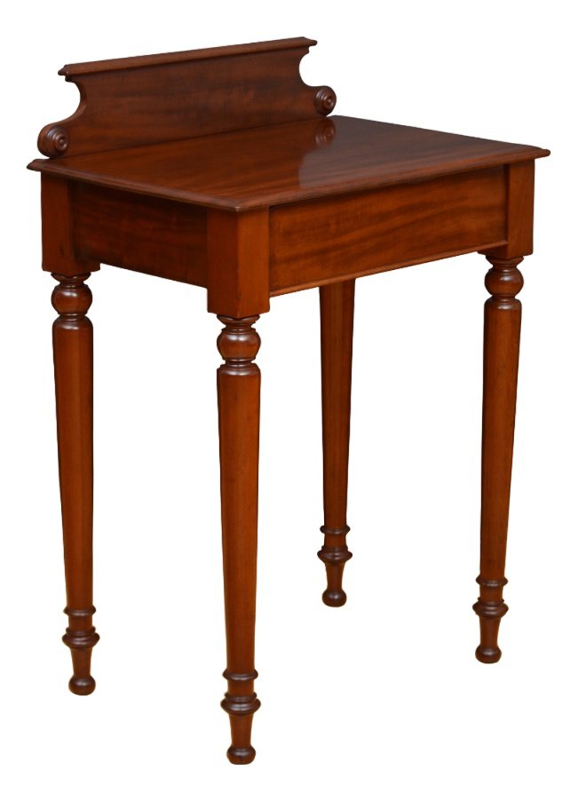 Elegant English, 19th century hall table in mahogany, having figured mahogany, shaped and moulded upstand to the back, figured mahogany top and figured mahogany frieze drawer, all standing on slender turned legs with ringed decoration to the bottom. This antique console table is in hope ready condition. Upstand is optional and can be easily removed. Bears original makers plaque. c1850