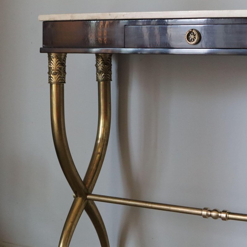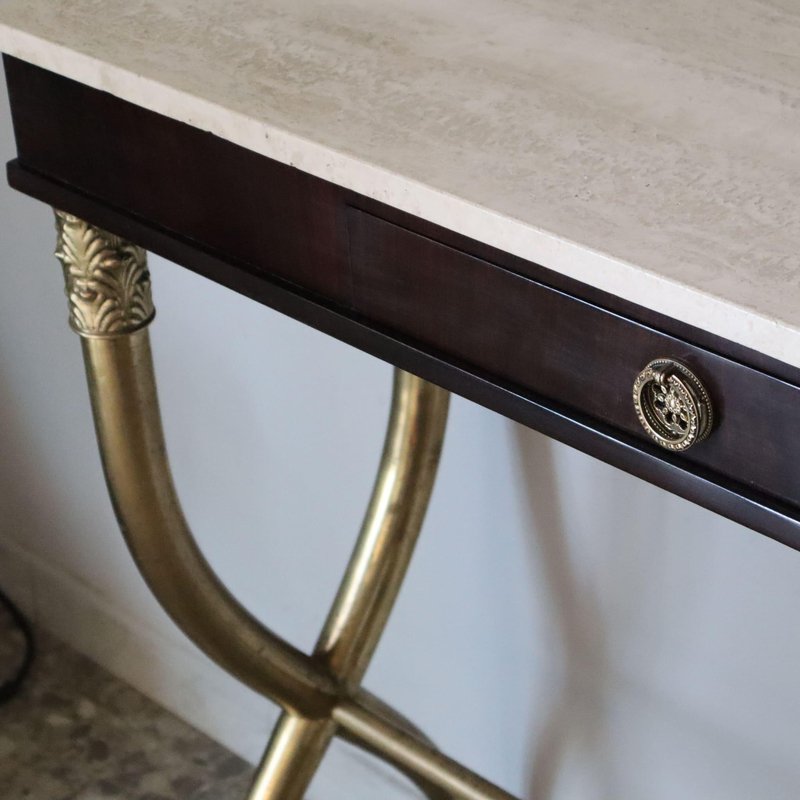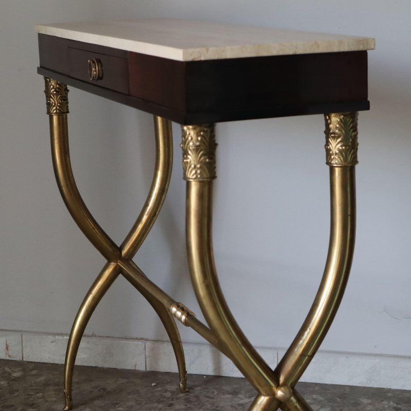 Console by Paolo Buffa: A Timeless Luxury This console by Paolo Buffa, made in the 1940s, is a masterpiece of Italian design that embodies luxury and refinement. Measuring 96cm wide, 30cm deep and 87cm high, this piece of furniture combines elegance and functionality flawlessly. The fine materials – rosewood, marble and brass – reflect a rare attention to detail and a quality craftsmanship that distinguishes every creation by Paolo Buffa. Quality Materials and Refined Design Rosewood: The Warmth of Tradition The rosewood frame gives the console a warm and sophisticated look. Its unique grain gives the piece of furniture a natural charm, making it a piece that attracts attention without ever being excessive. Marble: Elegance and Durability The marble top adds an unmistakable touch of luxury. The smooth surface and natural veining of the marble make it a decorative as well as functional element, perfect for enhancing the environment in which it is placed. Brass: Refined Details The finely crafted brass feet complete the harmony of the materials. Brass, with its characteristic shine, adds a luxurious detail and a touch of classicism, underlining the attention to detail. Uniqueness and Luxury for Elegant Environments An Exclusive Furnishing This console is a unique piece, designed for those who wish to enrich their home with an element of high quality and refinement. Every detail, from materials to proportions, has been designed to communicate timeless elegance. Perfect for Luxury Environments Ideal for sophisticated settings, this console can be placed in an entrance hall, dining room or study, becoming a focal point that captures attention and arouses admiration.