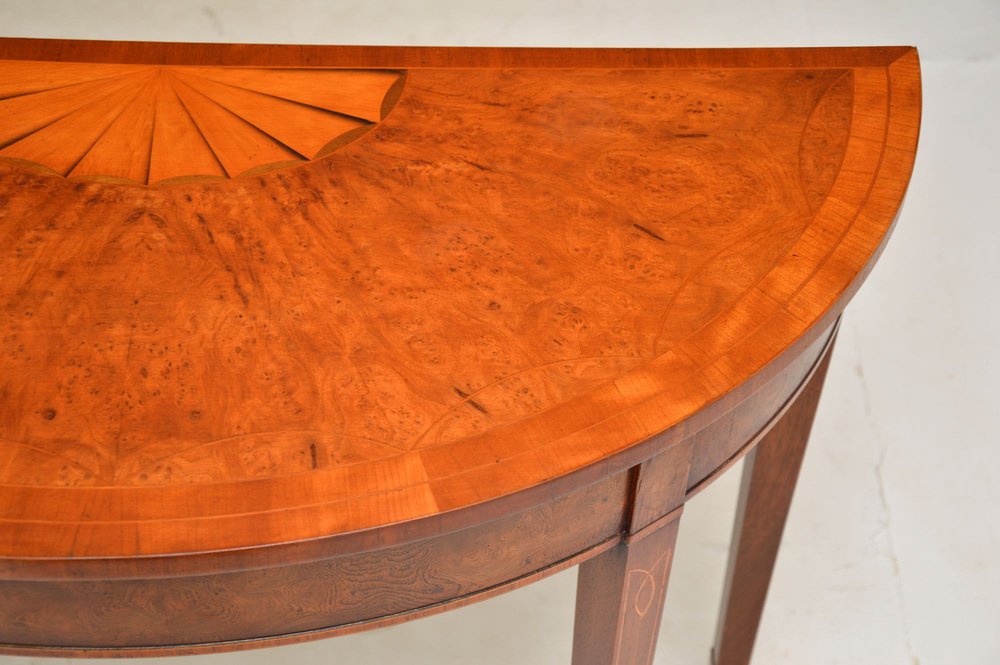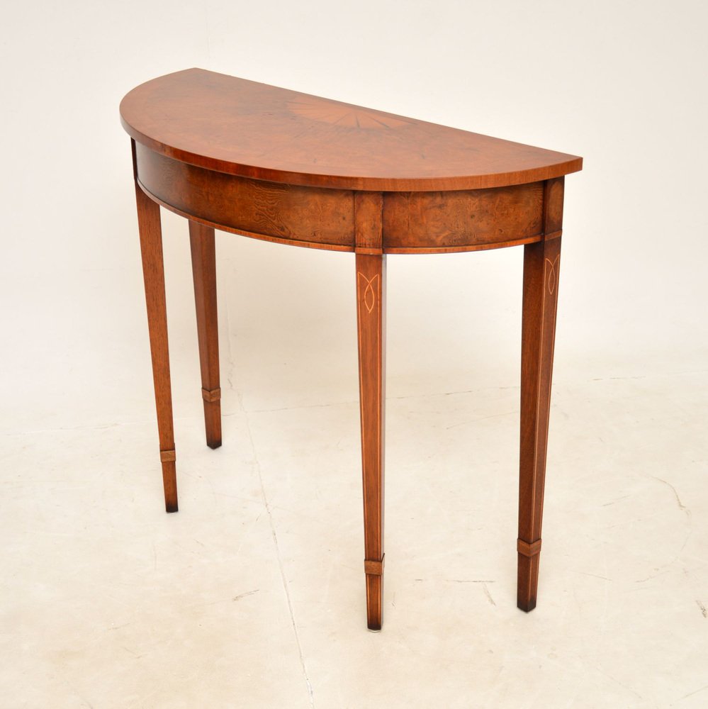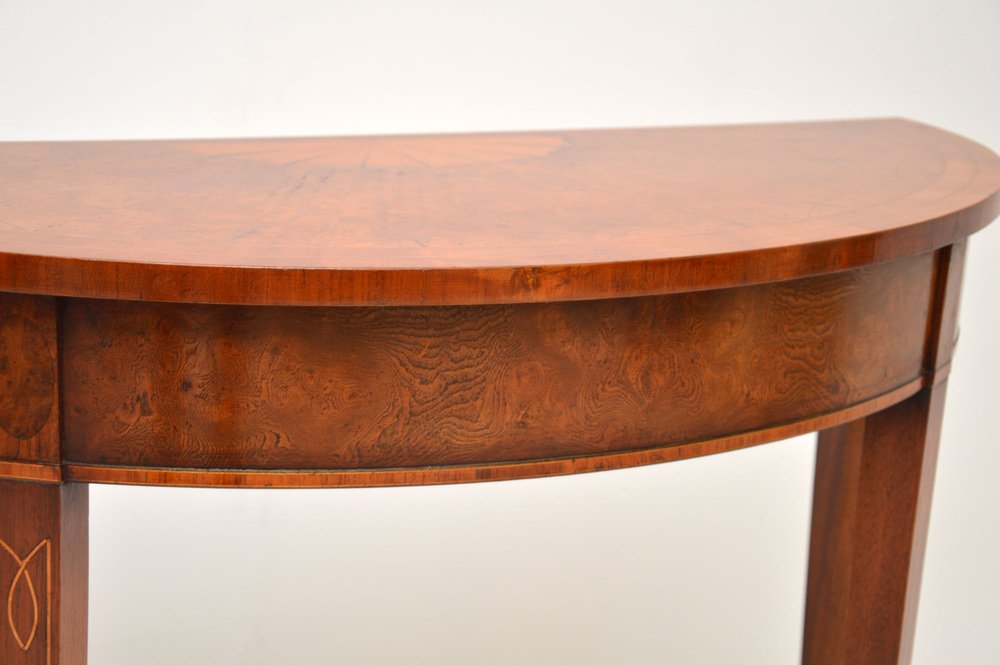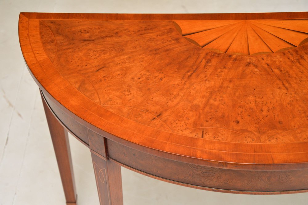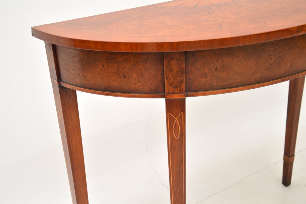 A beautiful antique burr elm console table in the Sheraton style. This was made in England, it dates from around the 1950’s.