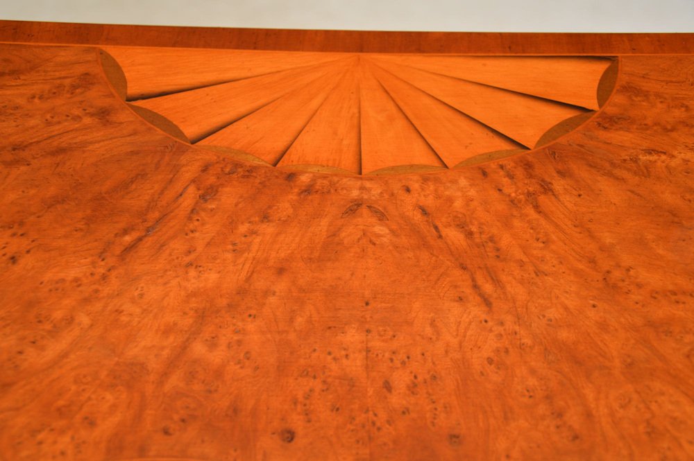 La qualità è eccezionale, è di ottima fattura e dal design squisito. Il piano è a forma di arco e poggia su gambe finemente affusolate. Le venature dell'olmo sono meravigliose, il piano è a fasce incrociate e ci sono splendidi intarsi in legno satinato su tutta la superficie.