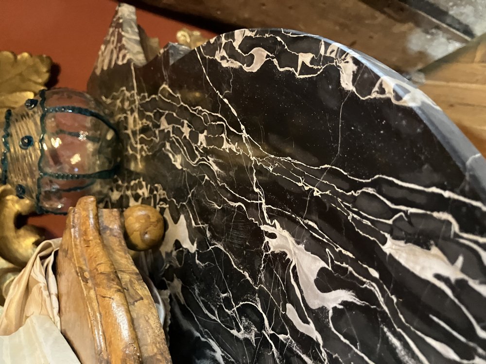 The tops are crafted from solid marble, featuring a refined palette of black with grey and white veining, and are cut with an elegant, shaped profile. This rare use of full stone slabs — rather than veneered surfaces — enhances the consoles’ prestige and emphasizes their lasting durability.