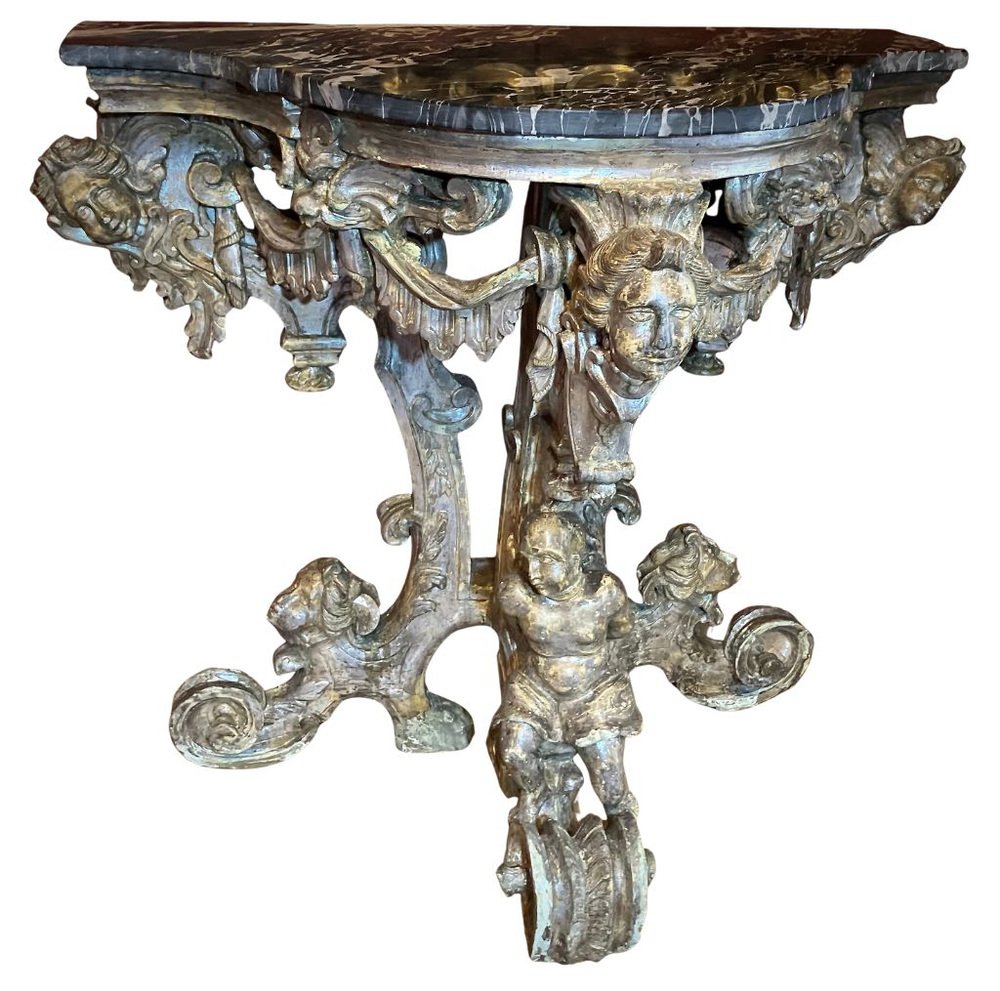 with their theatrical design, sculptural presence. and strong architectural character, these consoles are masterpieces of 17th-century Italian craftsmanship. They can serve as important statement pieces in a luxury interior, a palatial hallway, or a refined living space, embodying the grandeur of Baroque decorative arts. They embody the drama and magnificence of 17th-century Italian craftsmanship.