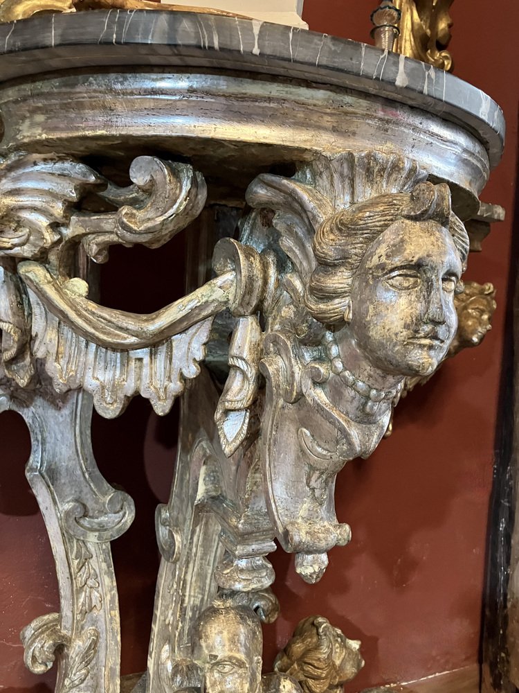 Each console features an exuberant carved base in giltwood with silvered mecca finish, richly adorned with volutes, grotesque masks, acanthus scrolls, and allegorical figures. The carving is deeply modeled, almost three-dimensional, giving the consoles the presence of true sculptures rather than mere pieces of furniture.