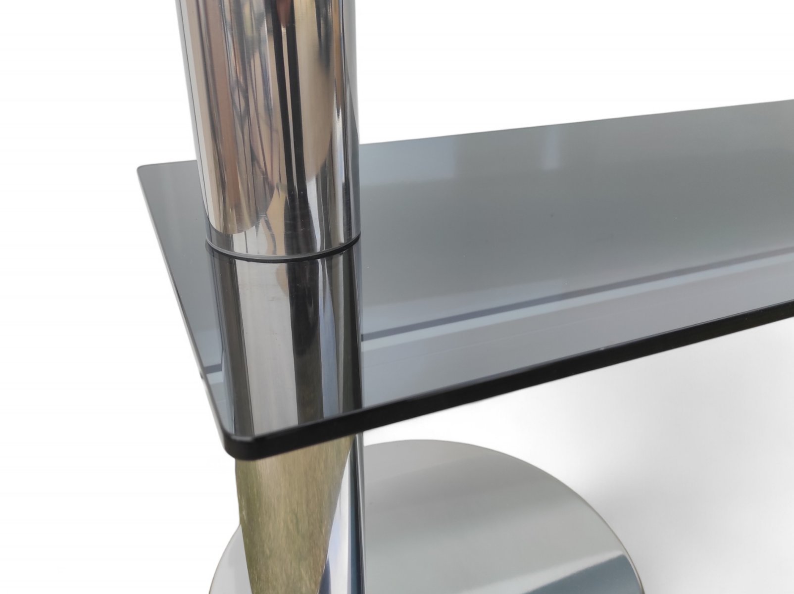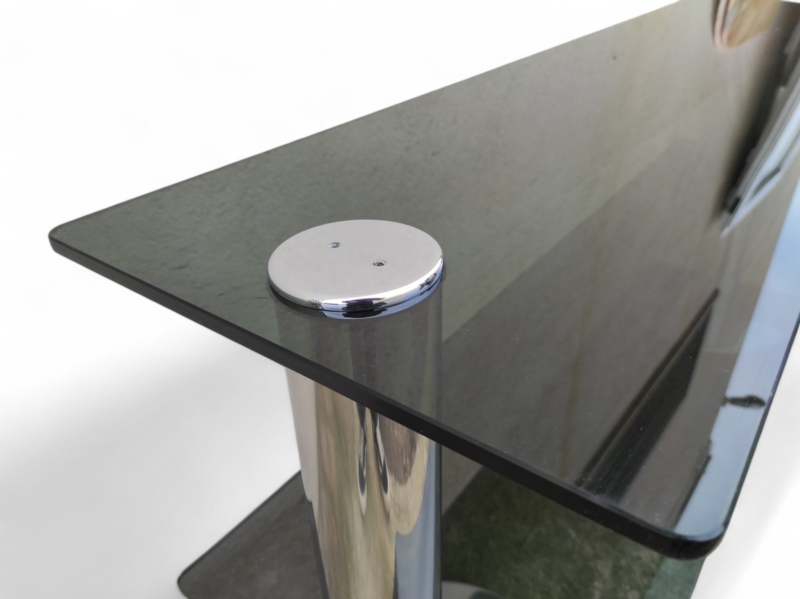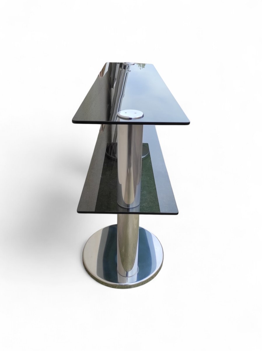 Consolle vintage in vetro fumé, acciaio e placcatura in cromo, anni '70
