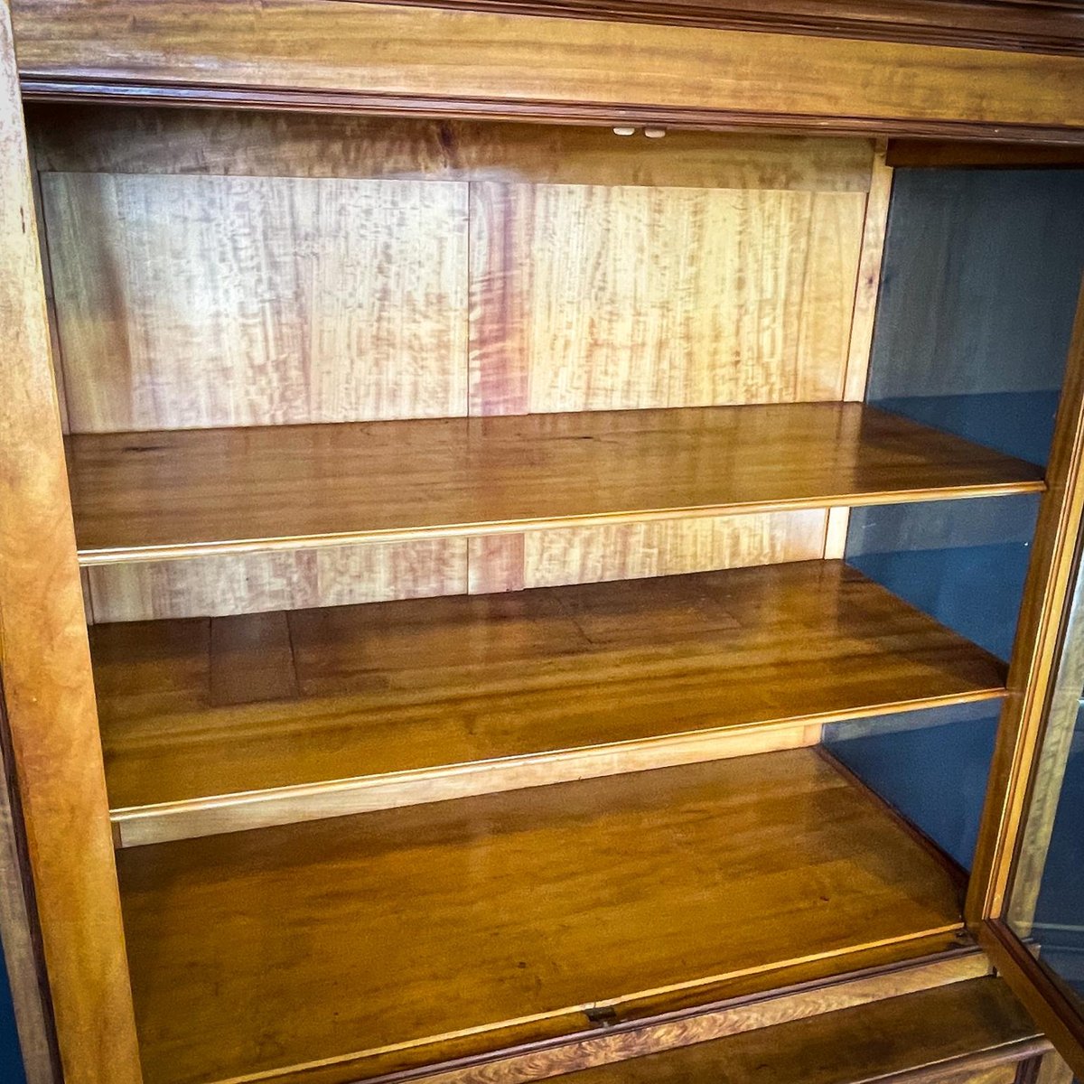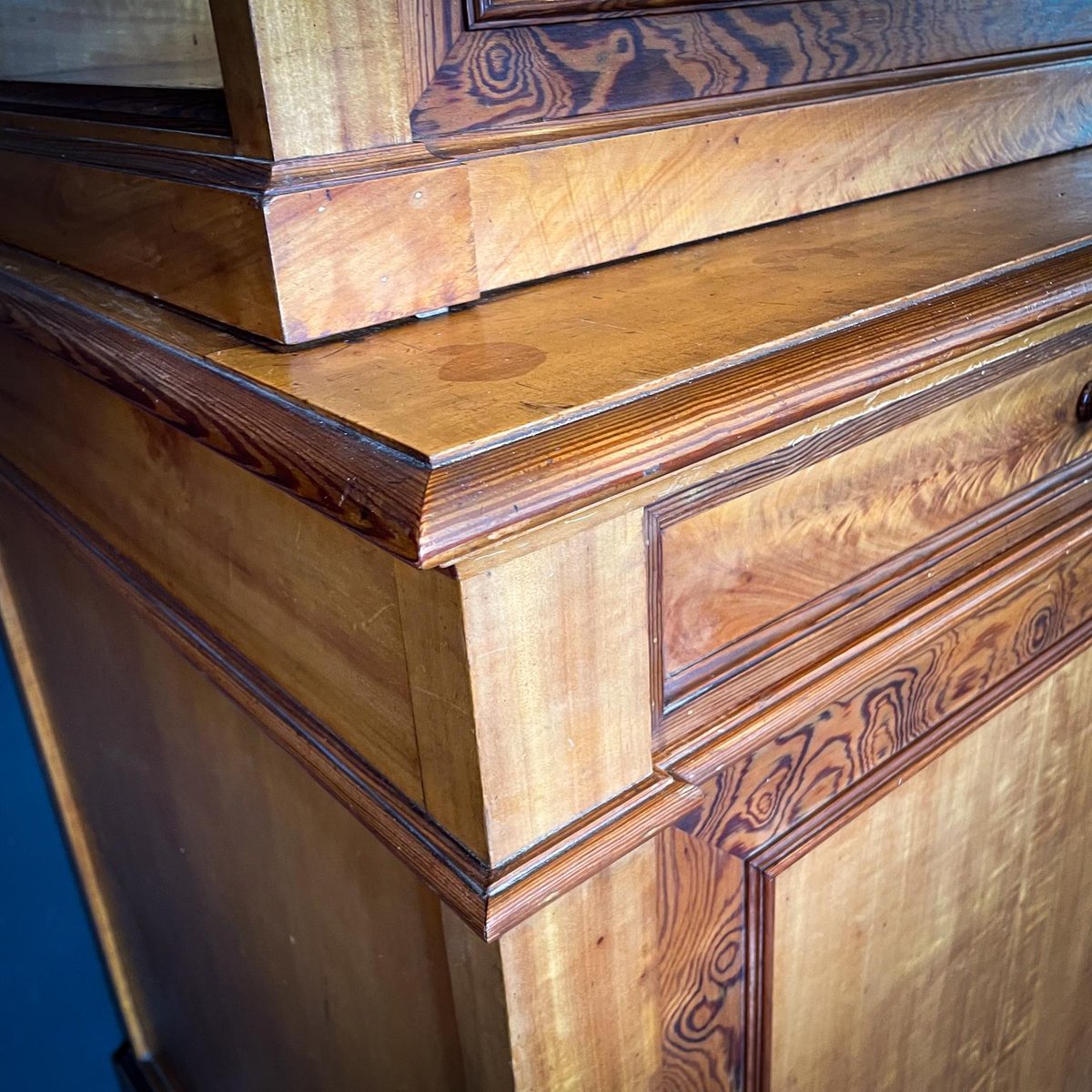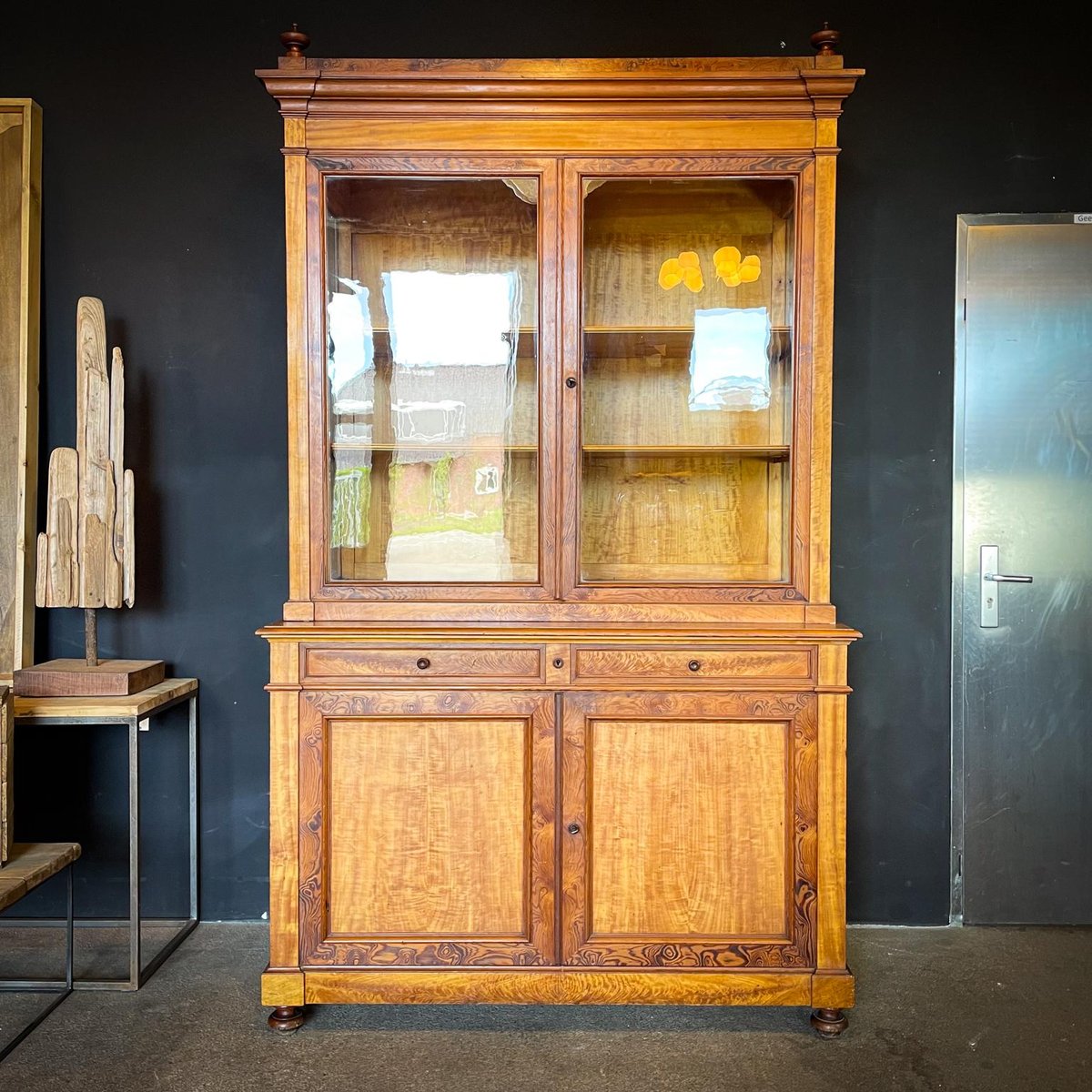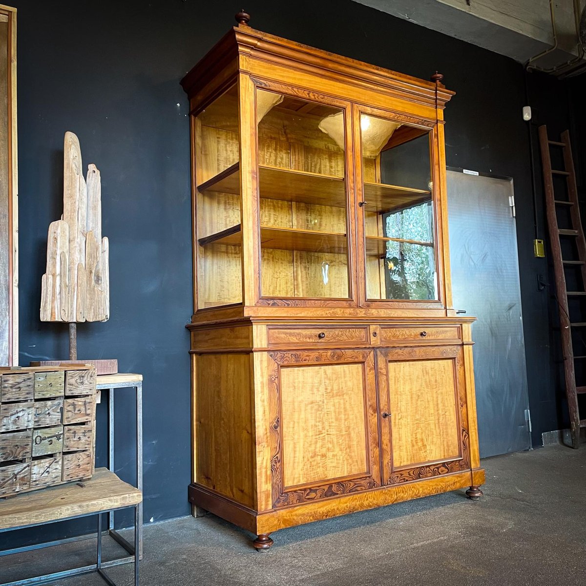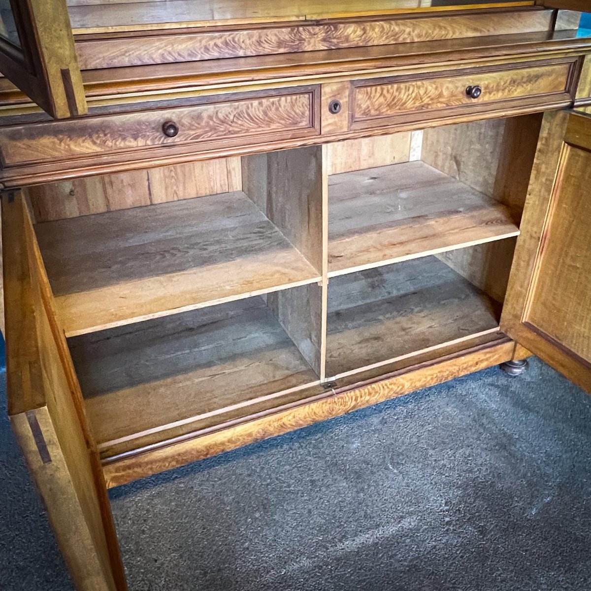 Questa credenza antica è stata realizzata a mano nel 1880 circa, in Belgio, e proviene da un palazzo signorile. Il mobile è composto da vari tipi di legno specchiato. Il mobile ha vetri ondulati originali, chiavi con serrature funzionanti. Il mobile è composto da 2 parti: il mobile inferiore è chiuso con 2 ante e 2 cassetti, il mobile superiore è una vetrina con 2 ante. I 2 punti in legno sopra sono opzionali e possono essere facilmente rimossi. Dimensioni: 250 altezza, 147 larghezza, 73 profondità cm