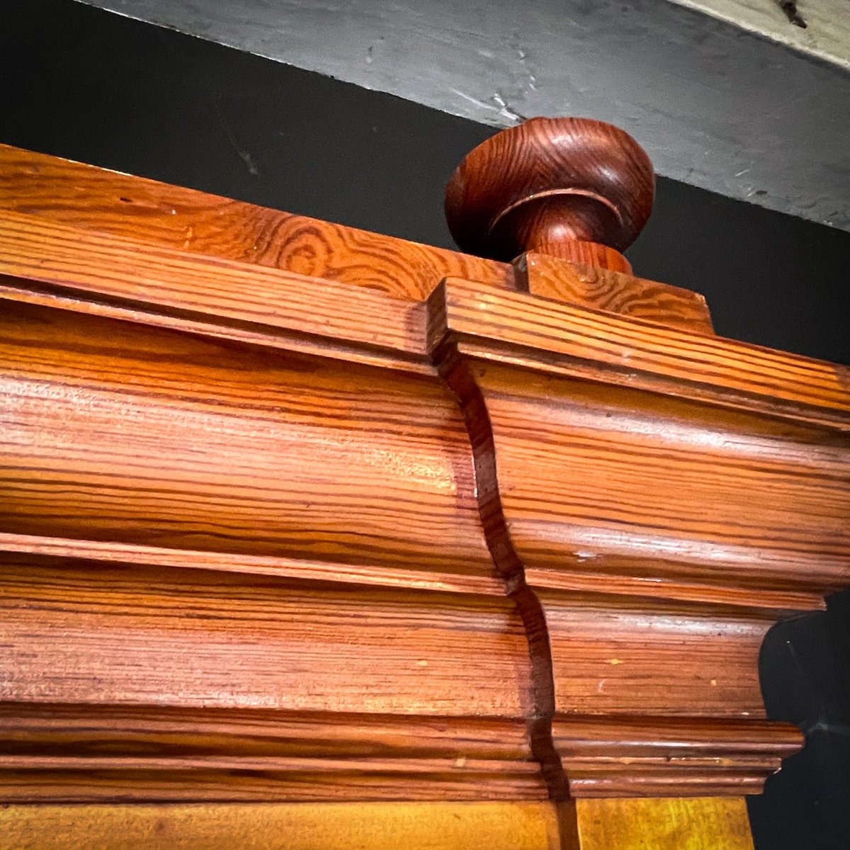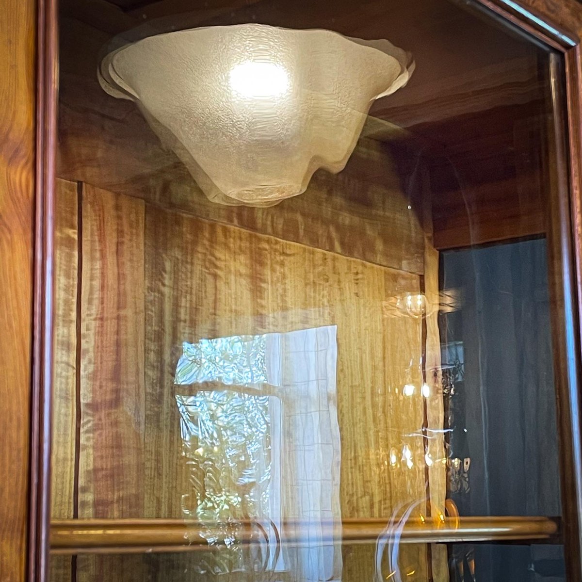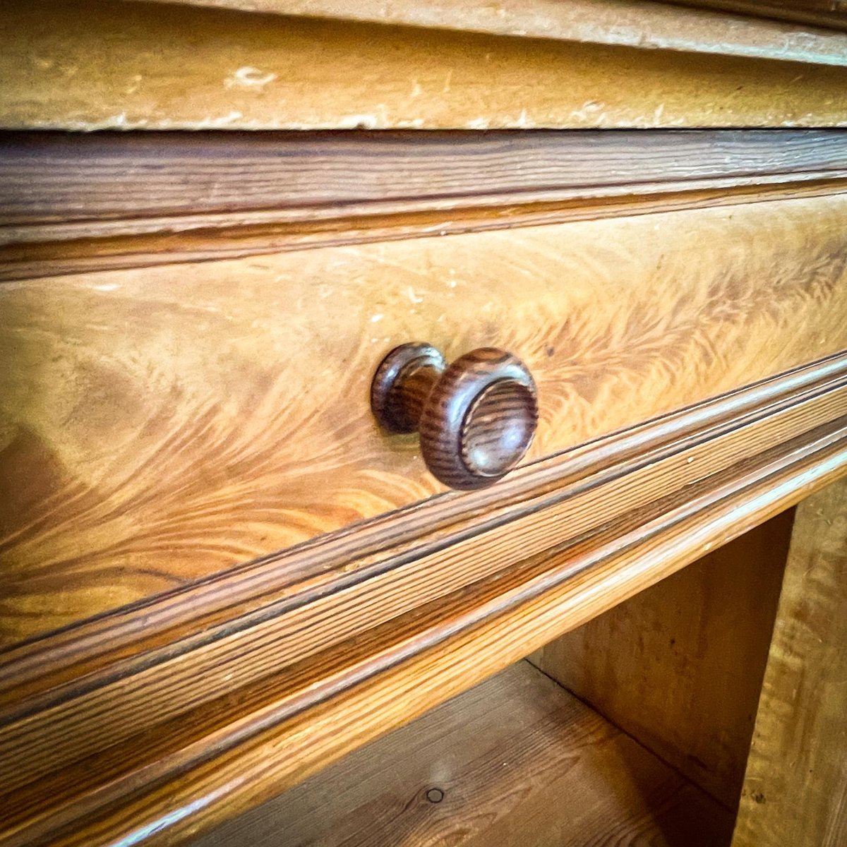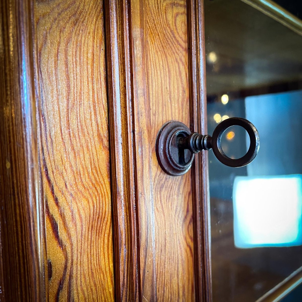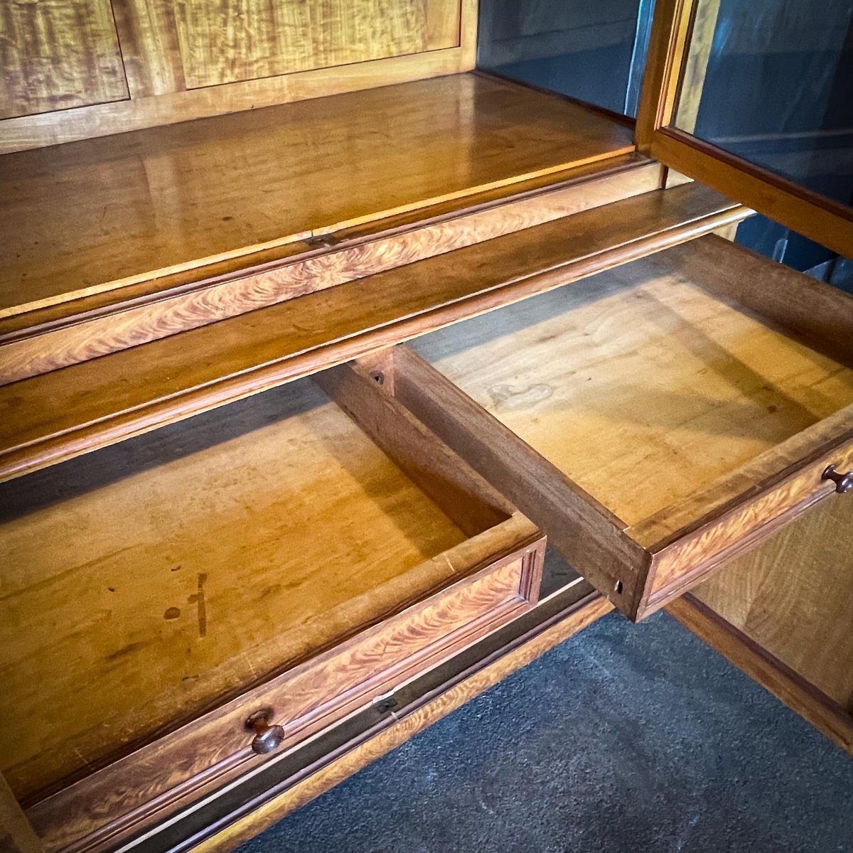 Questa credenza antica è stata realizzata a mano nel 1880 circa, in Belgio, e proviene da un palazzo signorile. Il mobile è composto da vari tipi di legno specchiato. Il mobile ha vetri ondulati originali, chiavi con serrature funzionanti. Il mobile è composto da 2 parti: il mobile inferiore è chiuso con 2 ante e 2 cassetti, il mobile superiore è una vetrina con 2 ante. I 2 punti in legno sopra sono opzionali e possono essere facilmente rimossi. Dimensioni: 250 altezza, 147 larghezza, 73 profondità cm
