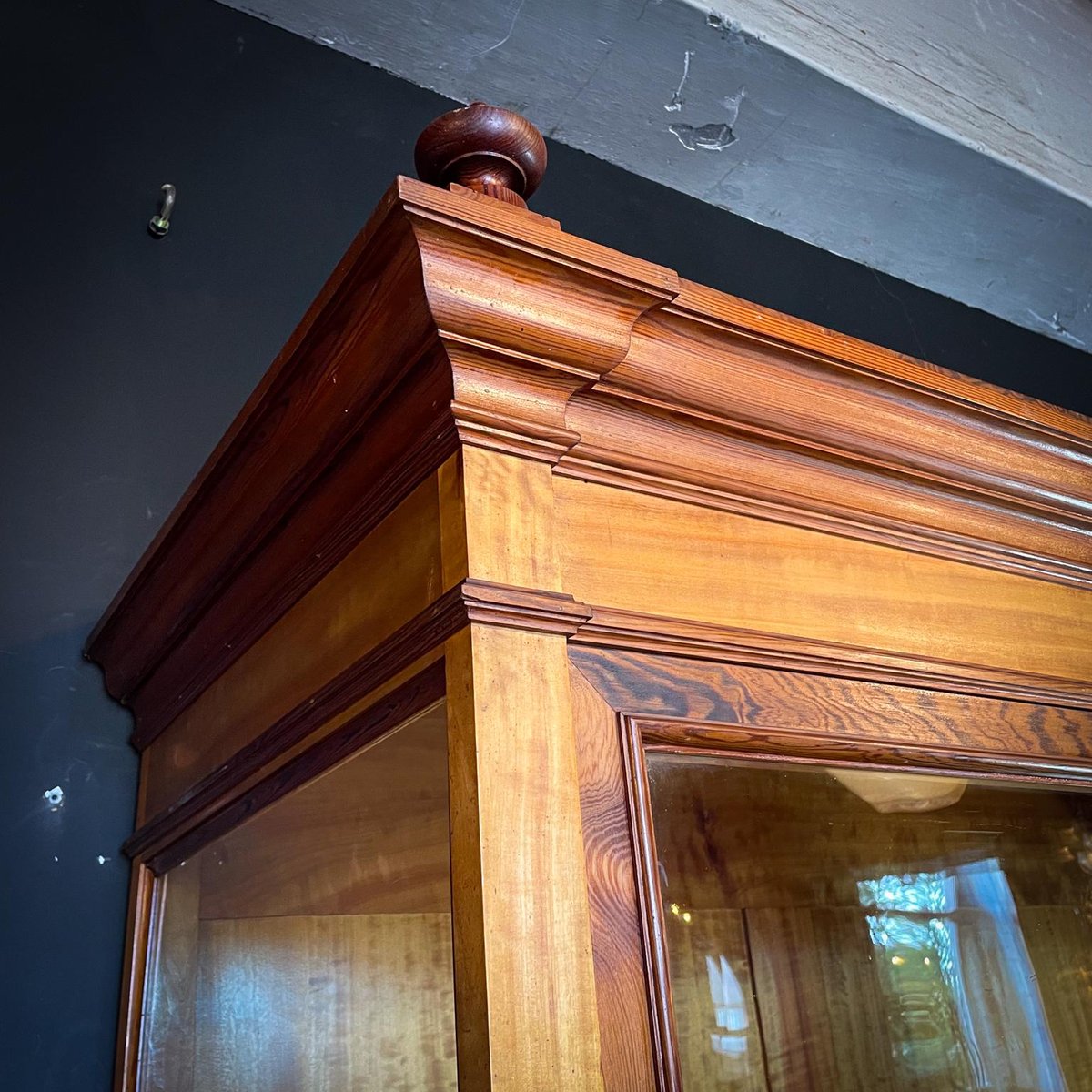 This antique sideboard was handmade in circa 1880, Belgium and comes from a mansion. The cabinet is made of various types of wood that are mirror-imaged. The cabinet has original corrugated glass, keys with working locks. The cabinet consists of 2 parts: the lower cabinet is closed with 2 doors and 2 drawers, the upper cabinet is a display cabinet with 2 doors. The 2 wooden points above are optional and can easily be removed. Dimensions: 250 high, 147 wide, 73 deep cm