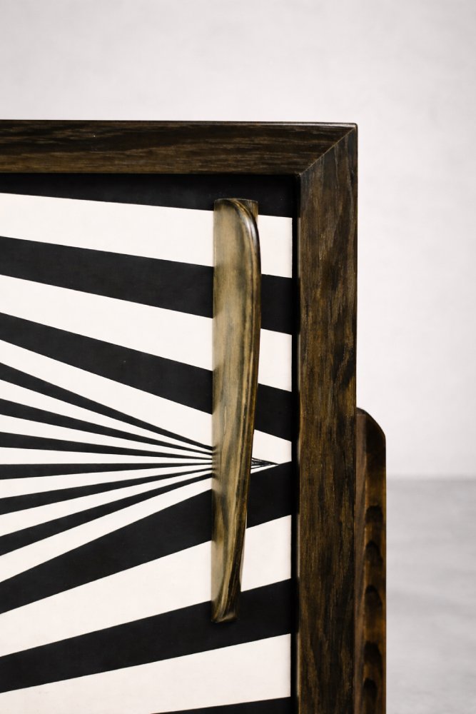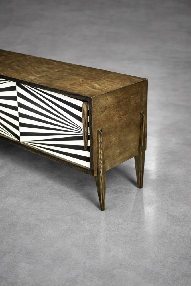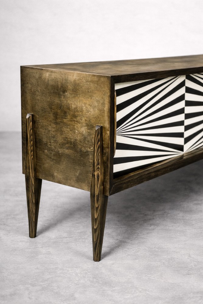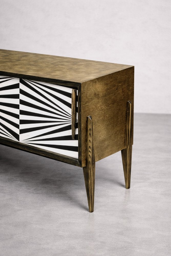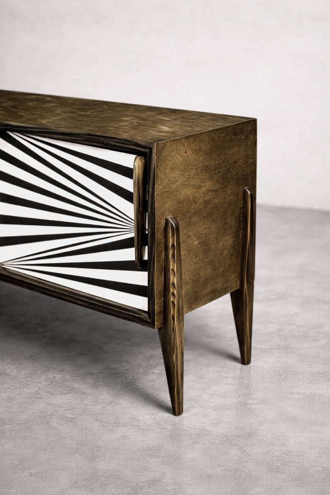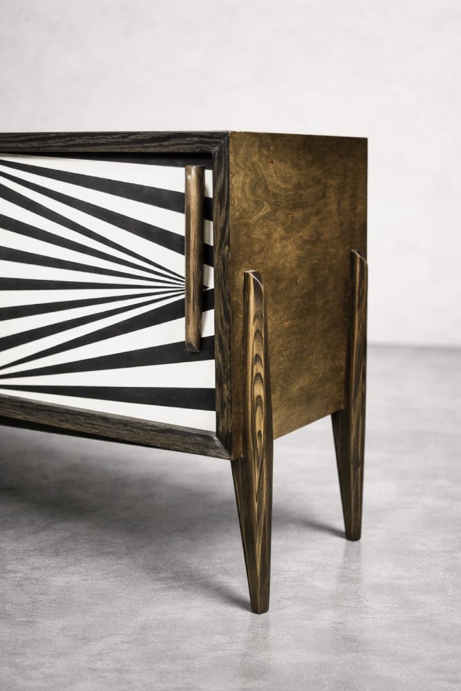 This modernist sideboard was produced in Scandinavia during the 1960s. It was finished with birch wood with irregular, strong graining with visible unevenness and grain variations. Wood finished in a characteristic, earthy color, where browns and grays interpenetrate in contrasts of varying intensity. The sideboard has a pair of sliding doors with longwooden handles. The front is decorated with hand-painted black and white hypnotic paintings in the Op-Art style. Inside, it has one shelf and a capacious empty space. The base is made of high legs made of wood.