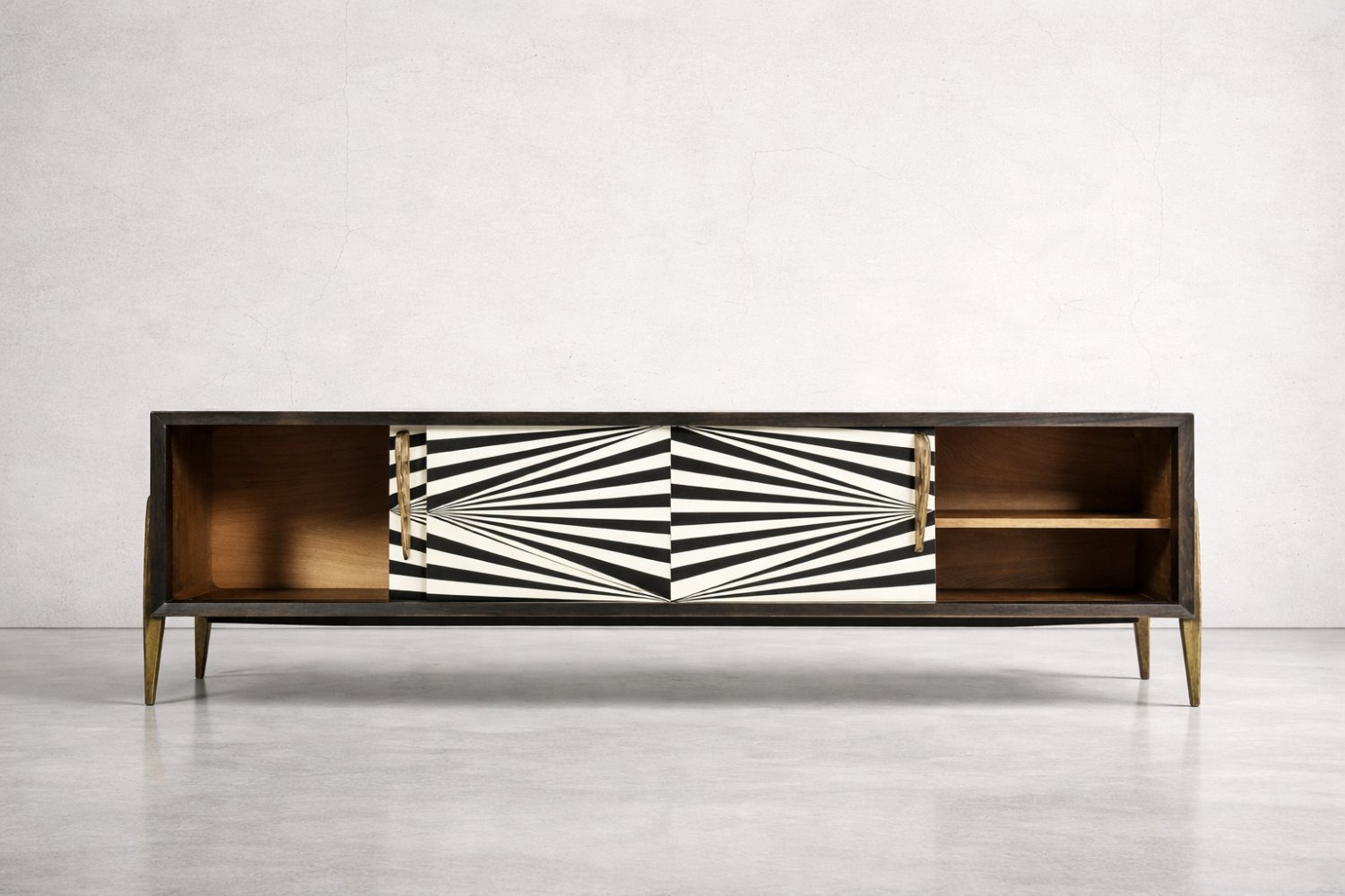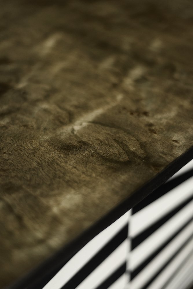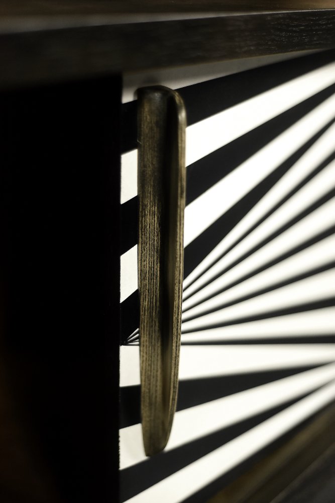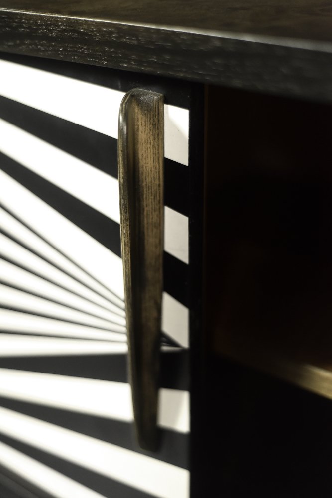 Questa credenza modernista è stata prodotta in Scandinavia negli anni '60. È stata rifinita con legno di betulla con venature irregolari e marcate, con irregolarità e variazioni di grana visibili. Il legno è rifinito con un caratteristico colore terroso, dove i marroni e i grigi si compenetrano in contrasti di varia intensità. La credenza ha una coppia di ante scorrevoli con lunghe maniglie in legno. La parte anteriore è decorata con ipnotici dipinti in bianco e nero realizzati a mano in stile Op-Art. All'interno, ha un ripiano e un ampio spazio vuoto. La base è costituita da gambe alte in legno.