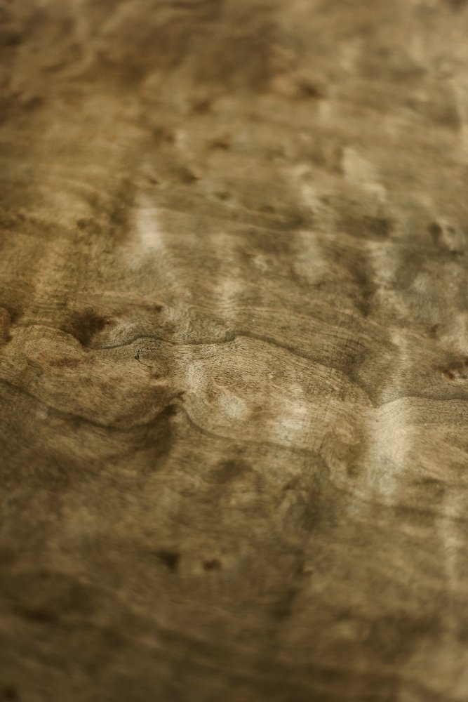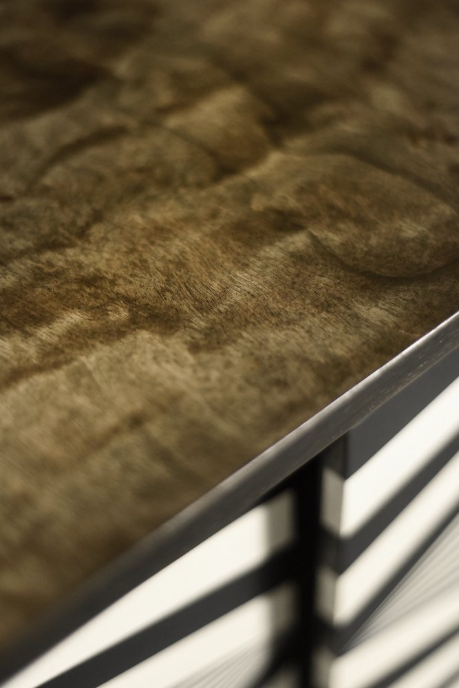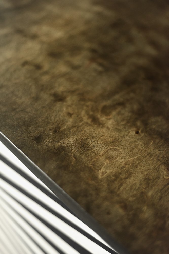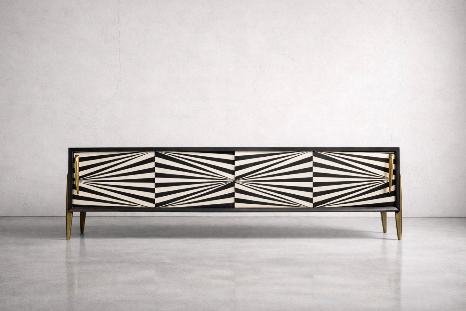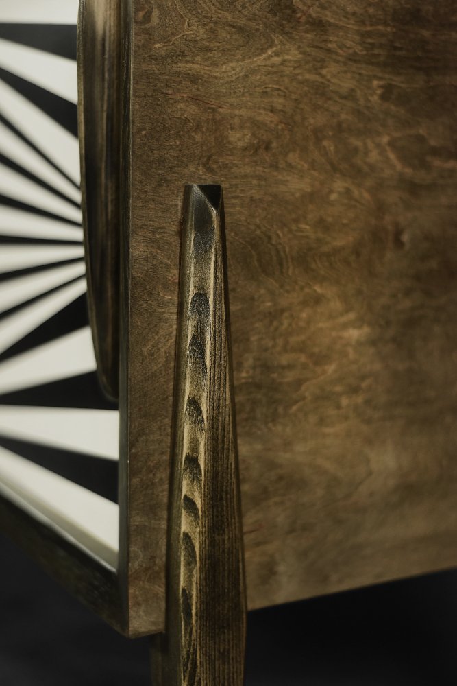 Questa credenza modernista è stata prodotta in Scandinavia negli anni '60. È stata rifinita con legno di betulla con venature irregolari e marcate, con irregolarità e variazioni di grana visibili. Il legno è rifinito con un caratteristico colore terroso, dove i marroni e i grigi si compenetrano in contrasti di varia intensità. La credenza ha una coppia di ante scorrevoli con lunghe maniglie in legno. La parte anteriore è decorata con ipnotici dipinti in bianco e nero realizzati a mano in stile Op-Art. All'interno, ha un ripiano e un ampio spazio vuoto. La base è costituita da gambe alte in legno.