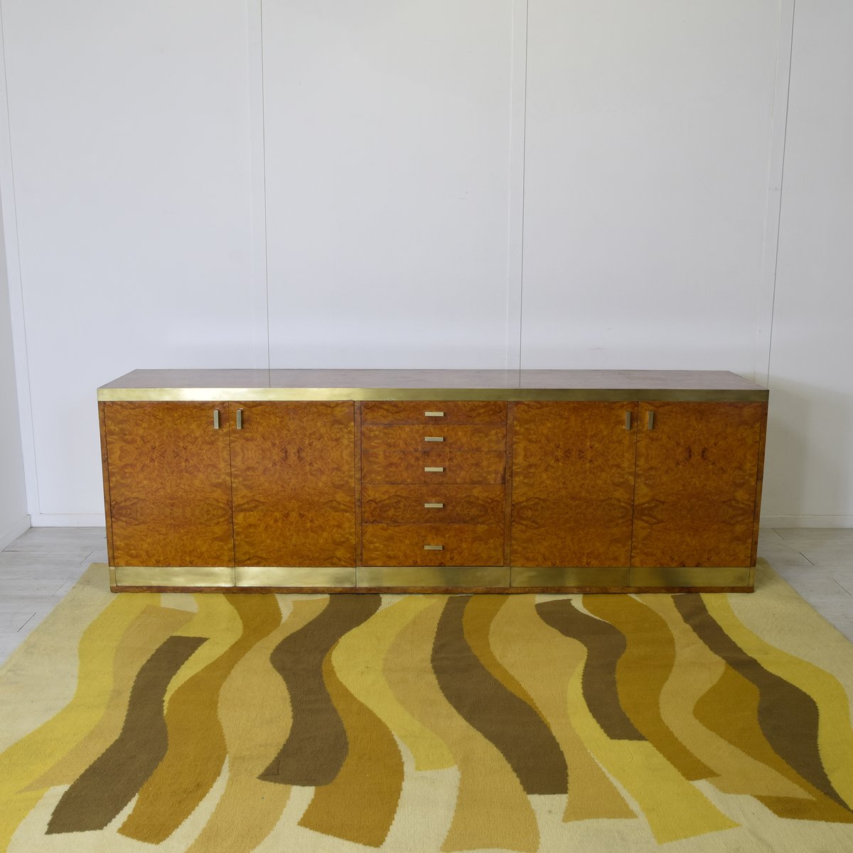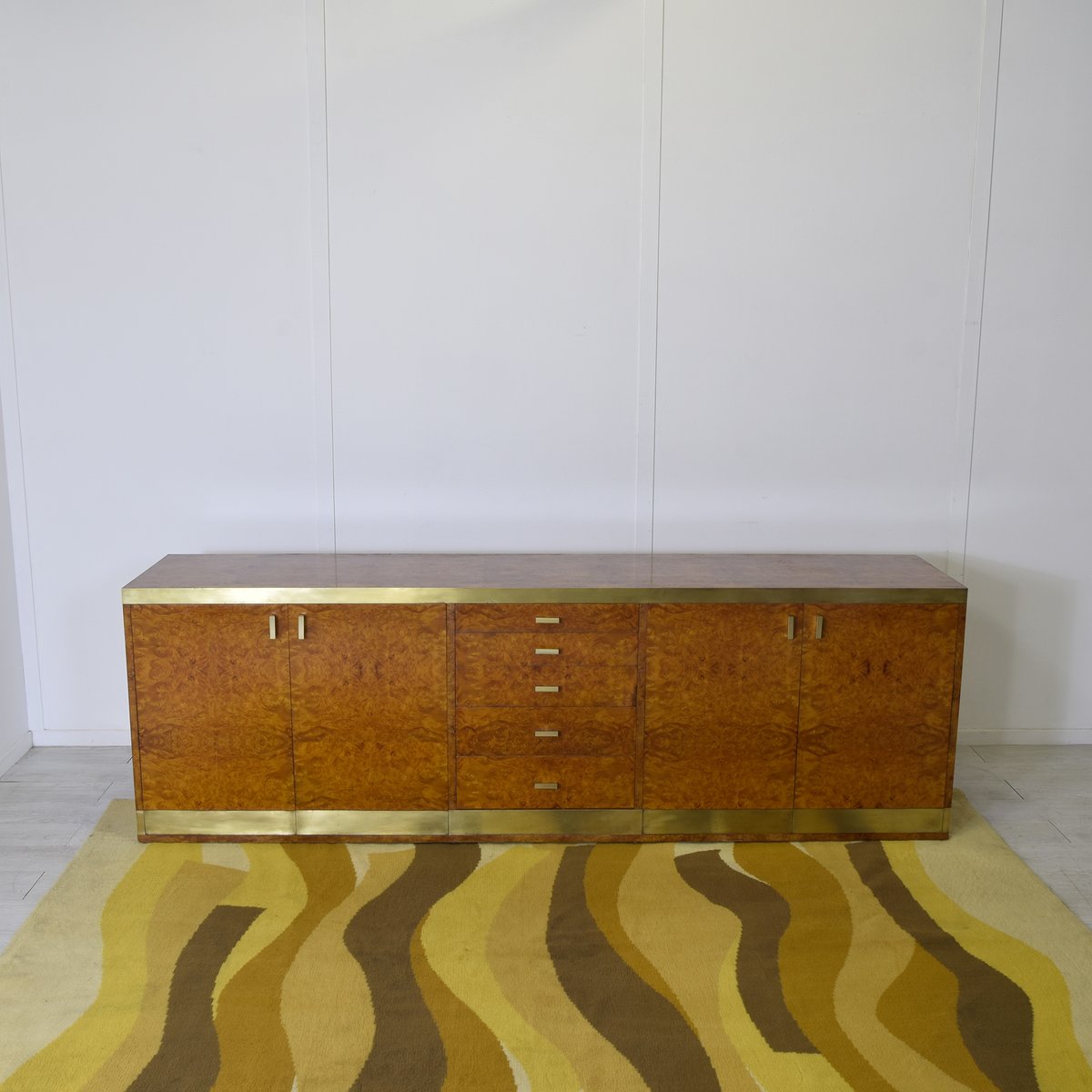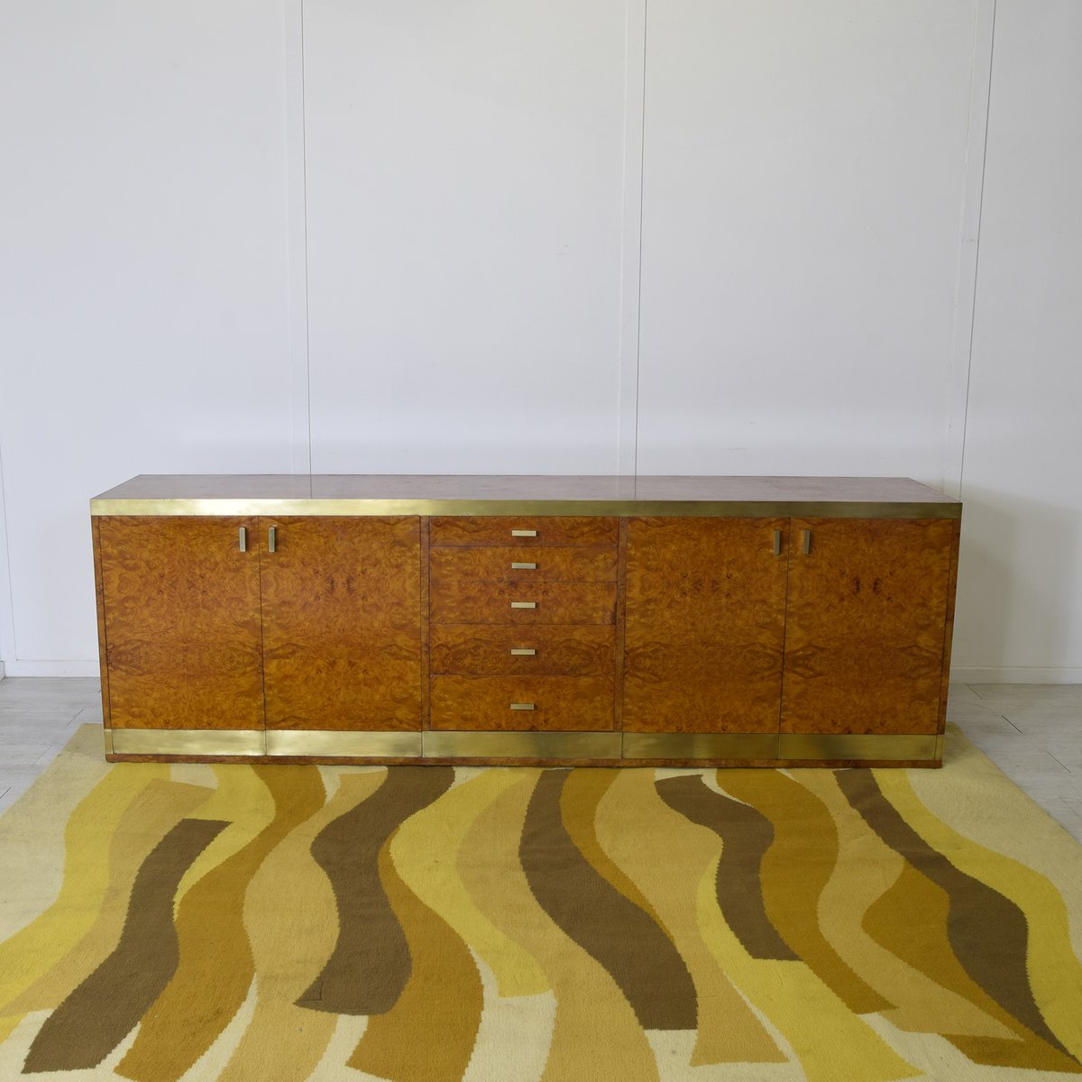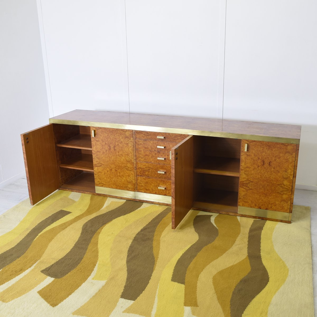 Credenza in legno di noce impiallacciato in radica con dettagli in ottone, produzione italiana attribuita a Gianluigi Gorgoni, anni '70.
