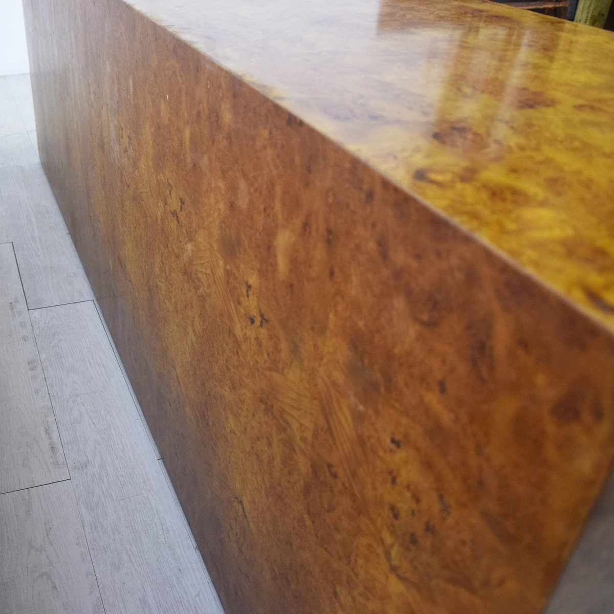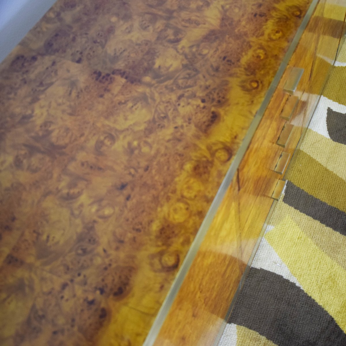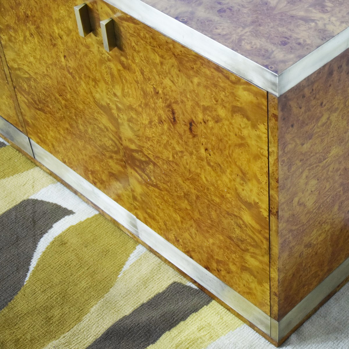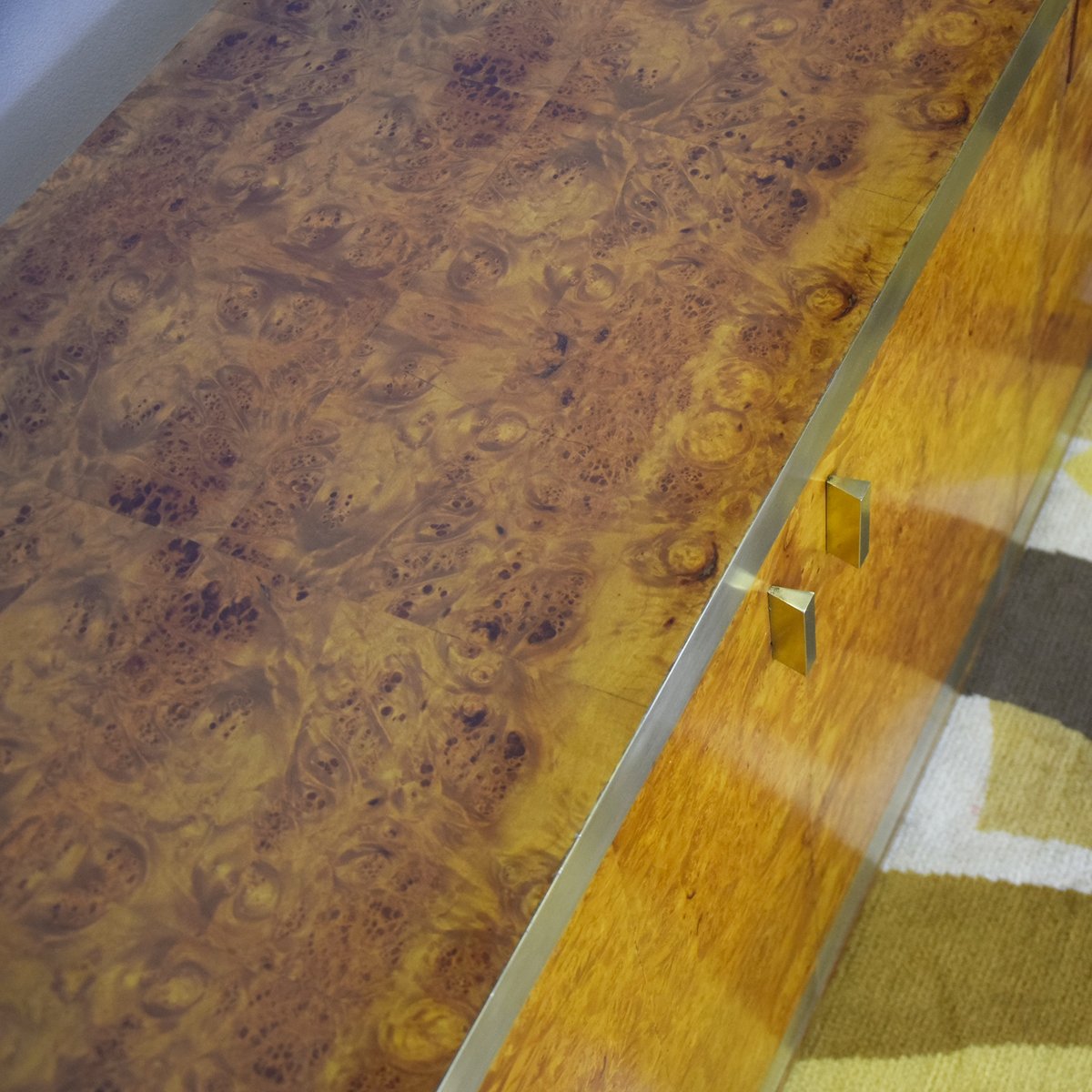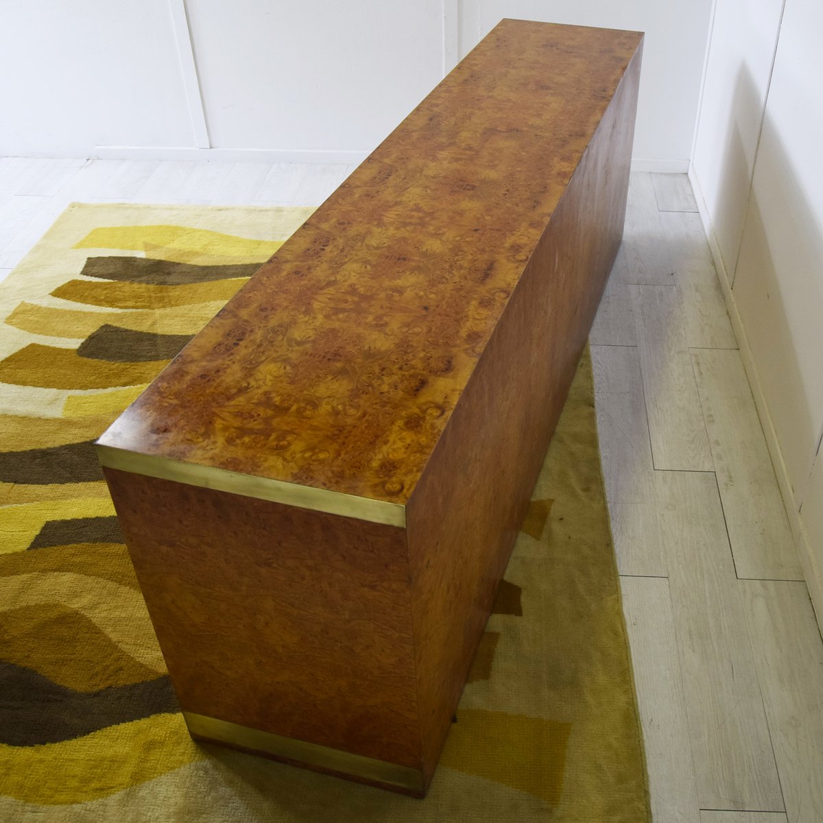 Credenza in legno di noce impiallacciato in radica con dettagli in ottone, produzione italiana attribuita a Gianluigi Gorgoni, anni '70.