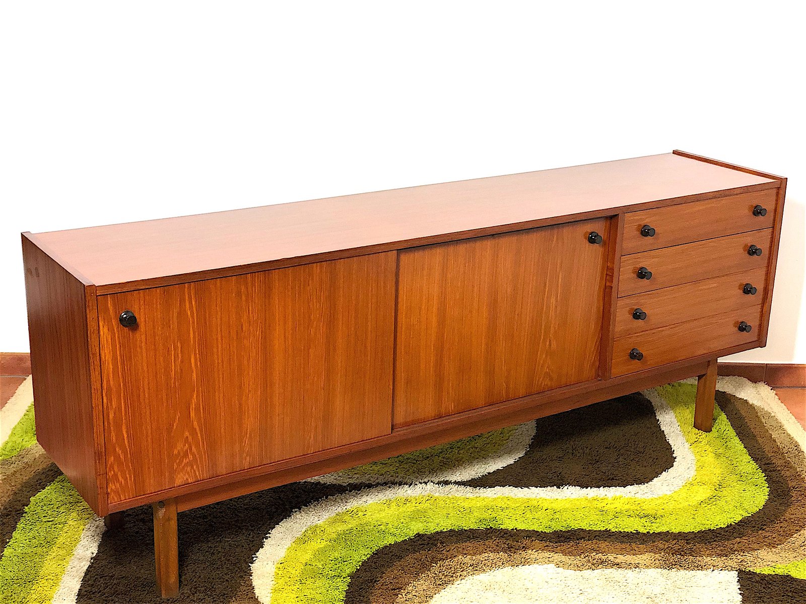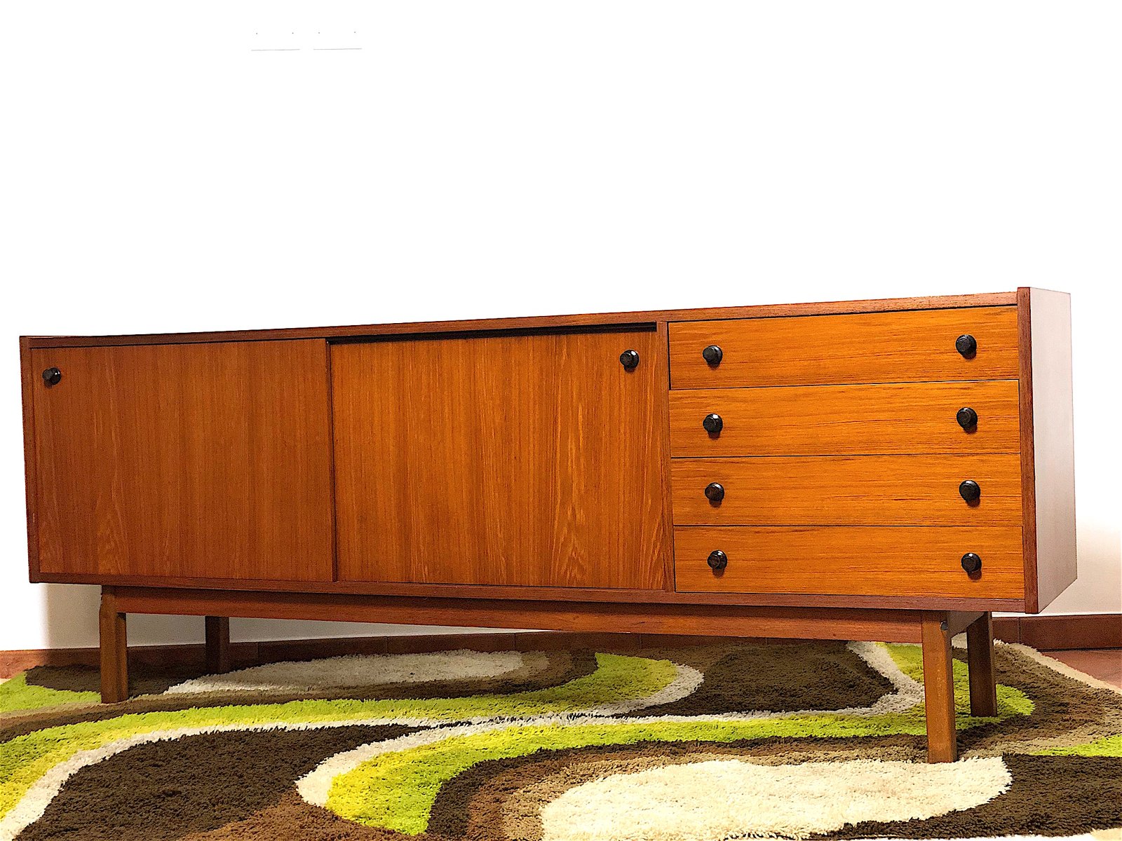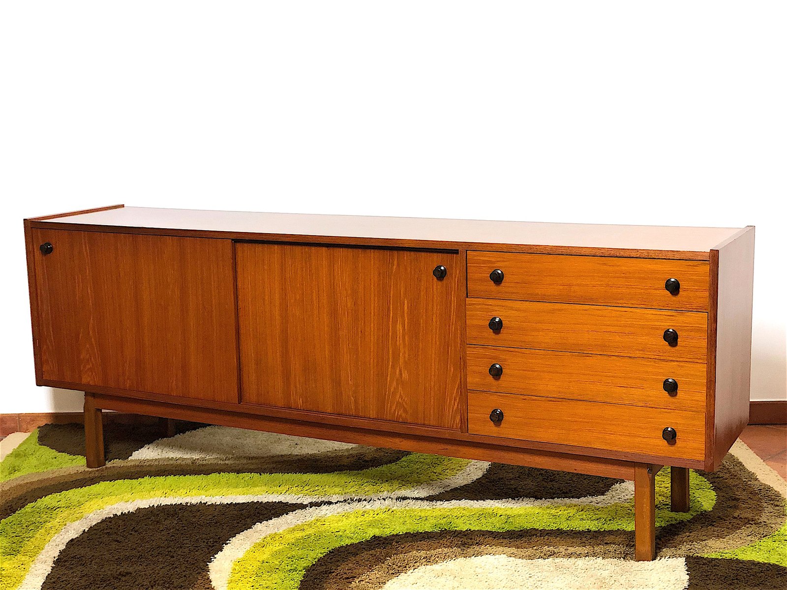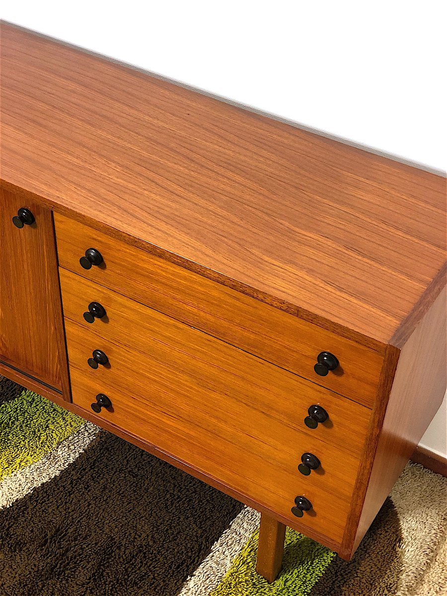 Vintage Sideboard cabinet from the 1960s, made in Mid Century Modern style and inspired by Scandinavian design. This piece of furniture represents an icon of refinement and functionality, perfect for enhancing any environment. The Sideboard features a wooden structure with a warm tone, emphasized by natural grain. Made of solid wood with Teak veneer, it has 4 drawers, two doors with sliding doors with relative internal shelf. Completely restored and sanitized. EXCELLENT CONDITIONS Measurements: Height 78 cm - Length 205 cm - Depth 43 cm