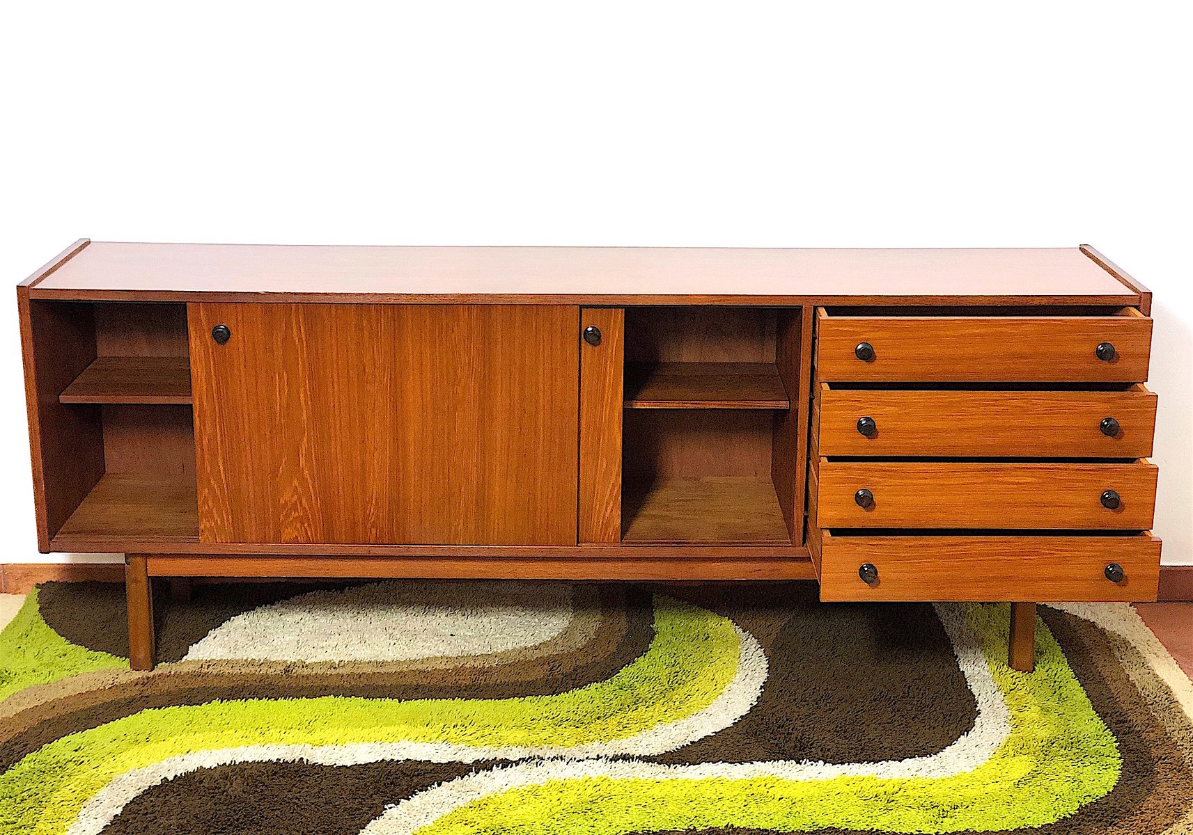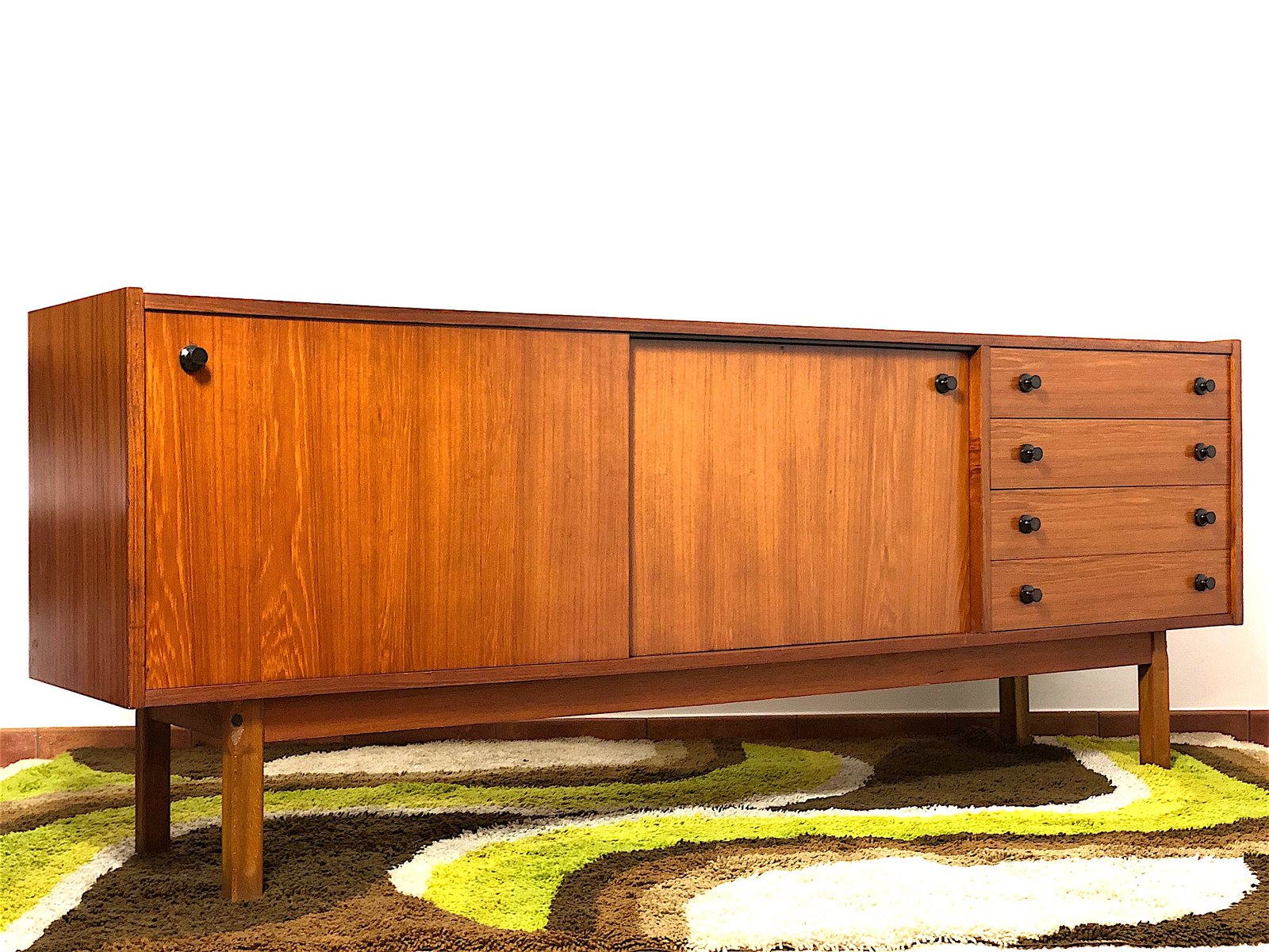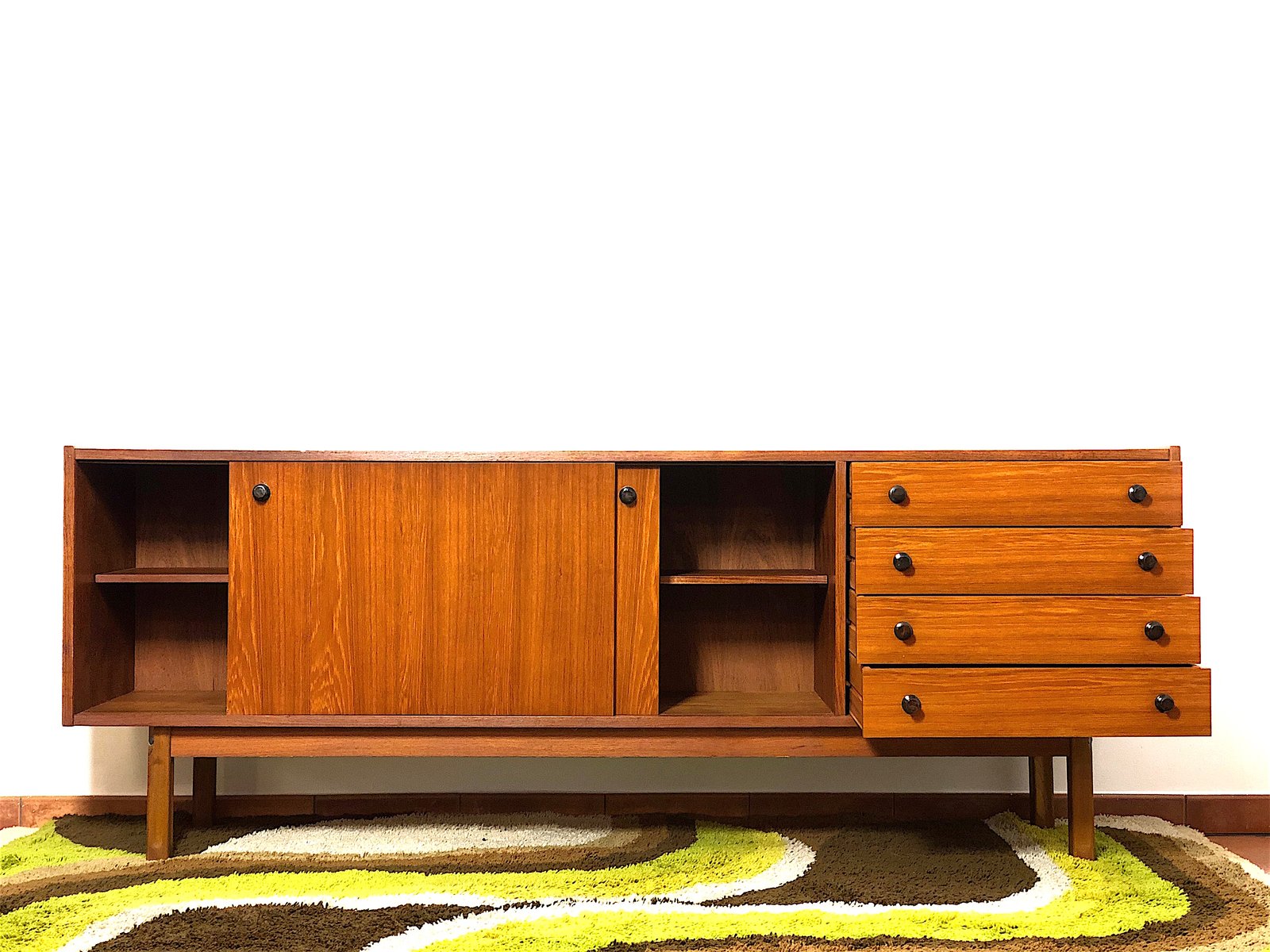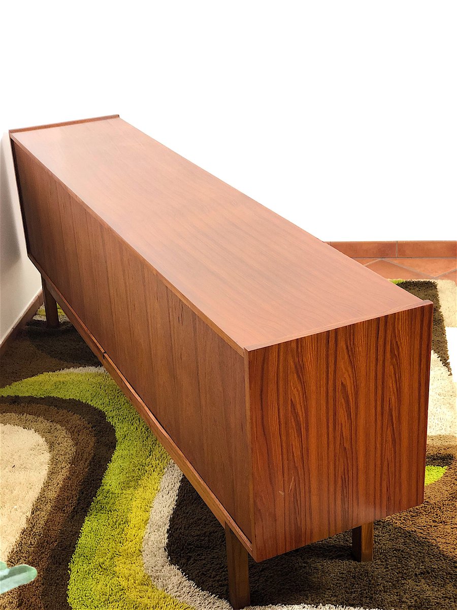 Vintage Sideboard cabinet from the 1960s, made in Mid Century Modern style and inspired by Scandinavian design. This piece of furniture represents an icon of refinement and functionality, perfect for enhancing any environment. The Sideboard features a wooden structure with a warm tone, emphasized by natural grain. Made of solid wood with Teak veneer, it has 4 drawers, two doors with sliding doors with relative internal shelf. Completely restored and sanitized. EXCELLENT CONDITIONS Measurements: Height 78 cm - Length 205 cm - Depth 43 cm