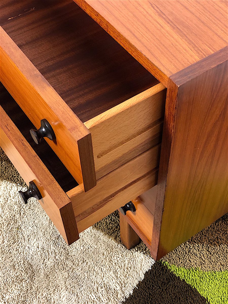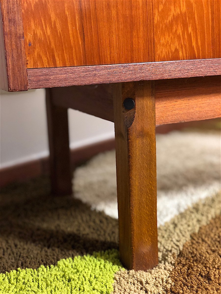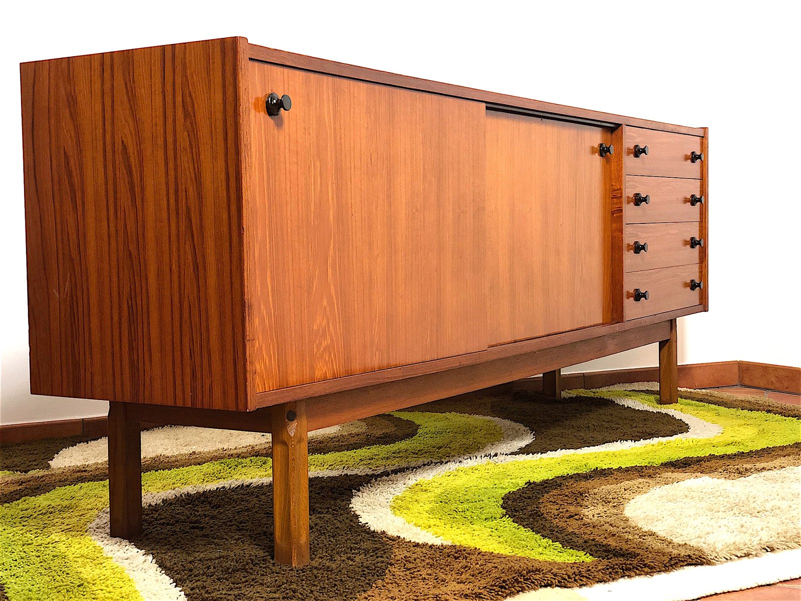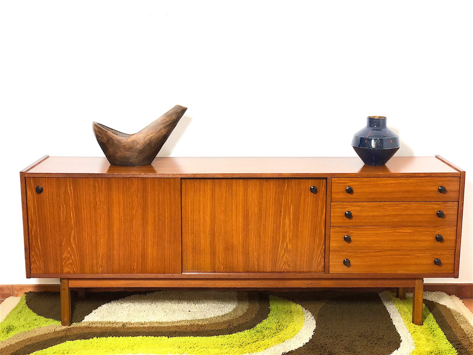 Vintage Sideboard cabinet from the 1960s, made in Mid Century Modern style and inspired by Scandinavian design. This piece of furniture represents an icon of refinement and functionality, perfect for enhancing any environment. The Sideboard features a wooden structure with a warm tone, emphasized by natural grain. Made of solid wood with Teak veneer, it has 4 drawers, two doors with sliding doors with relative internal shelf. Completely restored and sanitized. EXCELLENT CONDITIONS Measurements: Height 78 cm - Length 205 cm - Depth 43 cm