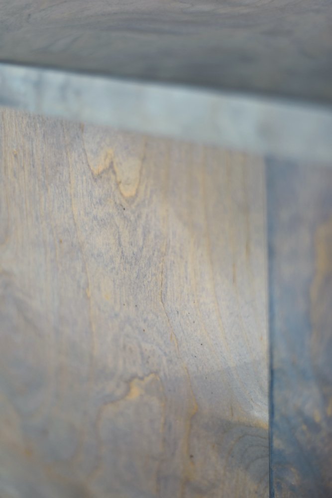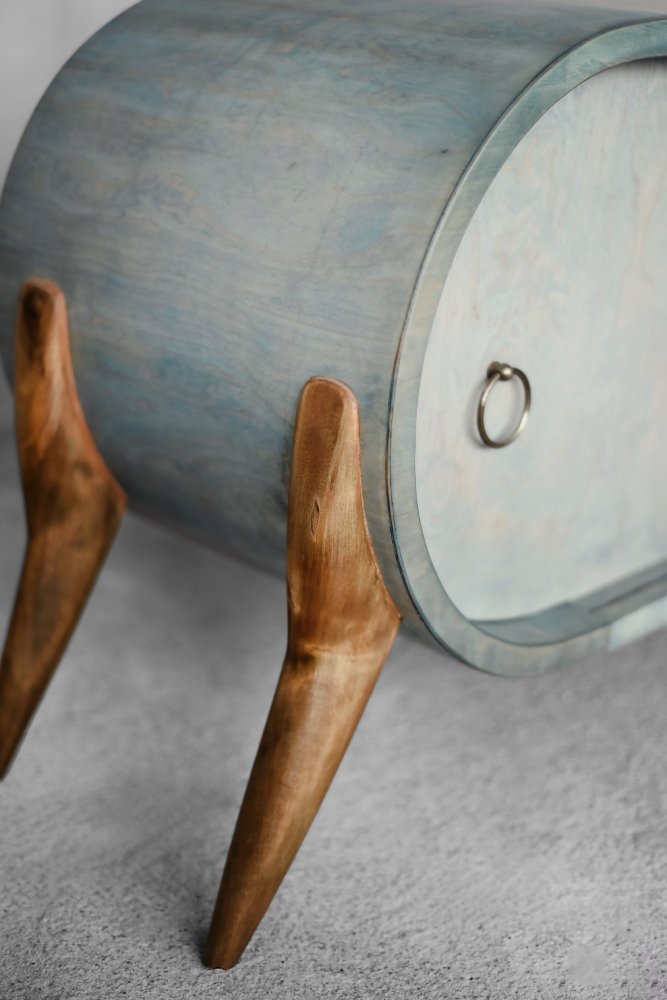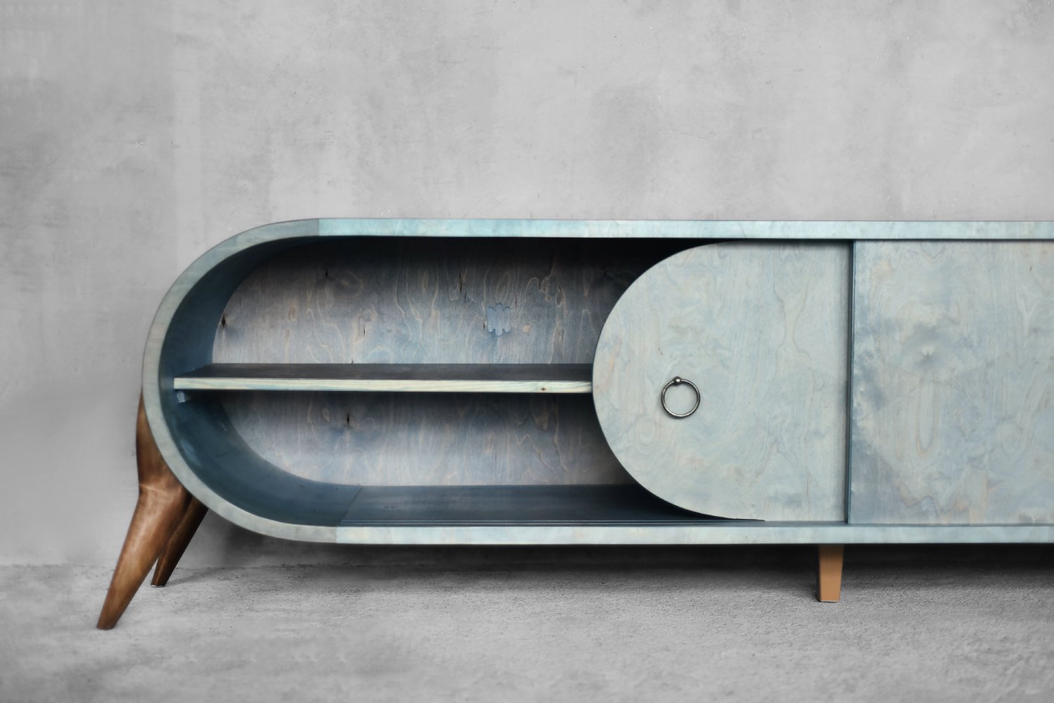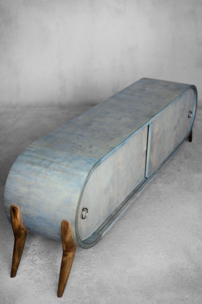 Si tratta di una rarissima credenza modernista. Probabilmente prodotta in un solo esemplare. Si rifà fortemente alle opere italiane degli anni '60. È stata realizzata in legno di betulla di alta qualità, tinto nei toni del turchese e del blu. Il motivo è sorprendente perché dà l'impressione di tridimensionalità e cambia a seconda dell'angolo di luce. Le venature naturali e ricche del legno sono permeate da rombi che emergono e scompaiono. Se li guardiamo frontalmente, sono praticamente invisibili, ma se li guardiamo da un'angolazione, diventano chiari e corrispondono magnificamente al design complessivo del mobile. La parte anteriore, decorata in modo attraente, è costituita da una coppia di ante scorrevoli. All'interno si trovano un ripiano e uno spazio. Le grandi maniglie geometriche sono in metallo. La forma arrotondata completa il look modernista. La base è costituita da gambe intagliate, la cui forma si adatta perfettamente all'intera composizione. Il mobile ha un aspetto leggero e discreto. La forma originale combinata con lo straordinario colore del legno utilizzato porterà armonia e ordine negli interni. La credenza troverà posto con successo in molti spazi. Può essere combinata con altri stili per creare composizioni eclettiche.