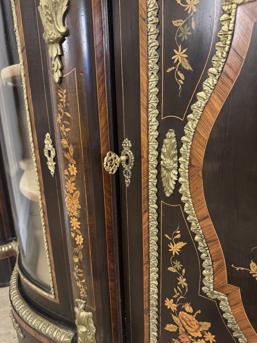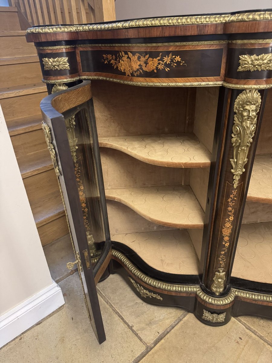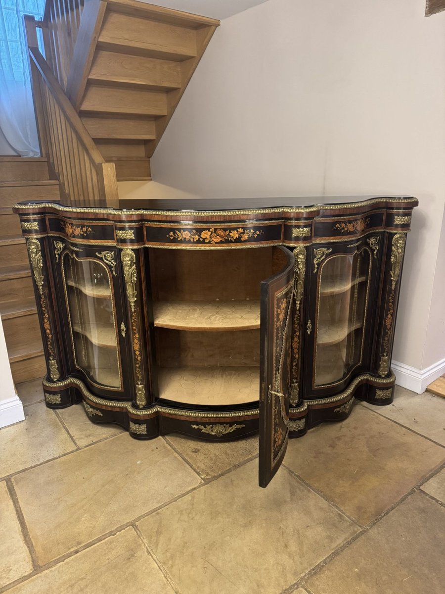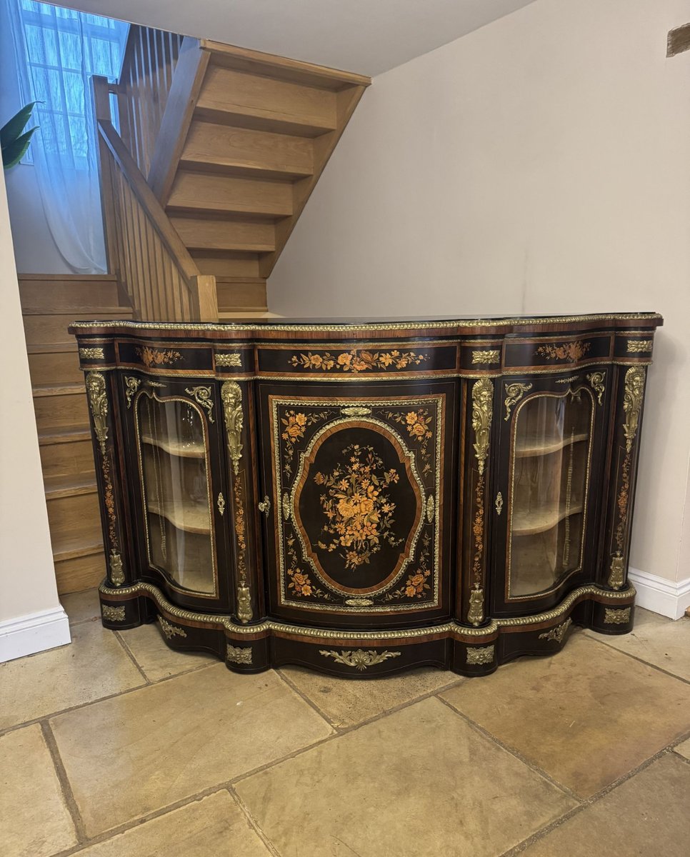 Fantastic quality antique Victorian serpentine fronted marquetry credenza heavily detailed with marquetry inlay detail, having a centre panelled door with an eye catching centre burst of floral motifs cased within a brass shaped border opening to reveal beige fitted interior and two shelves, flanked on either side by a glazed display doors enclosing fitted interior with two shelves, raised on a shaped base.