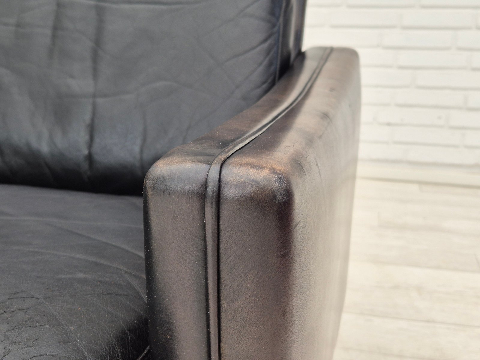 Divano a tre posti in pelle e legno di teak, Danimarca, anni '70