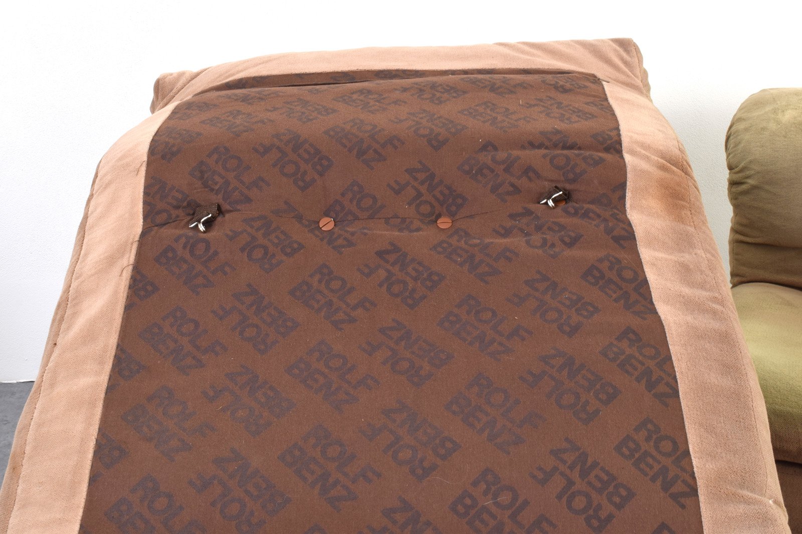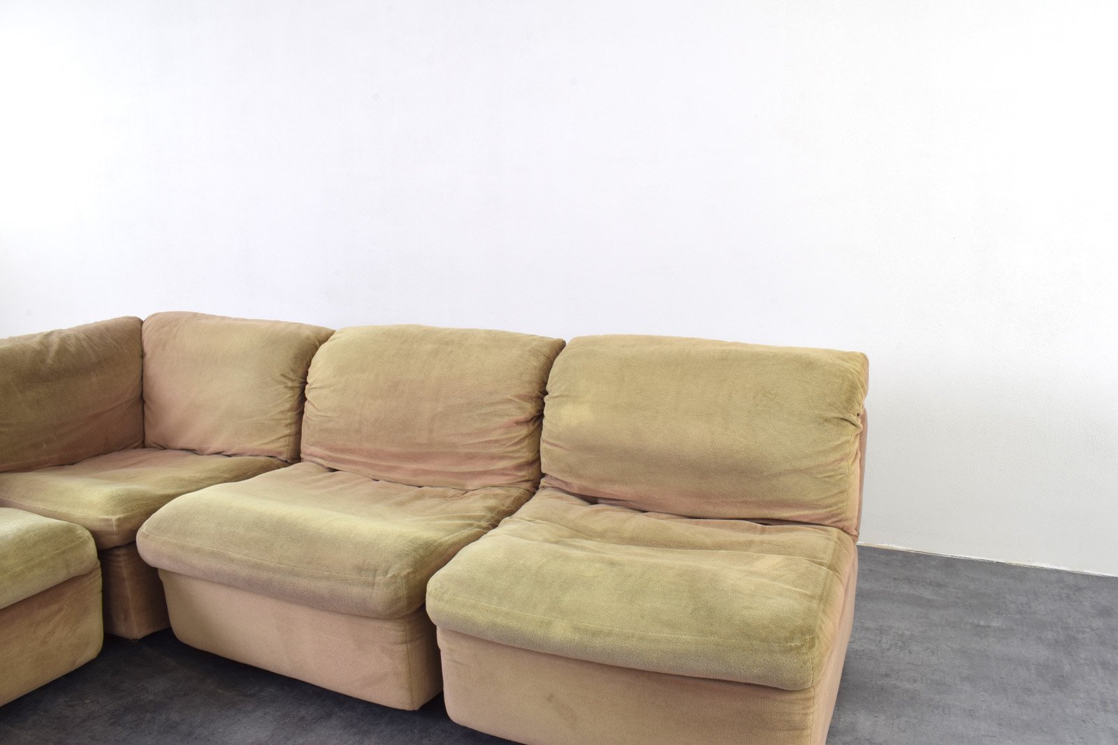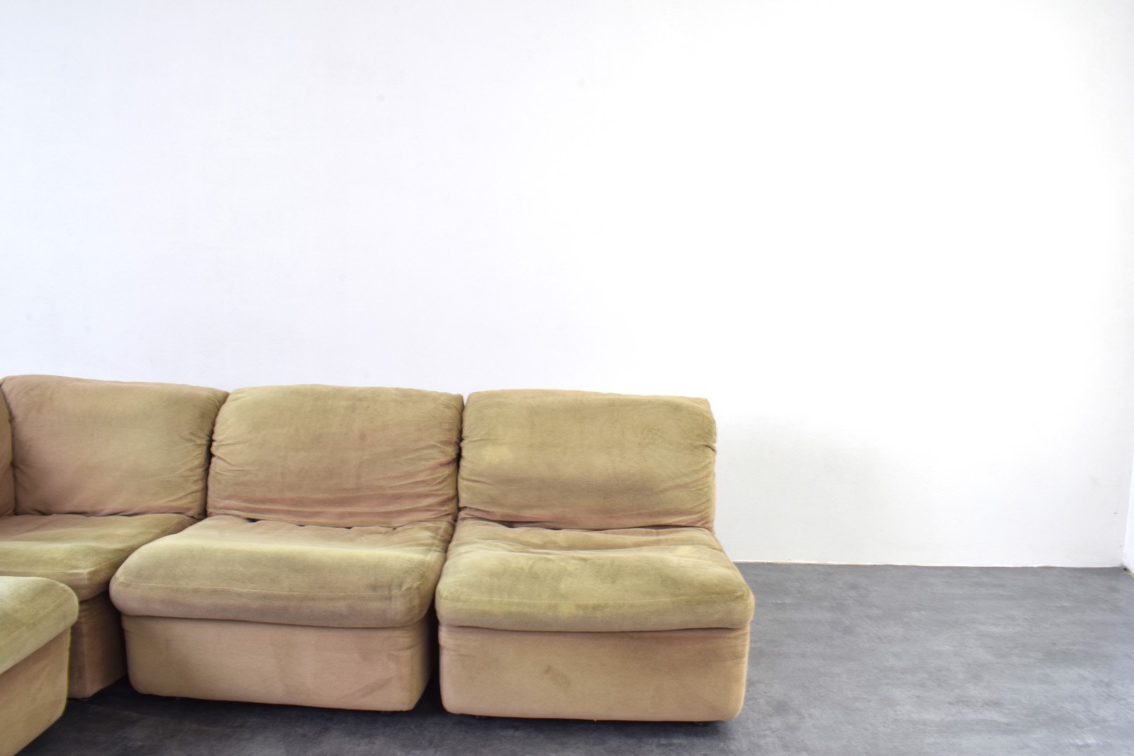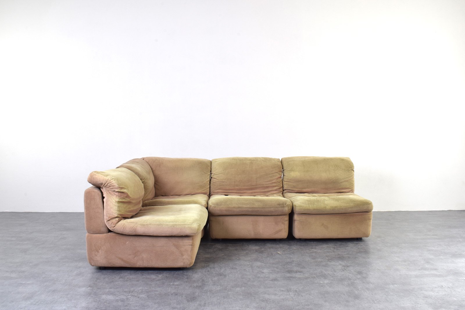 Questo divano modulare di colore verde-beige è stato prodotto in Germania negli anni '70 da Rolf Benz. Il divano è in buone condizioni originali, con segni dell'età, tra cui un colore più chiaro dei cuscini e di altre parti dovuto all'esposizione alla luce solare. Il divano è composto da quattro sezioni, di cui una angolare, che consentono configurazioni flessibili. Le sezioni sono collegate tramite speciali connettori situati sotto ogni sezione.
