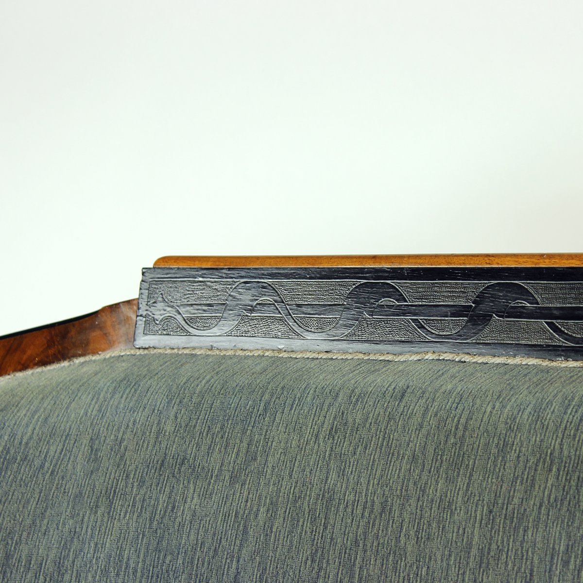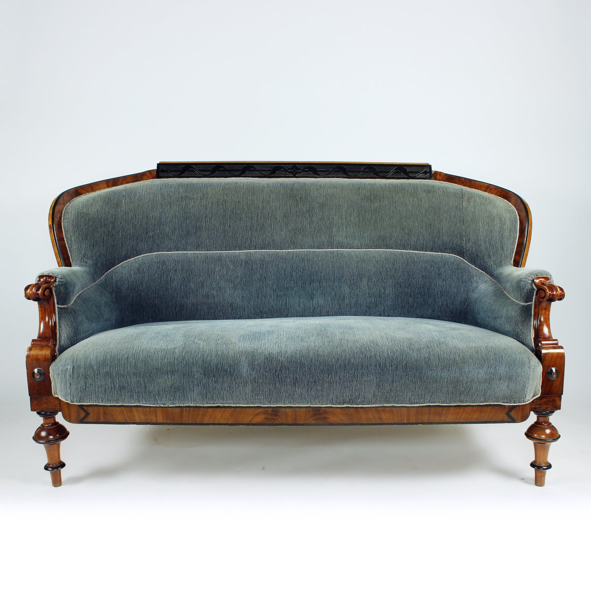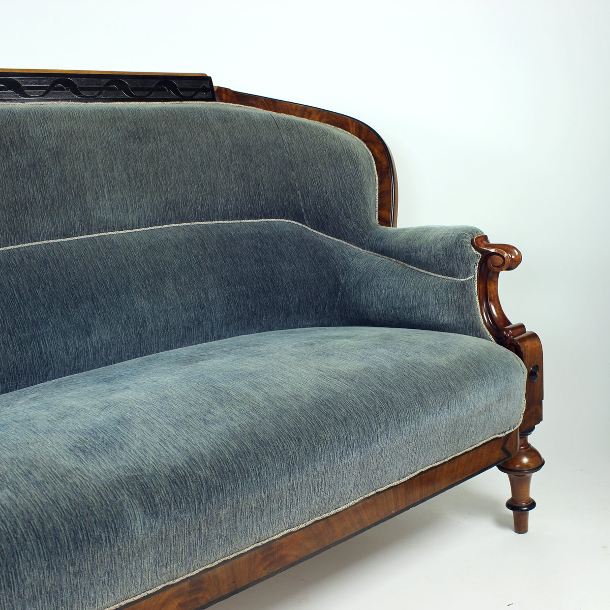 An outstanding example of early 19th-century craftsmanship, this original Biedermeier sofa was produced in Vienna, Austria in 1825. Elegantly proportioned and richly detailed, the piece embodies the refined simplicity and understated luxury of the Biedermeier period. The sofa retains its original grey-blue velvet upholstery, complemented on the back side by the period linen fabric. The seat is constructed with quality spring seat, offering both comfort and durability. The springs are in very good condition. Exquisite hand-carved details on the legs showcase the superior carpentry and timeless artistry characteristic of Viennese Biedermeier furniture.