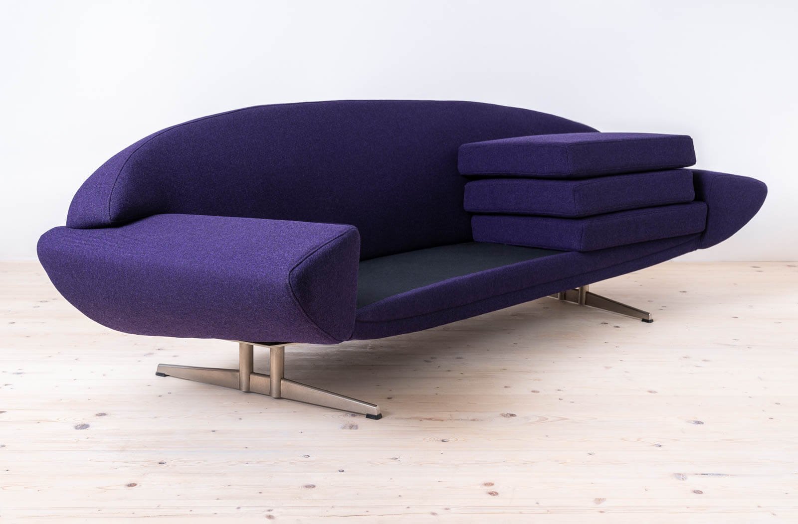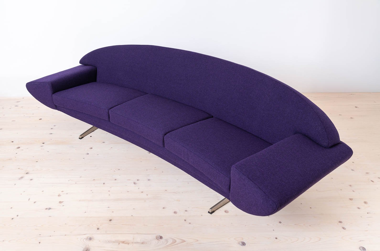 Questo divano è stato prodotto dalla AB Trensums Fåtöljfabrik di Svezia intorno agli anni 1950/1960 su disegno di Johannes Andersen. Come la maggior parte dei mobili provenienti dalla Scandinavia, è stato realizzato con grande cura e precisione, che abbiamo potuto osservare durante il processo di restauro. Un design estremamente interessante e una bella linea a forma di boomerang, ancora oggi fresca e affascinante. Il divano è stato sottoposto a un profondo rinnovamento dei rivestimenti, i sedili sono stati completamente sostituiti e il nuovo tessuto di rivestimento proviene dal marchio danese KVADRAT. Il tessuto che abbiamo utilizzato in questo particolare progetto è "Tonica2" in viola intenso melange. "Tonica2" è uno dei classici e dei best seller di Kvadrat. Il tessuto utilizzato all'interno è lino nero combinato con cotone. I mobili poggiano su una solida struttura metallica che garantisce un'elevata stabilità e un ottimo aspetto. La serie "Capri" è una delle firme di Johannes Andersen, ben nota e apprezzata nella storia del design.