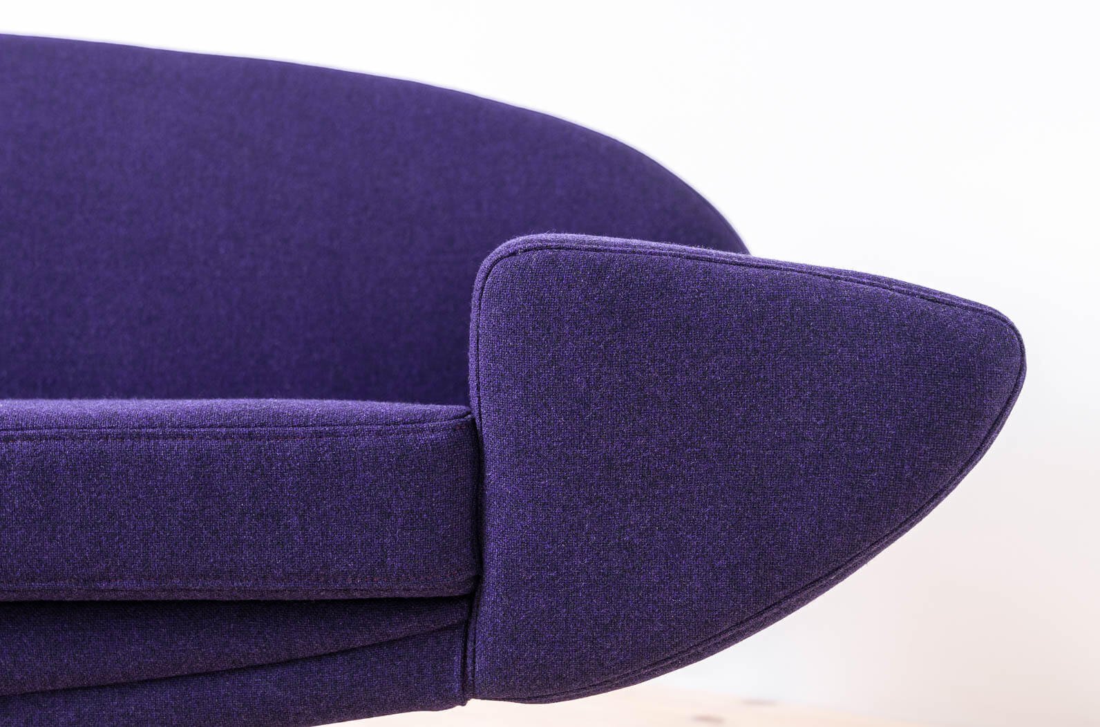 This sofa was produced by AB Trensums Fåtöljfabrik from Sweden around 1950s/1960s according Johannes Andersen design. Like most furniture from Scandinavia, it was made with great care and accuracy, which we could observe throughout the renovation process. Extremely interesting design and beautiful line in boomerang shape, that’s still fresh and enchanting nowadays. The sofa has undergone a thorough upholstery renovation, the seats have been completely replaced and the new upholstery fabric comes from Danish brand KVADRAT. The textile we have used in this particular project is „Tonica2” in deep purple melange. „Tonica2” is one of Kvadrat’s all times classics and best sellers. The fabric used on the inside is black linen combined with cotton. The furniture is set on a solid metal frame that provides high stability and looks great. The„Capri” series is one of Johannes Andersen’s signature designs, well know and appreciated in design history.