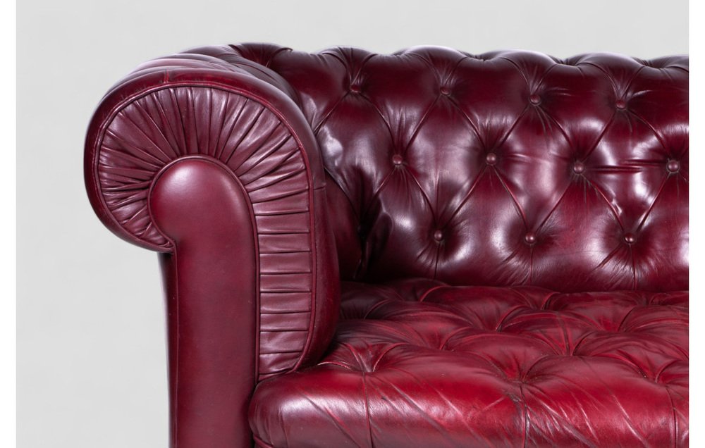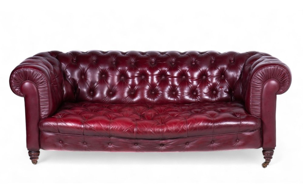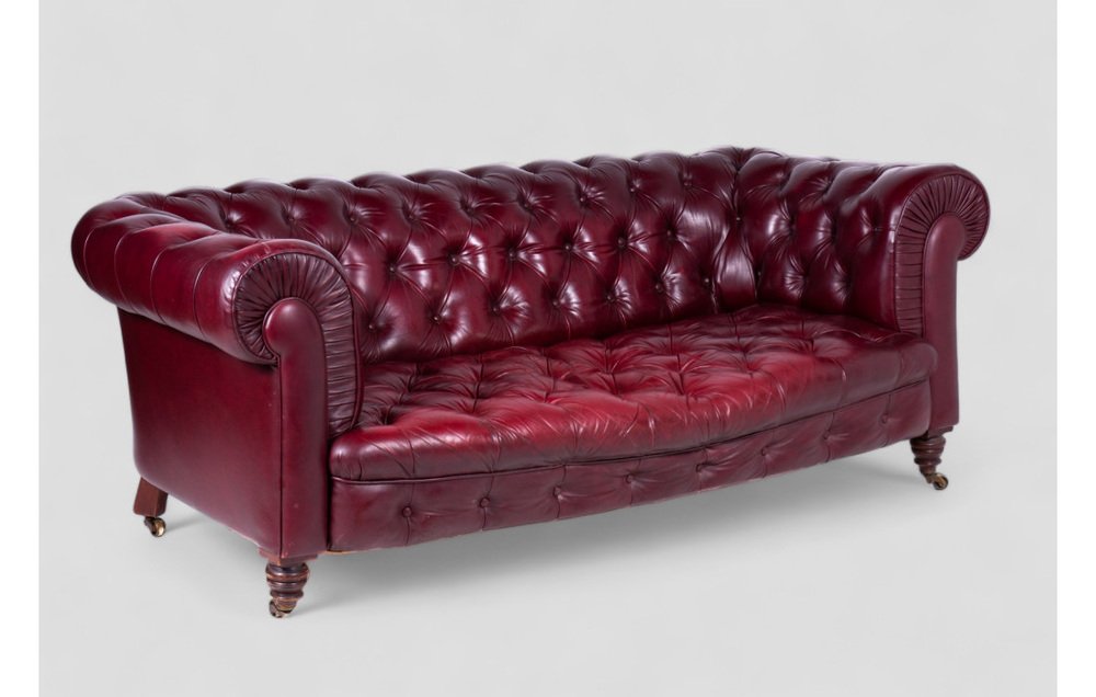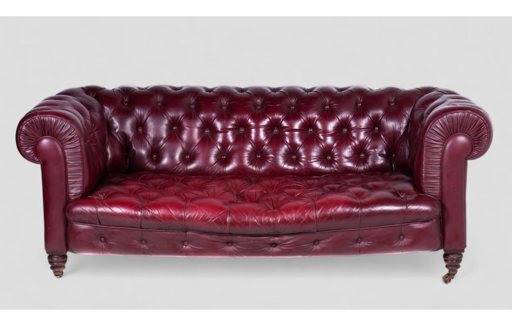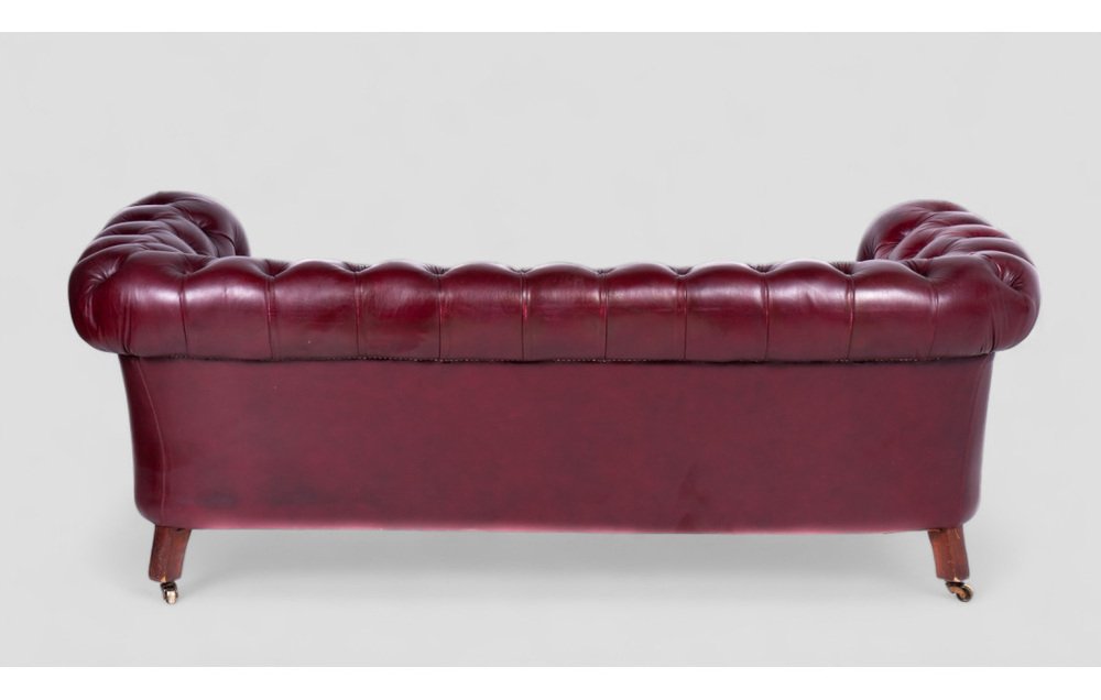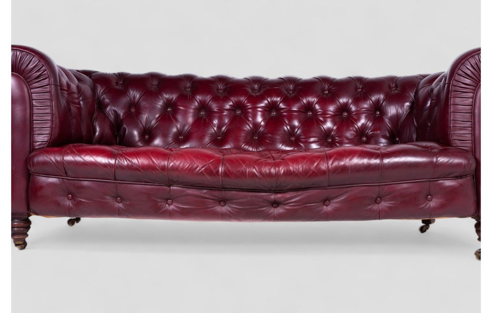 This refined Victorian Chesterfield sofa from the late 19th century is a timeless example of classic elegance. Crafted from soft bordeaux leather, it exudes a sophisticated charm, making it perfect for rooms that call for a luxurious and refined style. with a width of 200 cm and a depth of 100 cm, it comfortably seats three people, enhanced by traditional horsehair padding for comfort and durability. The solid wood legs are fitted with brass castor wheels, making it easy to move while adding an extra touch of prestige. The sofa retains all original components, and small signs of wear speak to its authenticity and historical character. An unmissable opportunity for antique enthusiasts and lovers of classic design.
