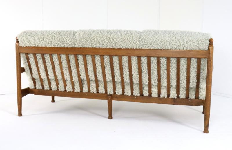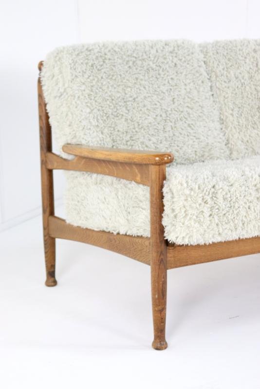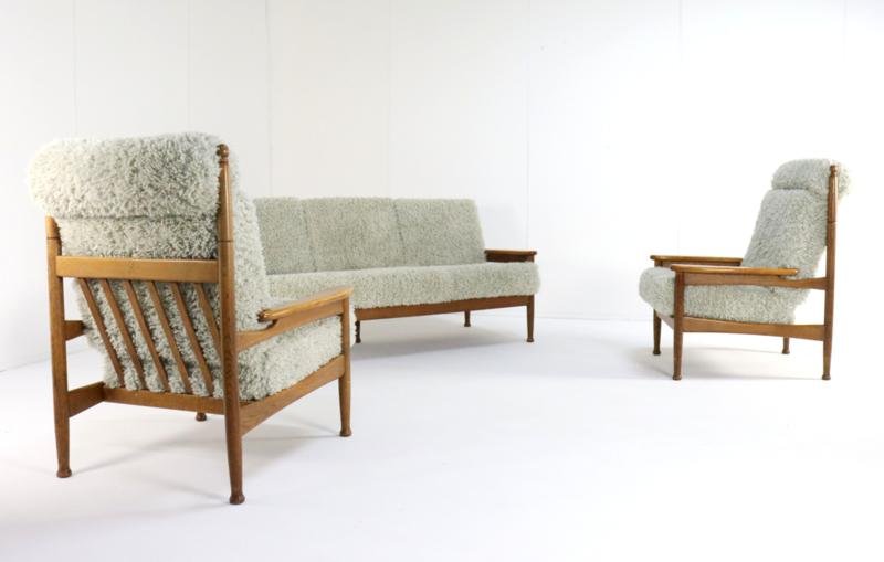 An exclusive seating group, unique in the world! Discover the perfect combination of vintage design and modern comfort with this exclusive seating group, a unique set in the world, custom made to the wishes of our stylists. This set, consisting of a three-seater sofa and two armchairs, is made of solid oak and radiates durability, warmth and timeless elegance. The mid-century design has been reupholstered with the striking fabric, type doodle, in the color "Shell" which is both stylish and very modern. Thanks to the extremely soft and long-haired fabric, this set offers an unparalleled sitting and living experience. For example, fitting perfectly in a modern, minimalist interior, this seating group is an eye-catcher that harmoniously brings functionality and aesthetics together in an unprecedented way. Get this unique and extremely exclusive set and enjoy both the timeless design and contemporary comfort. Ideal for lovers of unique, character and stylish furniture pieces who want to make a subtle but powerful statement in their interior. Don't miss this opportunity to make this one-of-a-kind seating group the centerpiece of your interior.