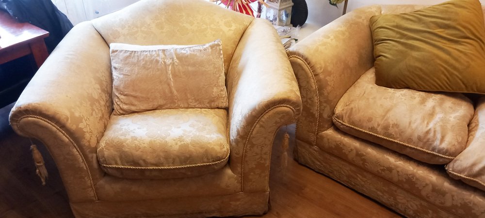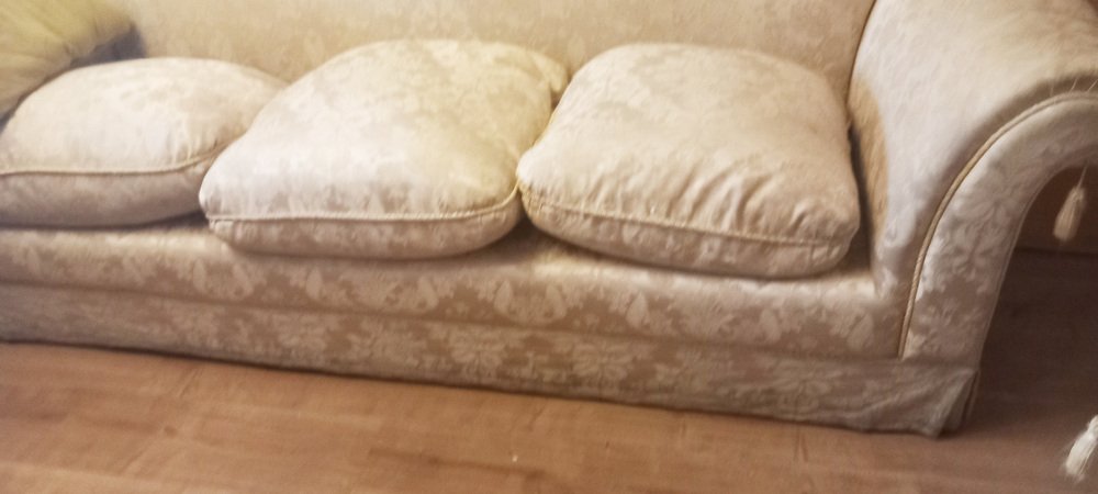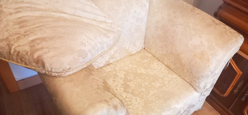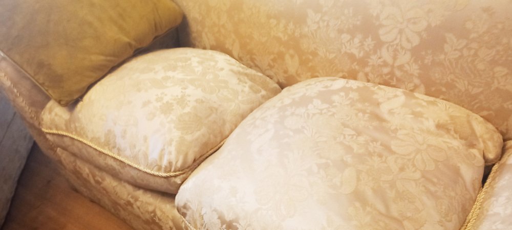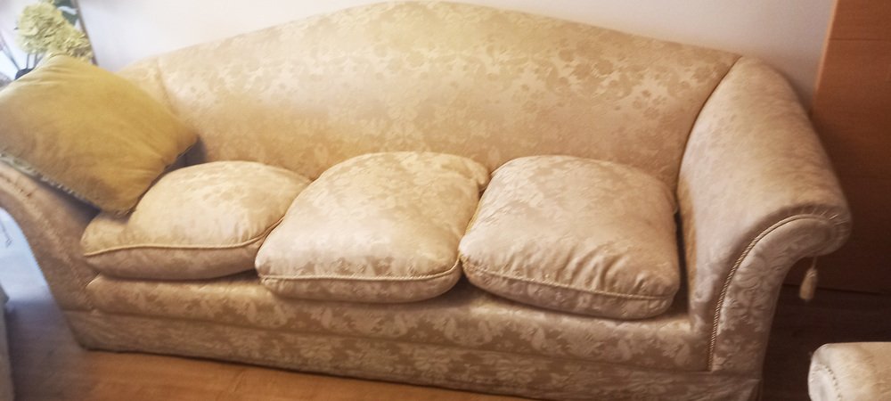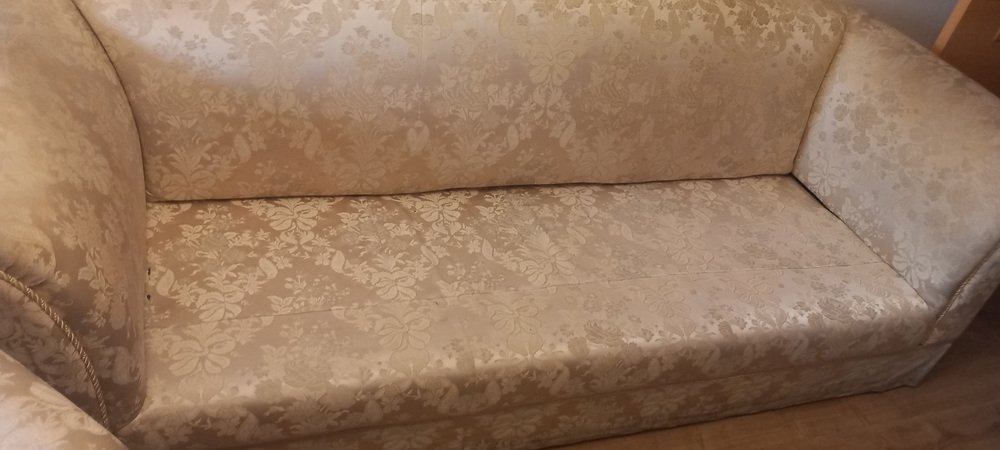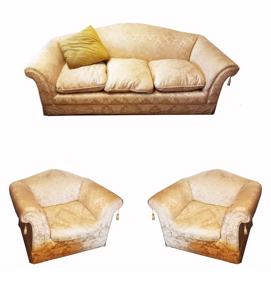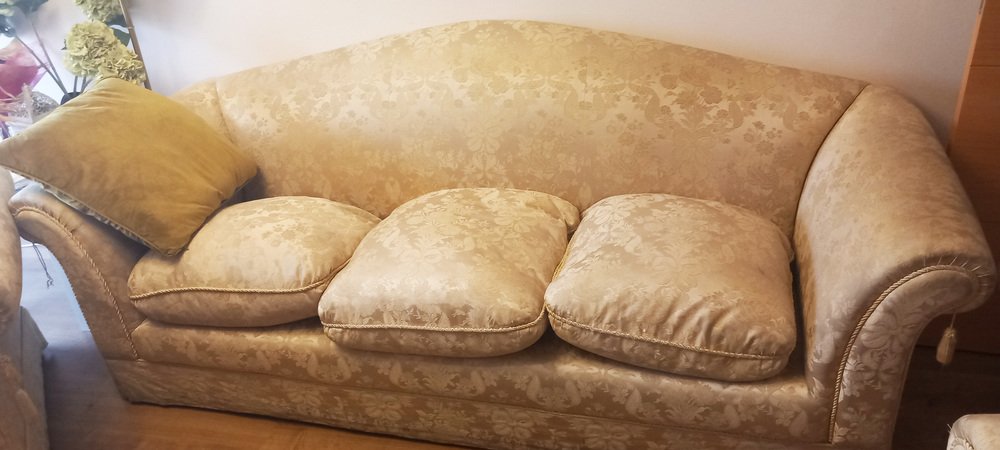 Divano e poltrone vintage in piuma e tessuto damascato, anni '70, set di 3