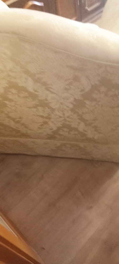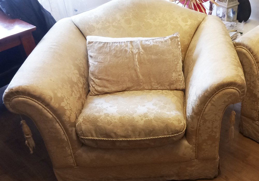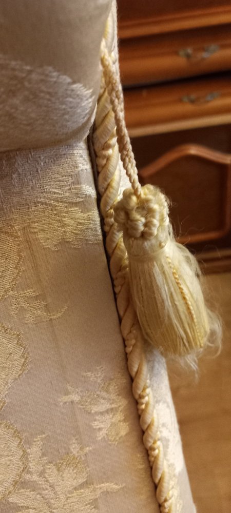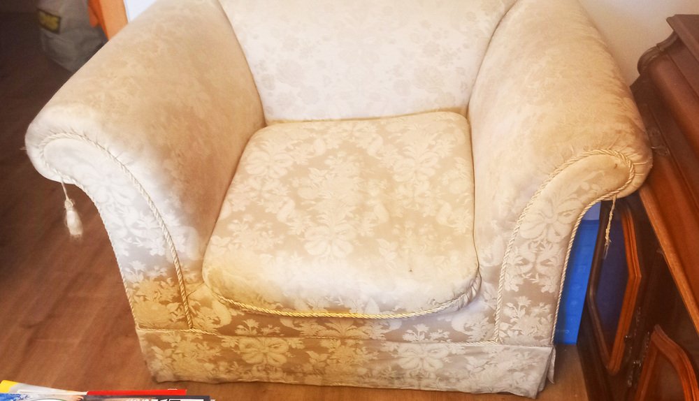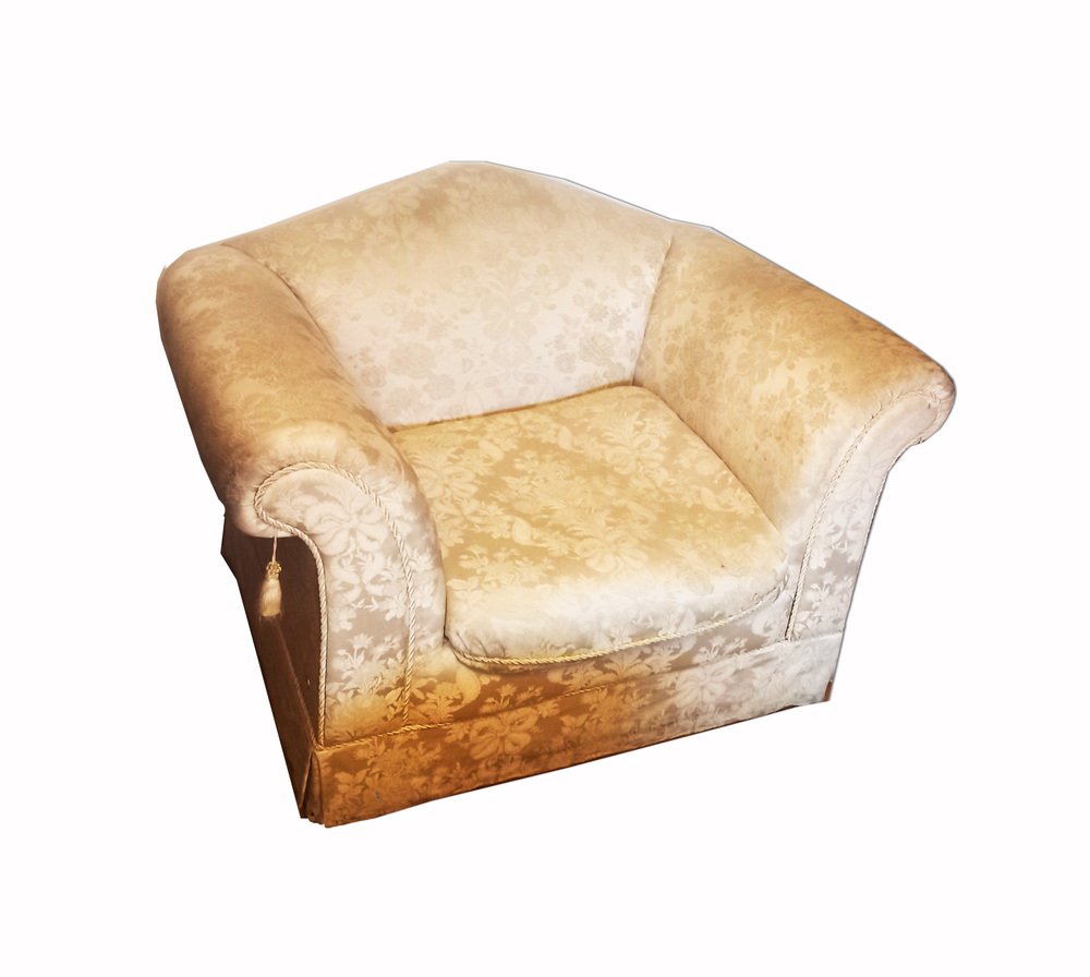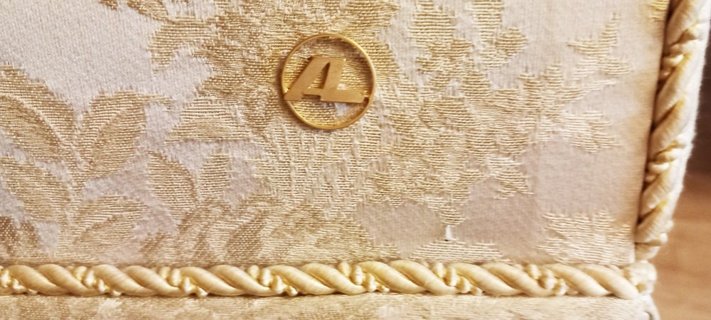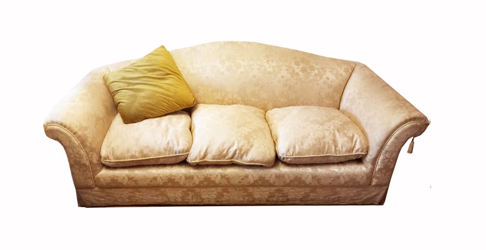 Divano e poltrone vintage in piuma e tessuto damascato, anni '70, set di 3
