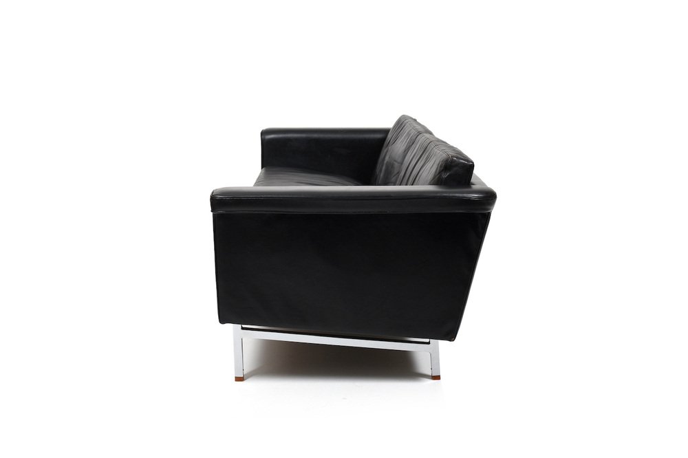 Divano grande danese in pelle con gambe cromate e terminali in teak