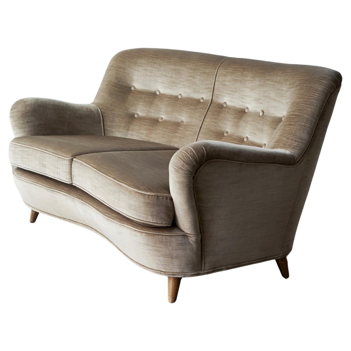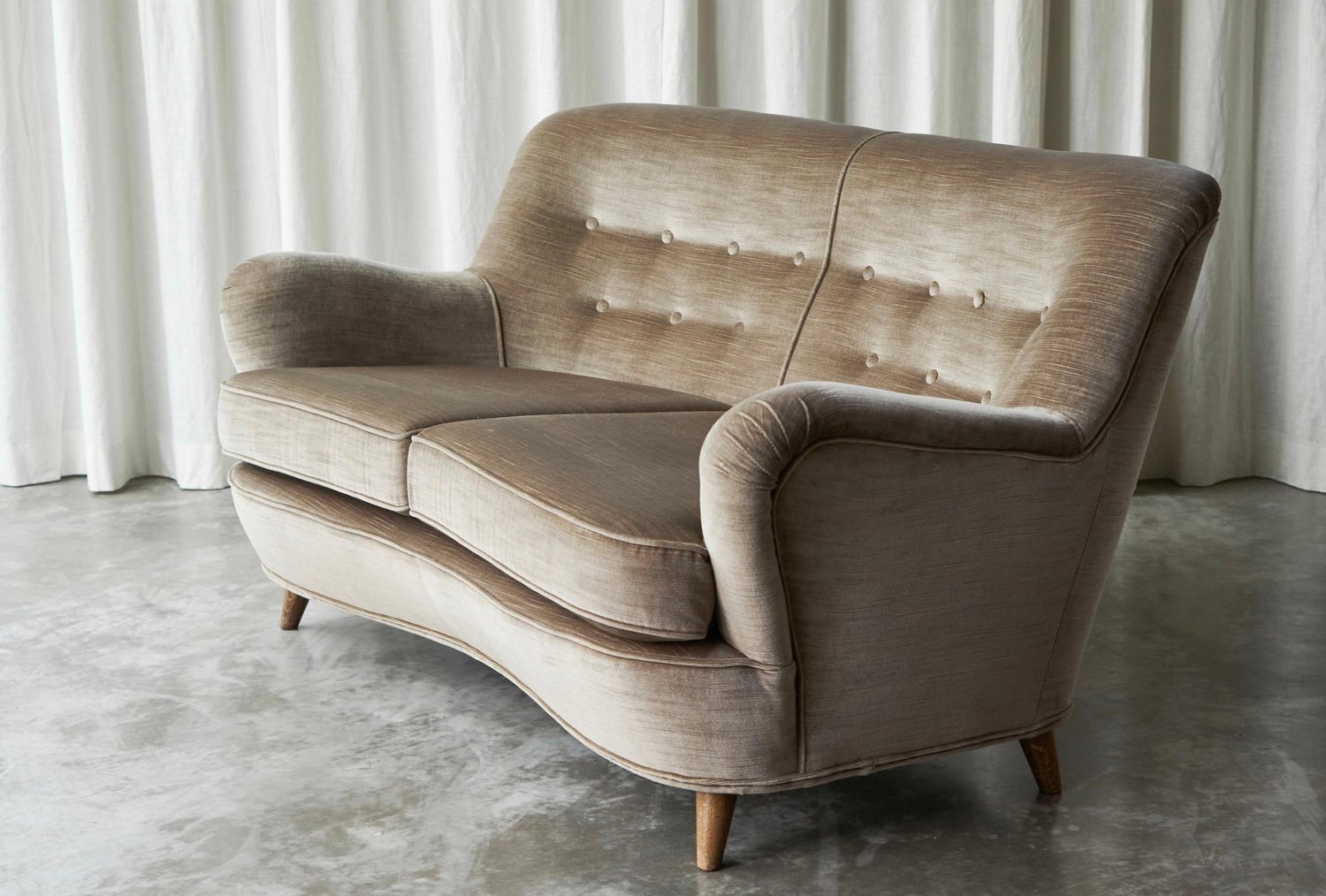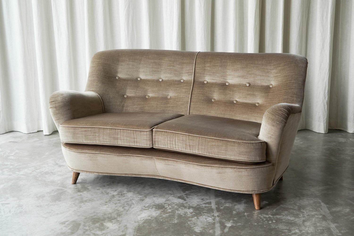 Scandinavian Modern Curved 2-seater 'Banana' Sofa in Velvet, Europe, 1960s. This curved 2-seater 'Banana' sofa, crafted in the 1960s in Scandinavia, breathes timeless elegance and charm. The gentle curvature of the sofa's silhouette is both elegant and comfortable. Upholstered in grey / green colored soft velvet, the sofa's design features clean lines and a subtle sophistication. The button-tufted backrest adds a delicate detail, enhancing its classic appeal without overwhelming the overall aesthetic. The slightly tapered wooden legs - two up front and 3 at the back - provide a sturdy foundation while maintaining the piece's light and airy feel. It comes in a honest and original vintage condition. This 'Banana' sofa has aged gracefully, with the velvet upholstery showing some signs of wear - most visible at the back of the sofa. Also one of the tufted buttons is loose, but overall this is not very visible.