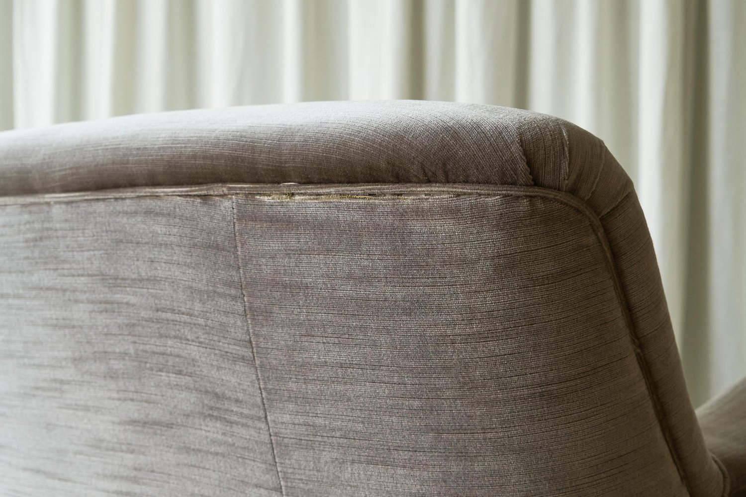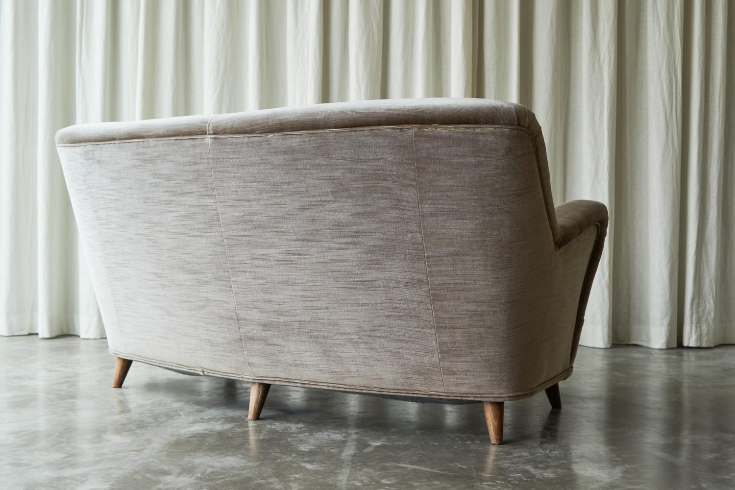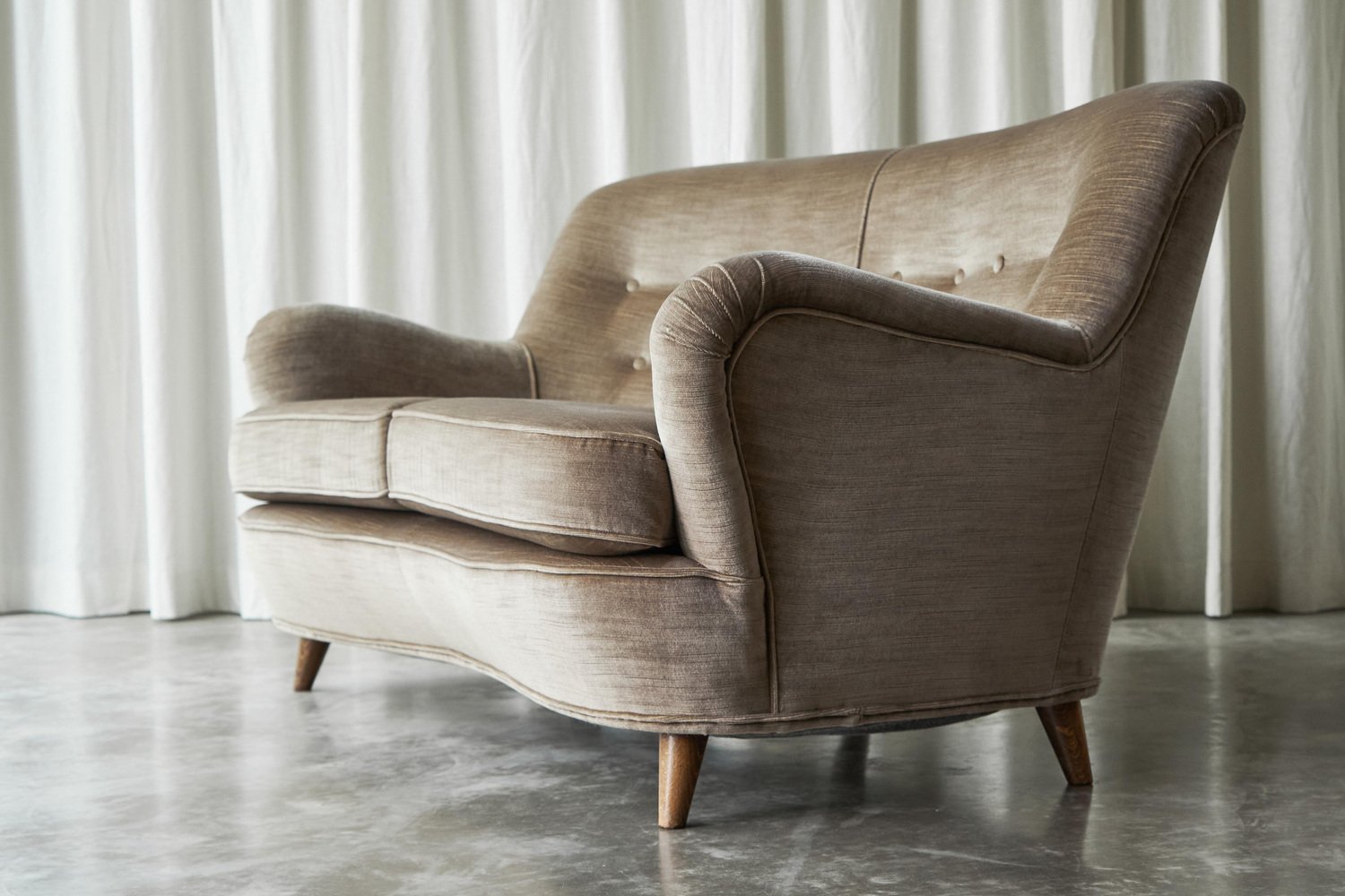 Scandinavian Modern Curved 2-seater 'Banana' Sofa in Velvet, Europe, 1960s. This curved 2-seater 'Banana' sofa, crafted in the 1960s in Scandinavia, breathes timeless elegance and charm. The gentle curvature of the sofa's silhouette is both elegant and comfortable. Upholstered in grey / green colored soft velvet, the sofa's design features clean lines and a subtle sophistication. The button-tufted backrest adds a delicate detail, enhancing its classic appeal without overwhelming the overall aesthetic. The slightly tapered wooden legs - two up front and 3 at the back - provide a sturdy foundation while maintaining the piece's light and airy feel. It comes in a honest and original vintage condition. This 'Banana' sofa has aged gracefully, with the velvet upholstery showing some signs of wear - most visible at the back of the sofa. Also one of the tufted buttons is loose, but overall this is not very visible.